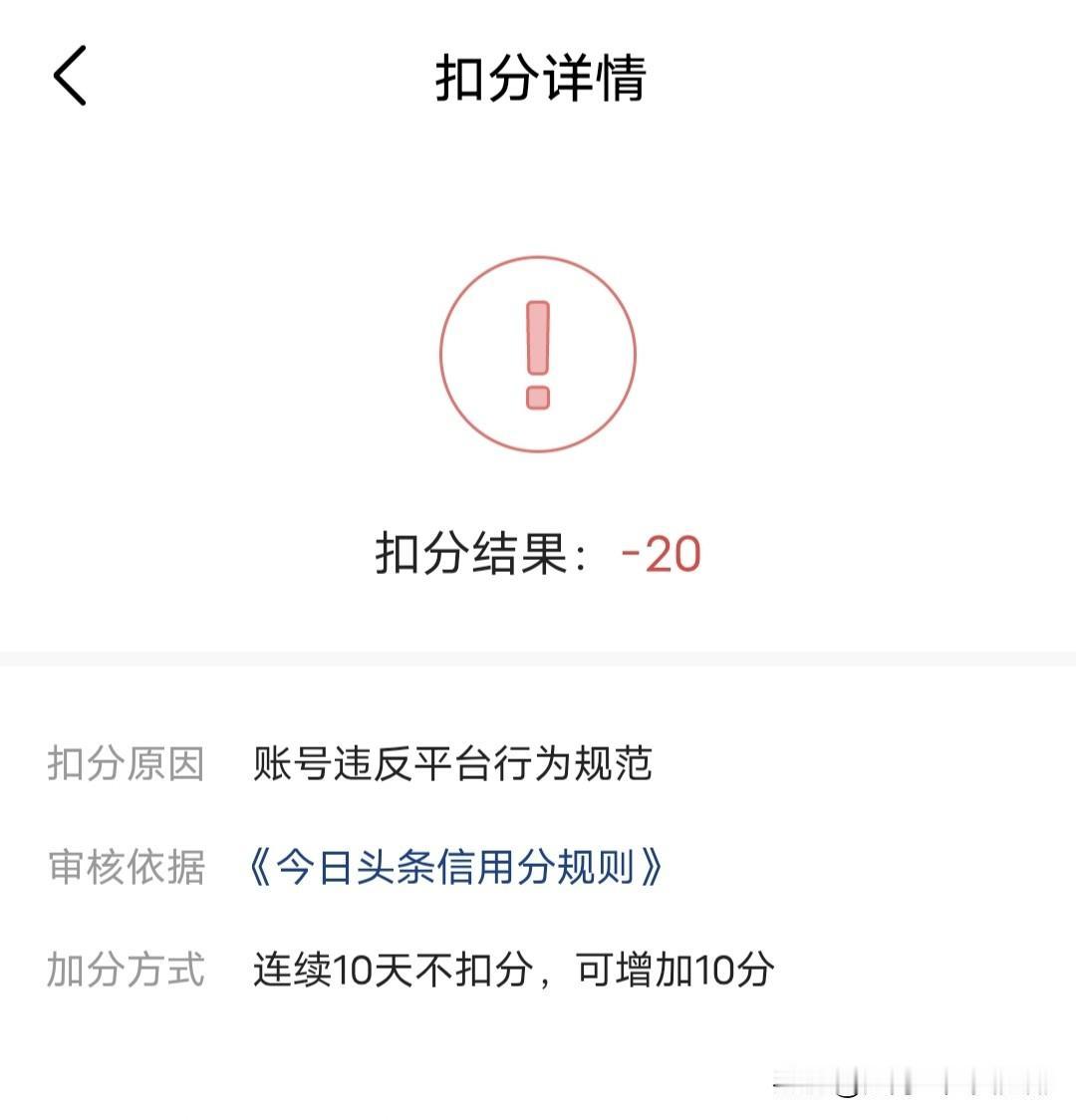 收到这个信用分扣分通知,真的吓了我一跳。一下子扣20分不说,还告诉我若再违规会受到更严厉处罚,甚至会封号。 但是问题在于现在头条没有了账号检测功能之后,具体哪篇文章违规很难判断,只能根据《社区规范》来对比判断,比如不能用博眼球图片和标题,要弘扬正能量,不能歪曲事实等等。 我突然有种感觉,现在头条号的审核机制是不是有点太严格了,这以后发文章必须小心再小心了,万一再违规一次导致账号封禁的话,就真的得不偿失了。 不过我还是想通过客服申诉和了解一下到底怎么违规的。有小伙伴有类似经历吗?帮帮我吧