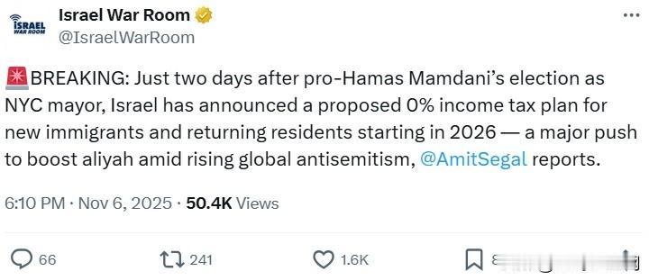 就在支持哈马斯的曼达尼当选纽约市长两天后,以色列宣布了一项提案: 从2026年起,对新移民和回国定居者实行0%所得税政策——这是一项在全球反犹主义上升背景下、旨在大力推动犹太人回归以色列的重大举措。