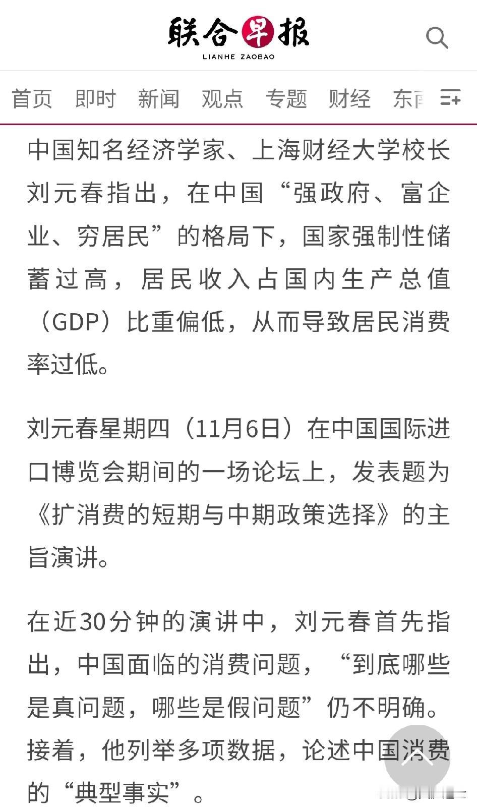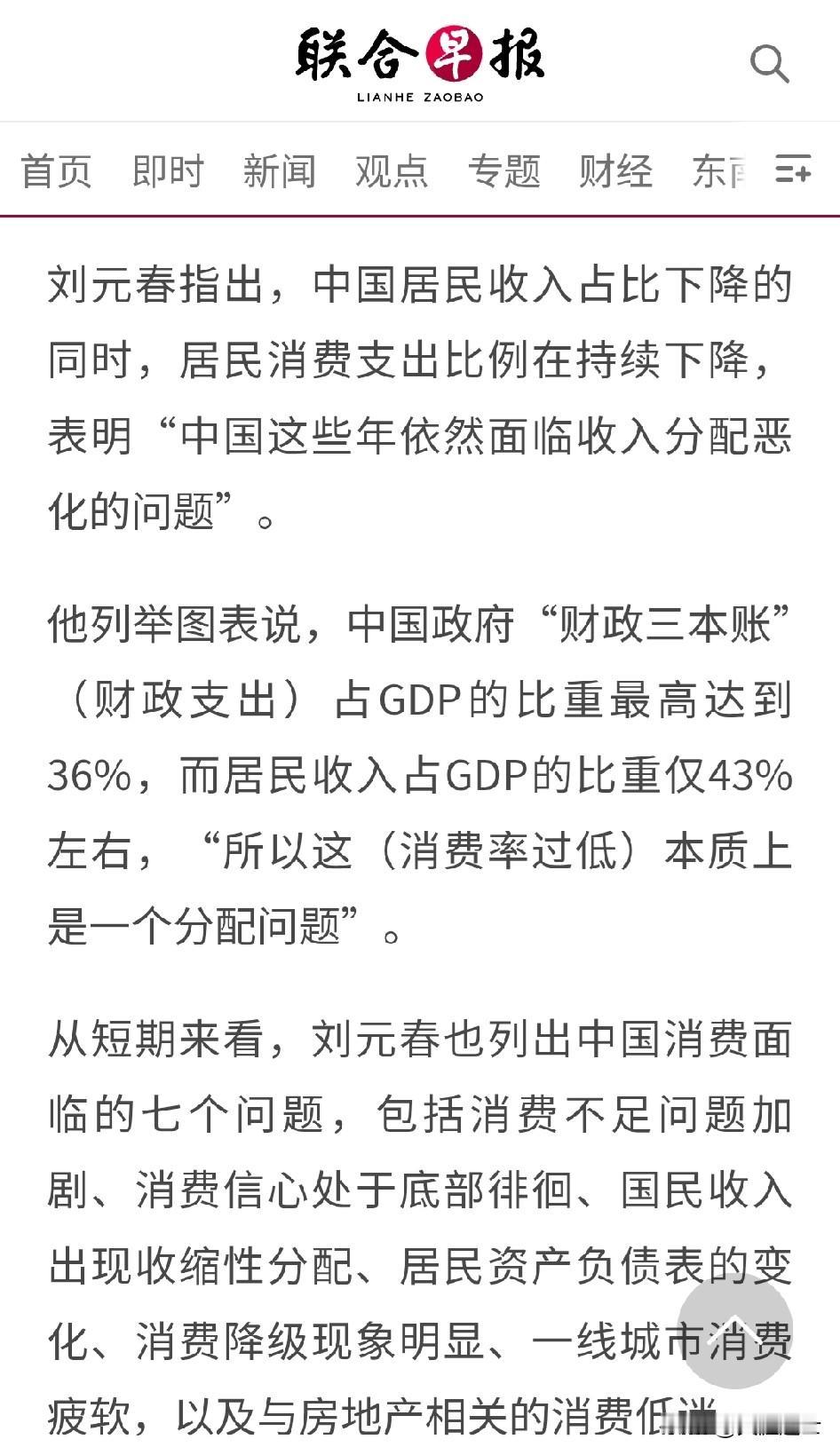 我国居民消费率过低,本质上是分配问题!这是我国知名经济学家、上海财经大学校长刘元春在第八届虹桥国际论坛上的发言。 他指出我国现在的社会格局是“强政府、富企业、穷居民”,社会储蓄过高,而居民收入占国内生产总值比重较低,进而导致居民消费过低。 他还列出我国消费层面突出的七个问题,一是消费不足问题加剧,二是消费信心长期处于底部徘徊,三是国民收入处于收缩性分配,四是居民负债资产表变化,五是消费降级明显,六是一线城市消费疲软,七是房地产相关产业行业低迷。