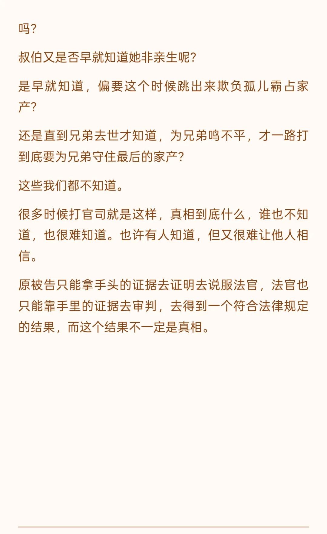 今天看到一个案例,十分唏嘘 原告又知道自己不是亲生的吗? 如果原告对自己身世并不知情,同时要处理父亲去世、自己非亲生、叔伯争遗产这些事情,也很崩溃吧。 ps:这个是人民法院案例库中的案例,虽然涉及赠与,继承等多个法律关系,但入库主要想说明的裁判要旨是 1.人民法院在审理涉及父母与子女是否具有亲子关系问题时,应当遵循未成年人利益最大化原则,依法限定提起亲子鉴定的主体资格,对于父母以外的其他人提出的亲子鉴定请求不予支持。 2.父母在自然灾害中死亡,虽然有关灾害处理形成的亲子鉴定原始材料可能客观存在,人民法院在审理中仍应考虑亲子鉴定意见对未成年人心理、身份认同及家庭关系产生的影响,在科技与人文的平衡中坚持以人为本;在已有父母子女关系合法登记的基础上,对涉及遗产继承等争议的其他人提出的以亲子鉴定意见排除父母与子女亲子关系的主张依法不予支持。 律师 法律咨询 法律 继承 亲子鉴定