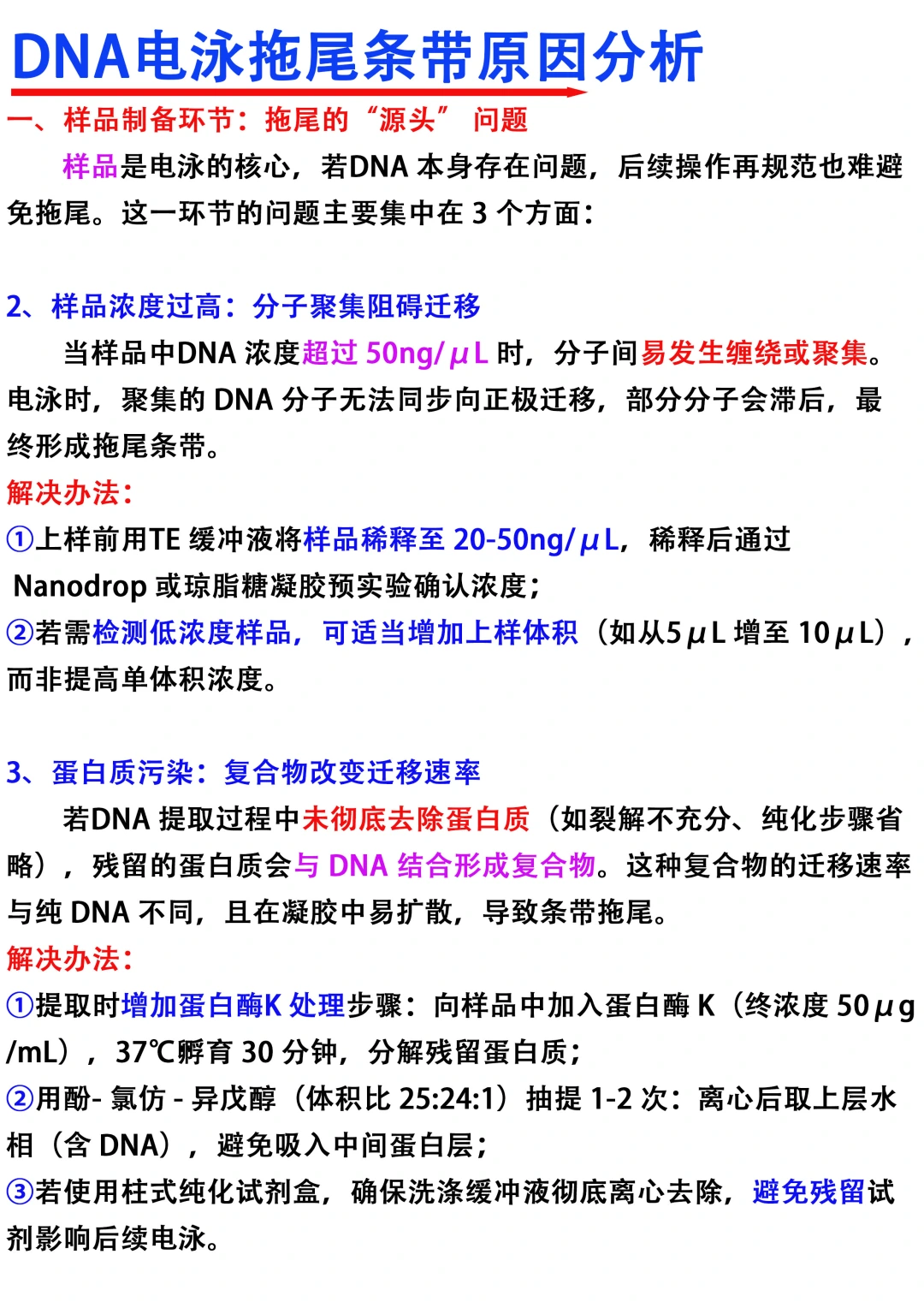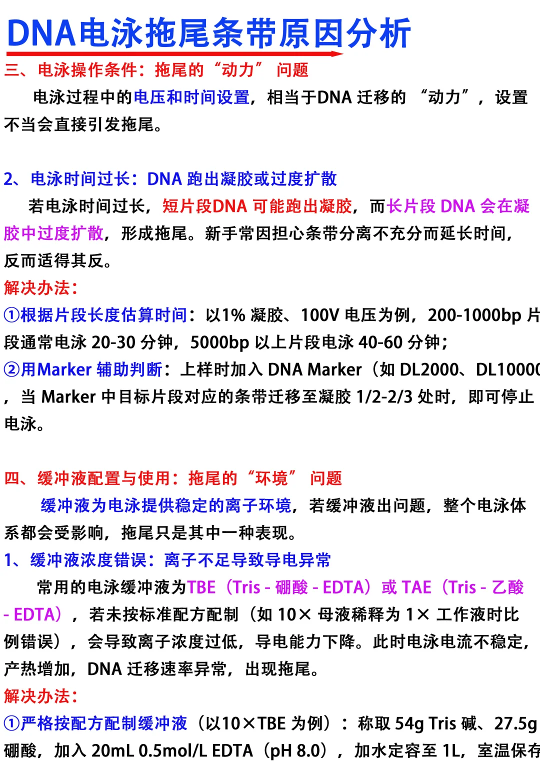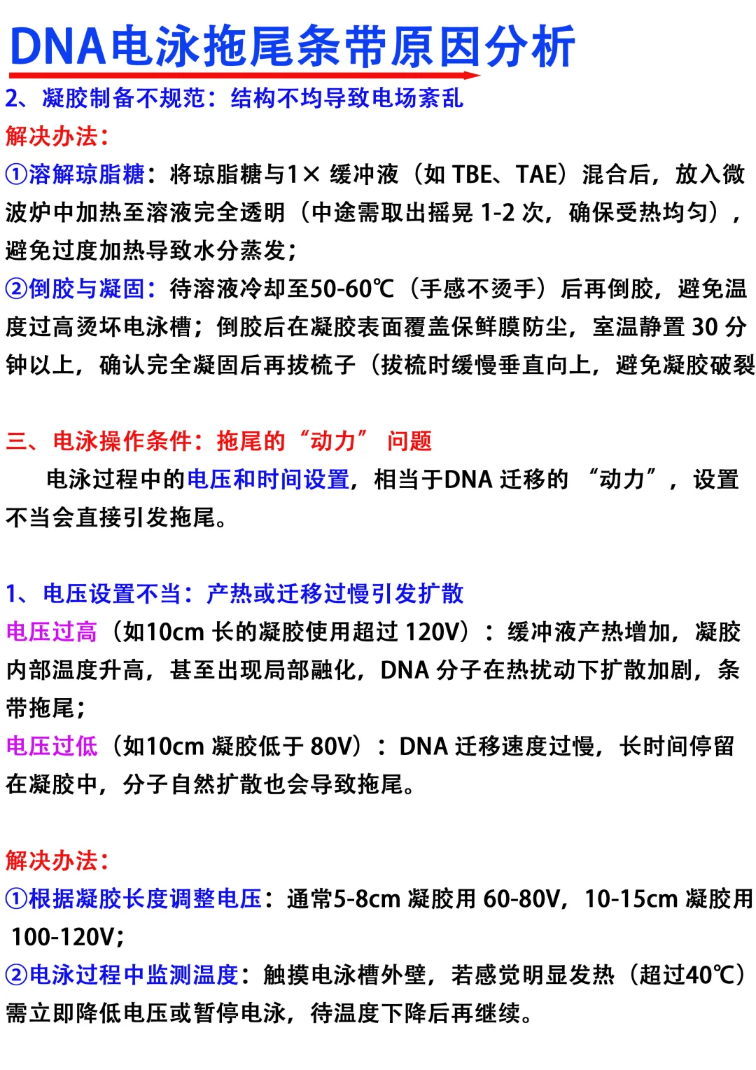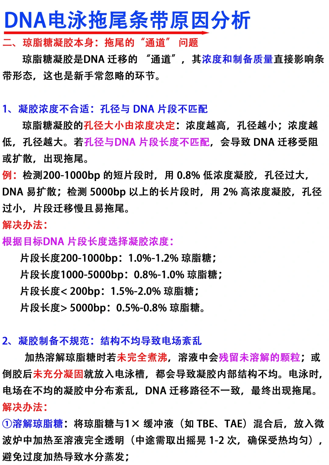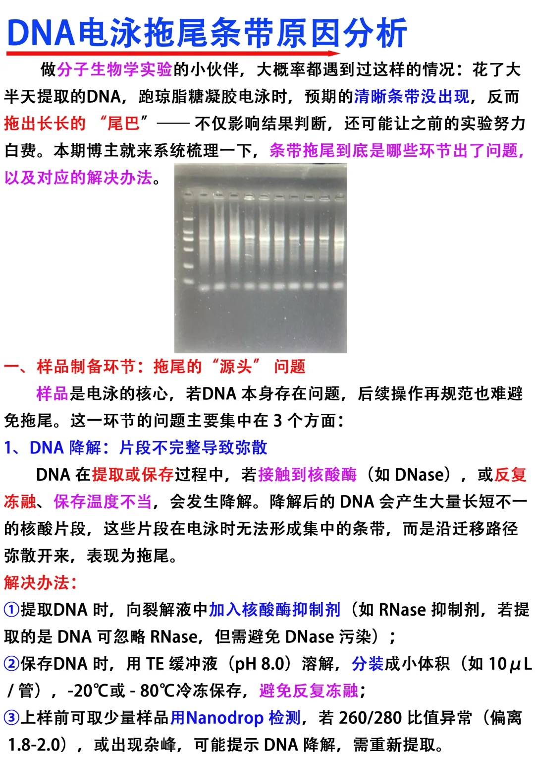 [飞吻R]Hi~大家晚上好,我是科研废物一名喜欢分享科研干货的科研博主 [种草R]今天分享的是DNA电泳拖尾条带原因分析 [向右R]主要从以下四个方面进行分享 1️⃣样品制备环节 2⃣️琼脂糖凝胶本身 3️⃣电泳c作条件 4️⃣缓冲液配置与使用 满满的干货与tips ,欢迎大家👍收藏,一起交流讨论呀 图文笔记还有人看吗[微笑R]