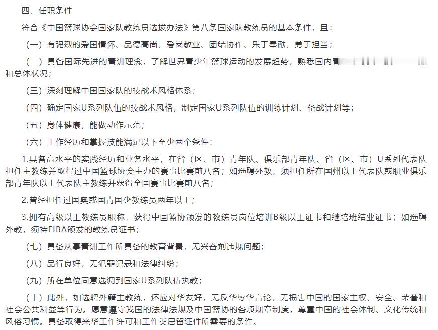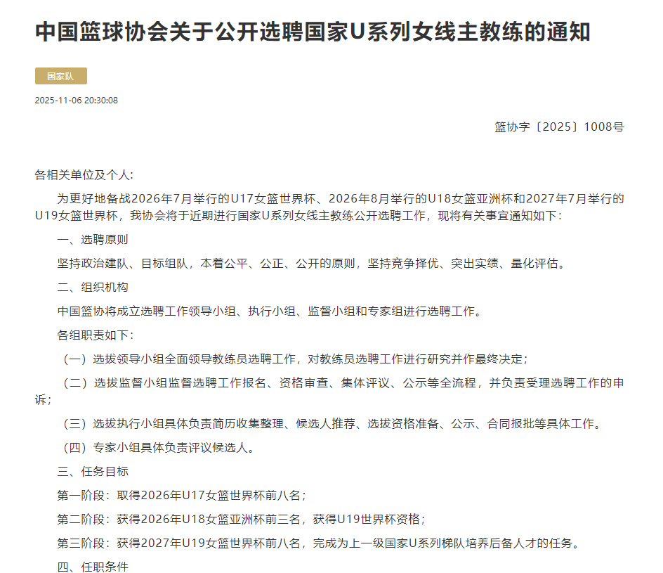 篮协公开选聘U系列女篮教练,看比赛任务,U17,U18女篮都要换主教练。