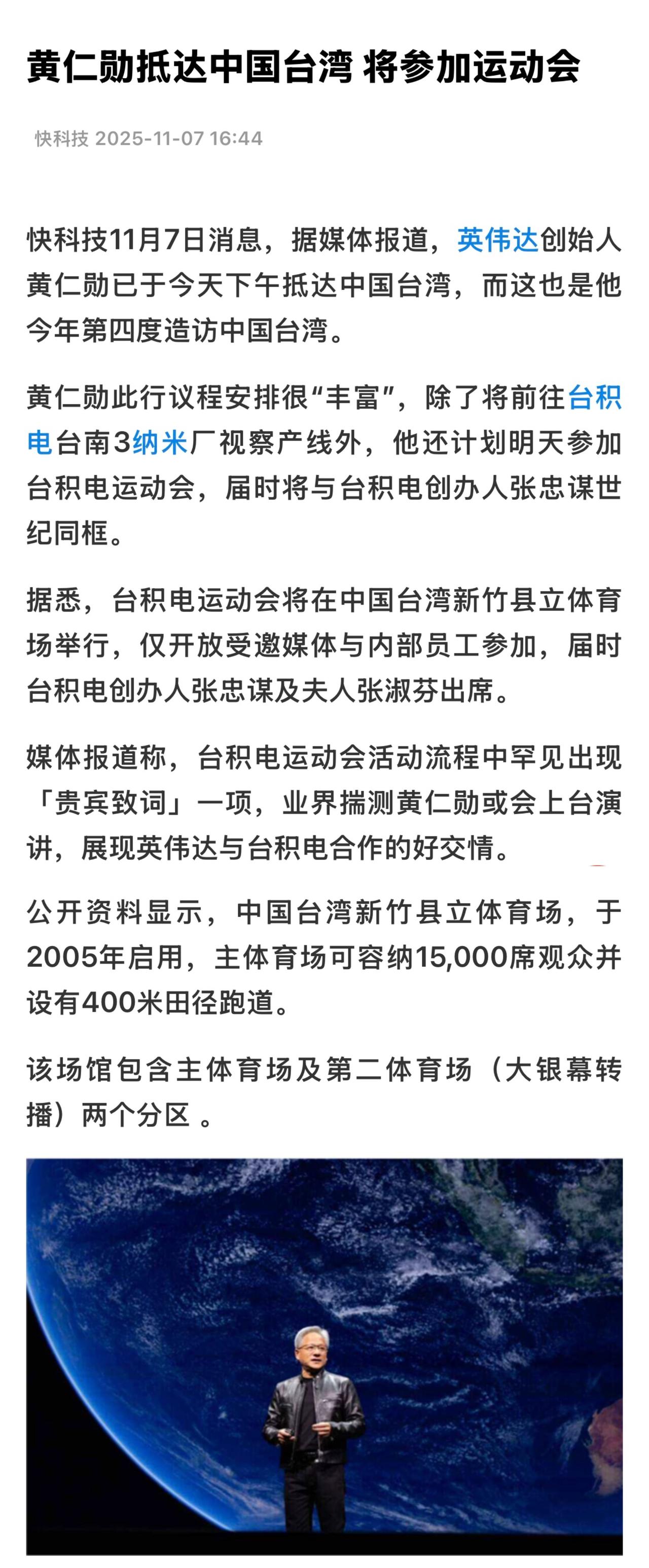 黄仁勋年内第四度访台 台北市长蒋万安6日证实,英伟达台湾总部确定在台北市北投士林科技园区(简称北士科)落脚。他希望英伟达在台北设立公司,来跟台北市政府对接签约。