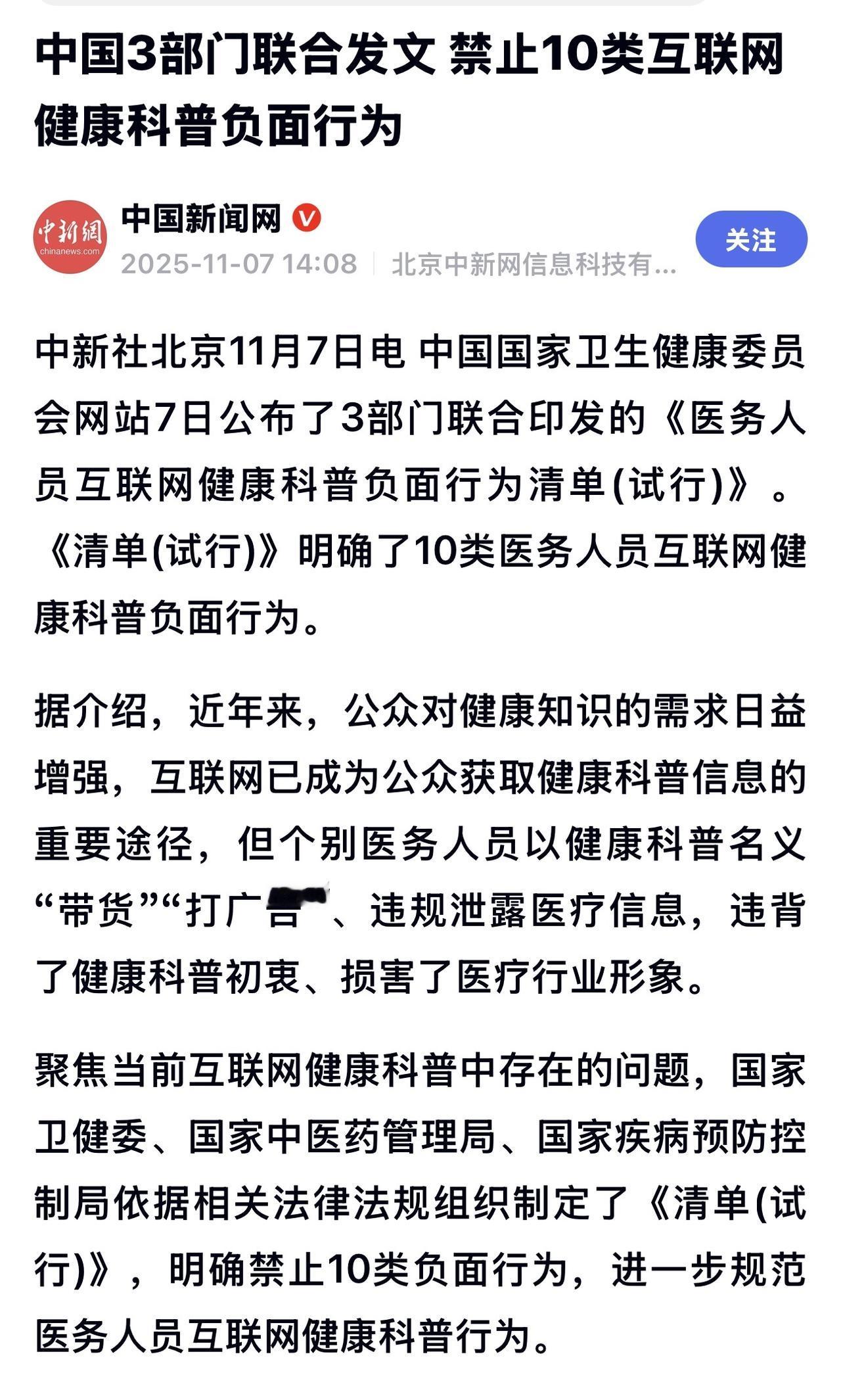 中国官方发布健康科普负面行为清单,禁止夸大病情或疗效,也不得以“神医”“神药”进