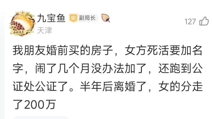 一对青年准备结婚,婚房房主只写婆婆的名字。 女方看到很不高兴,说必须要加上她的名字,否则这婚就不结了。 男子说,婚房几乎耗尽了父母的积蓄,是父母为他们成家贡献了一切,是婚前财产。他自己连名字都没有写上,怎么可能写她的名字! 两人为此事闹得不可开交。 只能说,这个男子是少有的人间清醒。 不少人在房产加上女方名字后,不久就闹离婚,财产就被分走一半。