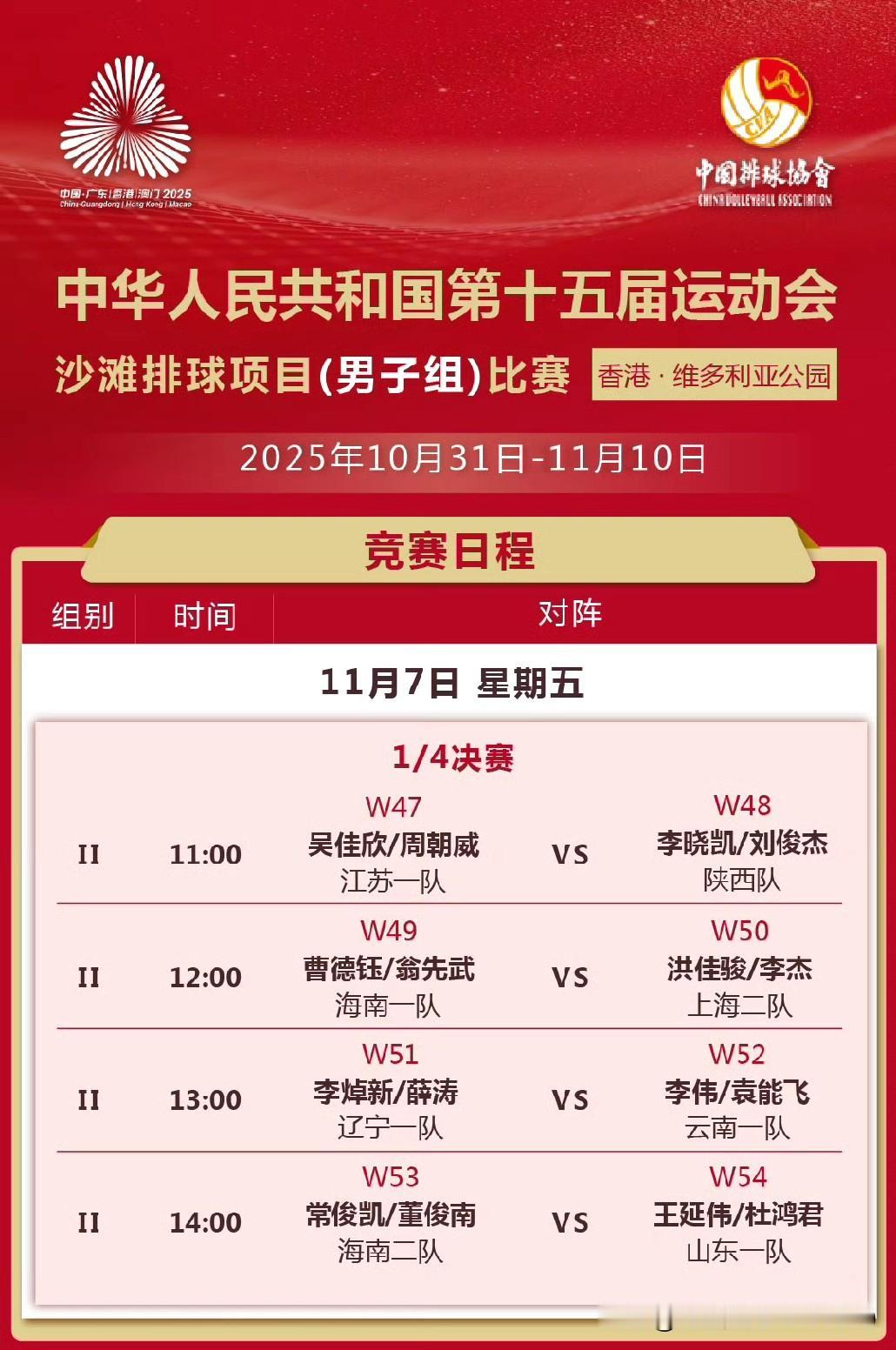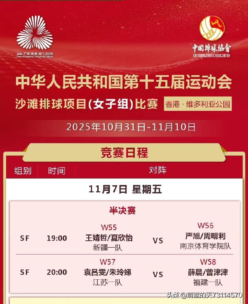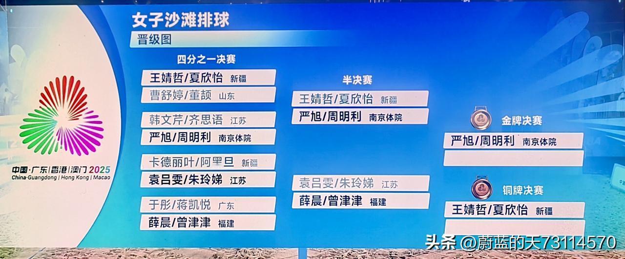 [玫瑰][玫瑰]第十五届全运会男子沙排进入了八进四淘汰赛,女子沙排进入了半决赛阶段,战况如下: 一,男子沙排八进四: 1,江苏一队2-1胜陕西队 2,海南一队1-2负上海二队 3,辽宁一队2-1胜云南一队 4,海南二队0-2负山东一队 江苏、上海、辽宁、山东,晋级四强。 二,女子沙排半决赛: 1,新彊一队0-2南京体育学院队,晋级决赛。 2,江苏一队0-2福建一队,福建一队晋级决赛。