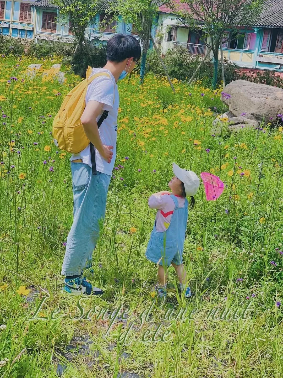 4⃣️古镇对面有一个小花园,有很多的花花,还有游乐设施配套,可以拍小朋友奔跑捕虫的画面