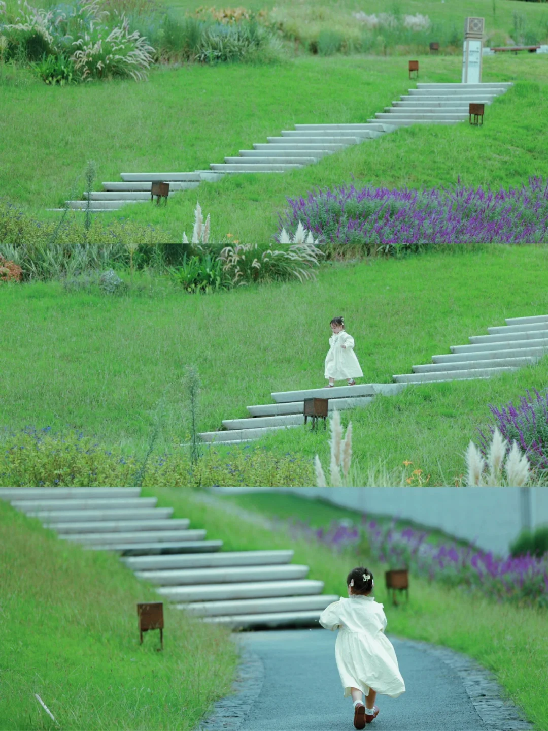 我们是从E出口一出去,就直接到那个一排步梯开始打卡,一路拍上去,中途有长凳,有小山坡(不能踩草坪哟,有人随时看守),最上面有一个静静的躺在山坡上的湖,拍照特出片,我们是因为孩子跑太快,没拍到湖,然后山坡左手边是一片粉黛,现在正是开的最美的时候,拍出来特好看,最后想拍宫崎骏同款天空照的话,要在最高的那一块上坡上,才能挡住后面的房子哟👌