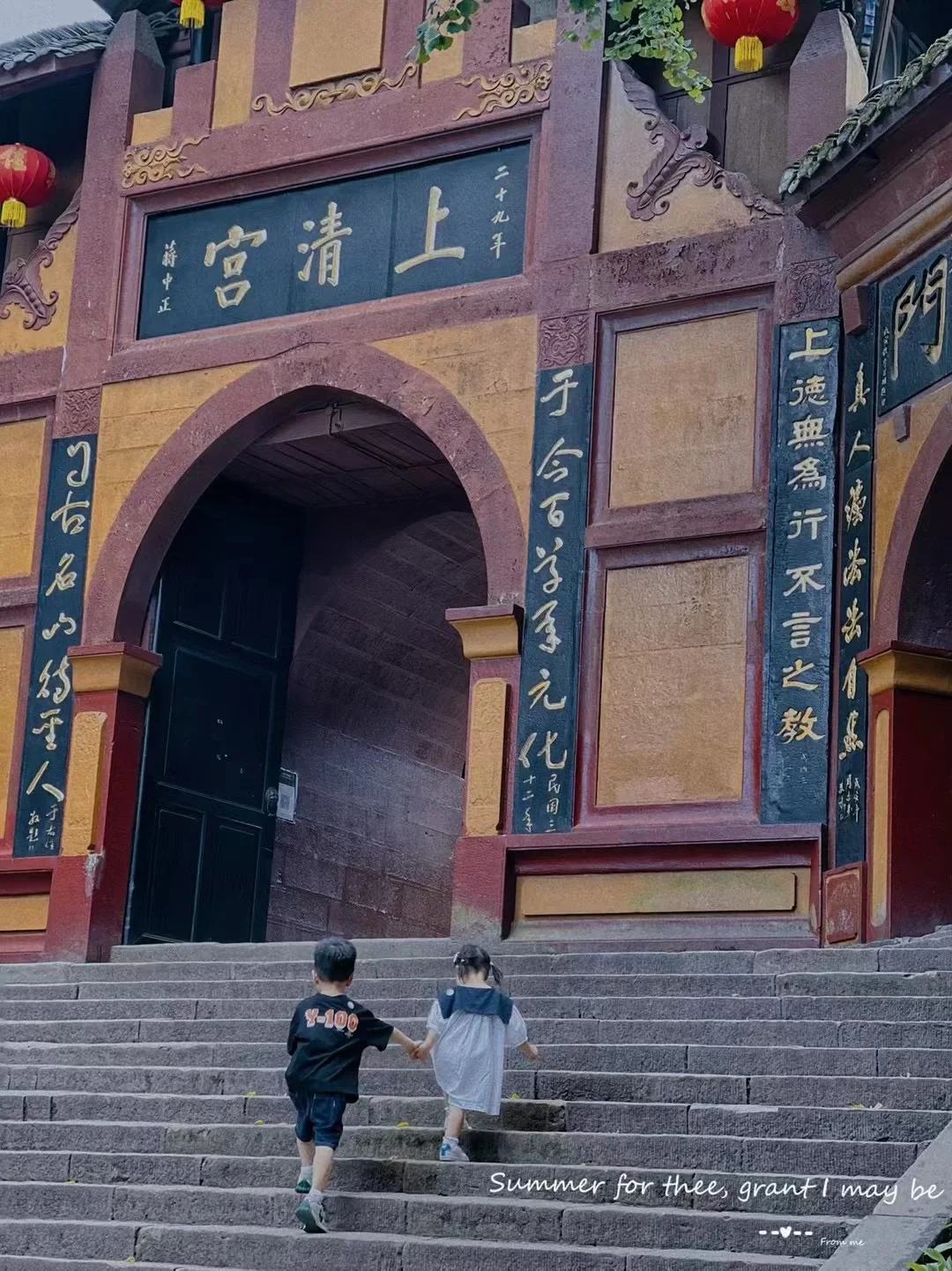 从大门进去以后,大概走一公里左右到达月亮湖,我们选择了花5块钱坐船过河,主要小孩子想体验,其实走过去对面也不远,过了湖就是索道,带孩子爬完全程那是不可能的,特别是我们还有一个三岁不到的宝贝,所以我们还是选择了坐索道上山,30块钱一个人,小孩1.2米以下免费,索道到达山顶以后我们还差不多爬了一个小时到达山顶,这一段路很陡全是阶梯,但是妹妹和哥哥手牵手还是爬上去了,只是说了好累啊,我们一直给他们加油,最后靠自己努力爬到山顶啦,他两成就感满满,前山的话总体来说,道观比较多,景观多为人文景观,山路多为石台阶,就是标准的景区模样很成熟!