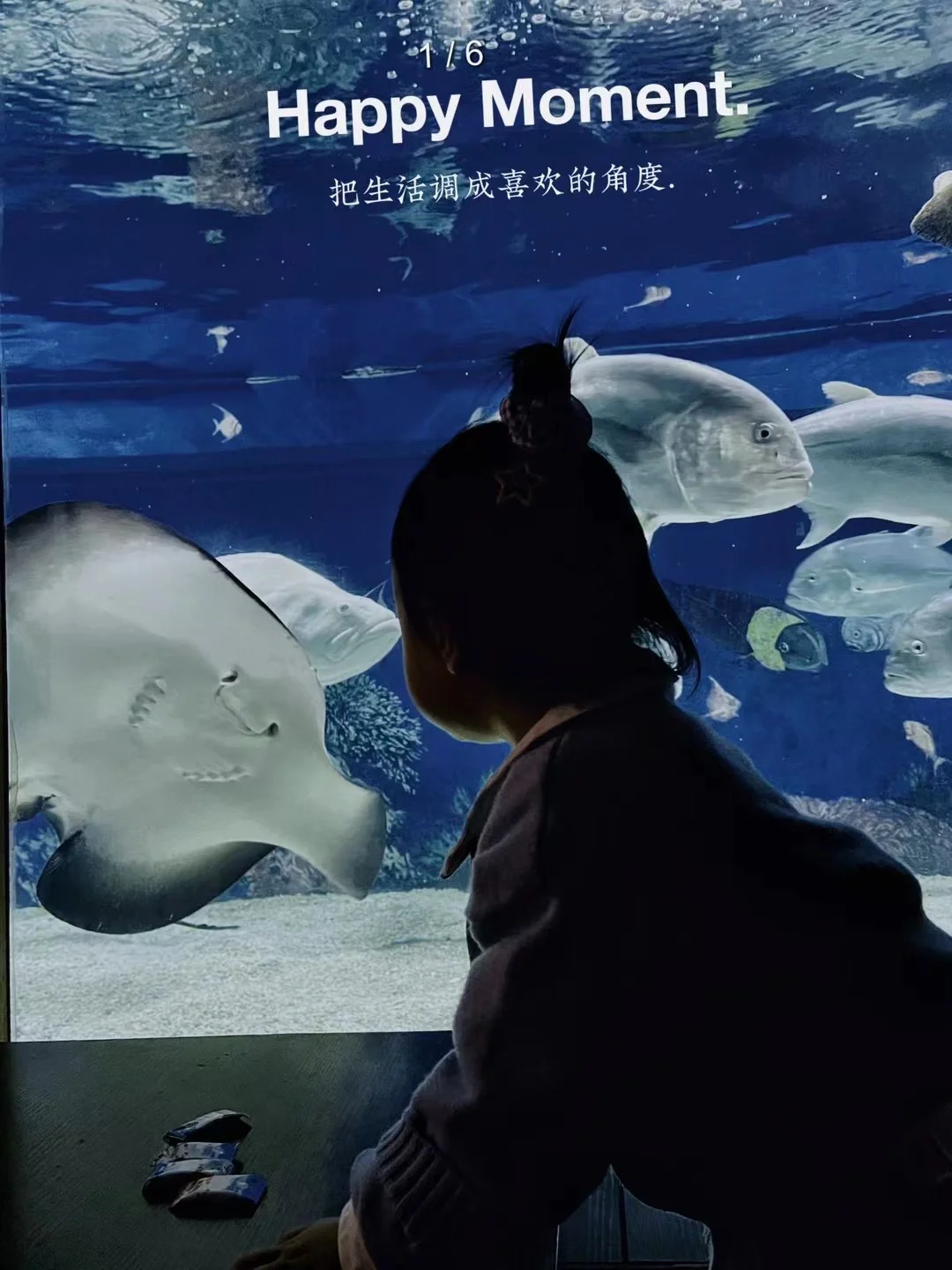 ✔️接着坐电梯一直往上走,这个电梯也是贴满了海洋生物,头顶也全是鱼儿,和海洋馆融为一体,上到五楼就是看表演的地方啦,首先看的是鲨鱼剧场,人鱼公主们在玻璃屏幕里面和观众互动,和鱼儿共舞,会设置一些小问题,回答对啦还有礼品哟,我得到过两次礼品啦,毕竟我是有年卡的人嘻嘻~
