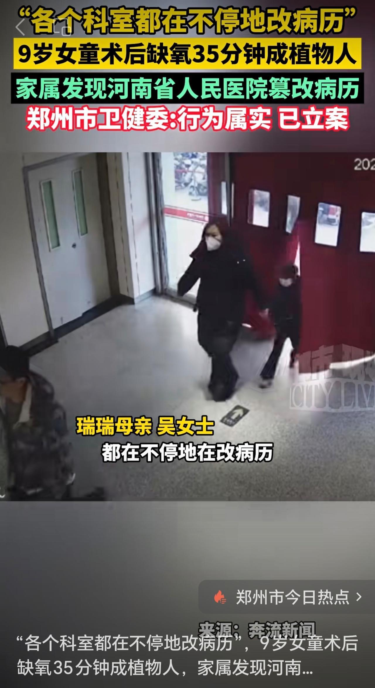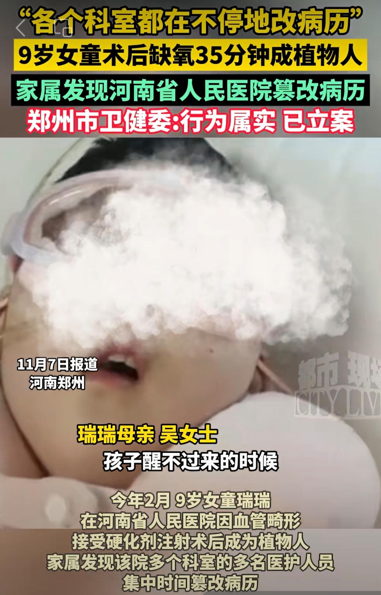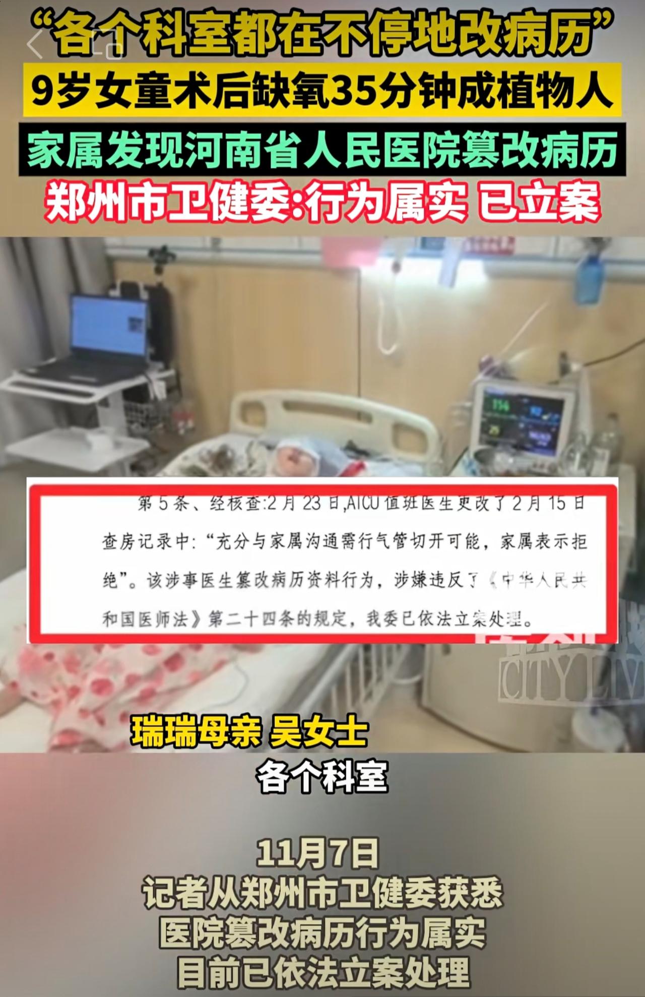 “各个科室都在不停地改病历”,9岁女童术后缺氧35分钟成植物人,家属发现河南省人