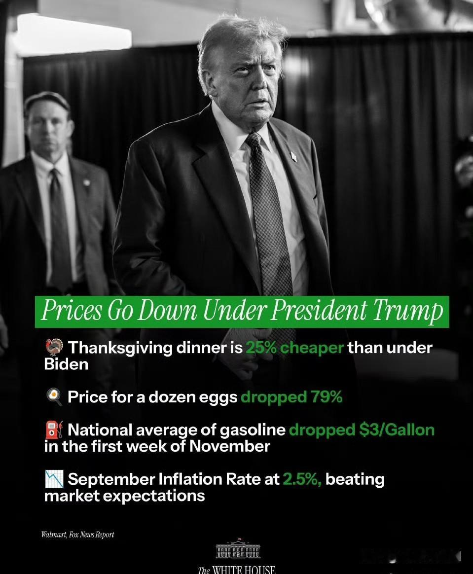 川普总统反应迅速,开打民生牌! 感恩节晚餐成本-25% 鸡蛋价格-79% 全国平均油价降每加仑3美元 九月通胀率2.5%低于市场预期