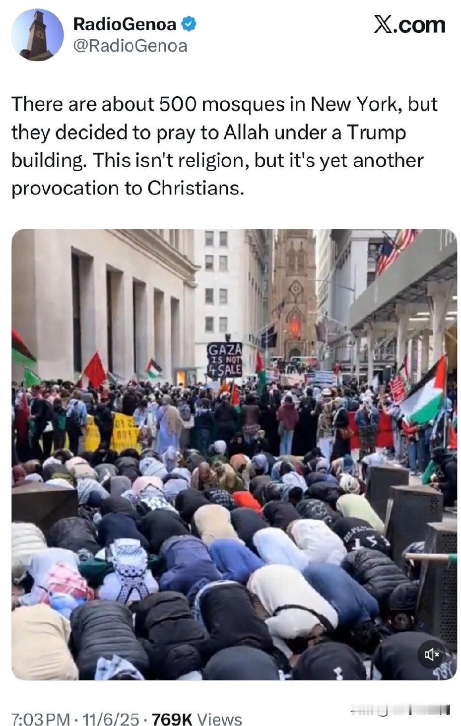 纽约大约有500座清真寺,但他们决定在特朗普的大楼下向真主祈祷。这不是宗教,但这是对基督徒的又一次挑衅。