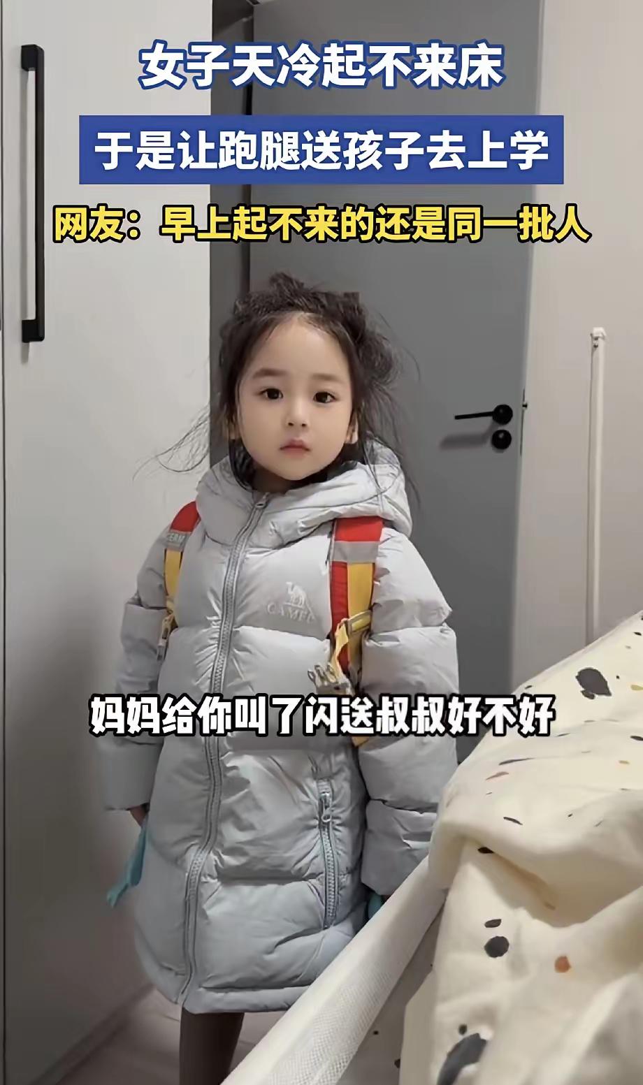 万万没想到! 天津,一幼儿园萌娃收拾好准备去上学,发现妈妈还躺在被窝,就问妈妈谁送她去上学,没想到妈妈却说天太冷不想起,叫了个跑腿小哥。 视频里萌娃一点都不惊讶,看样子应该不是第一次被跑腿送了,妈妈嘱咐了萌娃几句,就让她自己去和跟跑腿小哥对接了,全程都没下床。 还有从小女孩乱糟糟的头发,能看出来这位妈妈是真的一点不想动。 视频刷到结尾,我心里只剩五味杂陈。跑腿服务本是帮人解急的便利,怎么就成了家长偷懒的“甩锅神器”? 萌娃淡定的样子最让人心酸,显然已经习惯了这种“非常规”上学模式。她小小的身影里,藏着超越年龄的懂事,也藏着被忽视的陪伴需求。 有网友说“妈妈太会享受”,可育儿从来不是“能省则省”的差事。幼儿园阶段的孩子,最需要的是清晨的拥抱和安全感,不是陌生跑腿的临时护送。 我国青少年心理研究显示,3-6岁是亲子依恋形成的关键期,父母的日常陪伴直接影响孩子的安全感建立。一次两次或许没事,长期如此隐患重重。 乱糟糟的头发更像一个隐喻,暴露了妈妈对孩子生活细节的敷衍。送娃上学不是简单的“送到就行”,背后是责任和关爱。 跑腿小哥再靠谱,也给不了父母的牵挂。孩子过马路时的叮嘱、进校门时的鼓励,这些温暖瞬间,花钱买不来也替代不了。 有人说“冬天起床难可以理解”,但为人父母本就意味着取舍。你图一时安逸,可能错过的是孩子成长中再也回不去的珍贵时光。 育儿没有捷径可走,也容不得半点偷懒。便利服务是生活的辅助,而不是亲情的替代品。 孩子的童年只有一次,别让“懒得动”变成日后的“追悔莫及”。陪伴的温度,才是孩子成长路上最珍贵的底气。 各位读者你们怎么看?欢迎在评论区讨论。