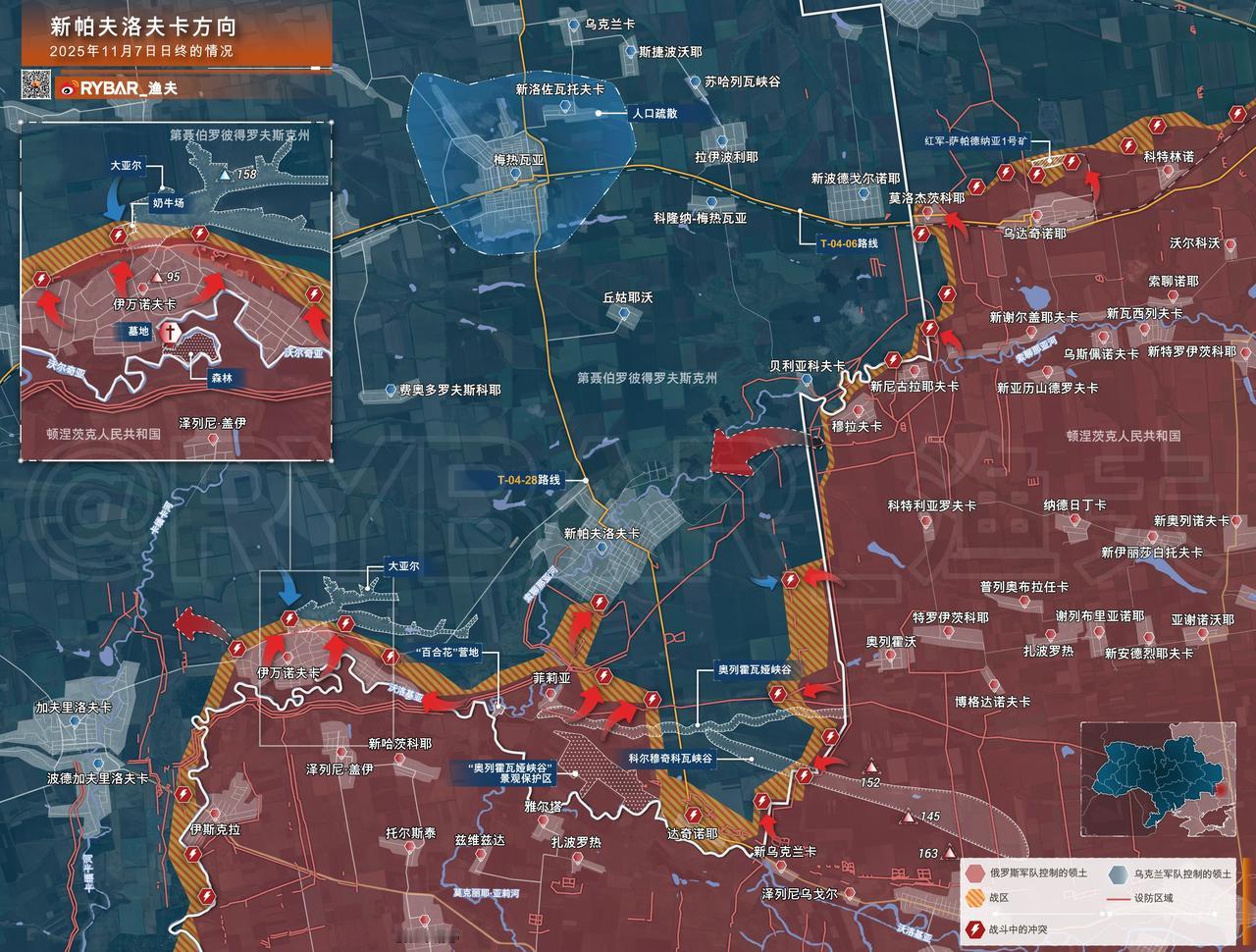 🚩新帕夫洛夫卡方向 2025年11月7日的情况 在新帕夫洛夫卡方向,乌军在伊万诺夫卡地区发动了反攻。敌军在失去定居点后,在装甲车支援下试图将俄军战斗人员逐出北部农场区,但此举反而证实了其自身阵地的丧失。 📌与此同时,在通往新帕夫洛夫卡的接近地,俄军正以小编组发动攻击,并且显然侧重于清理达基诺耶以北口袋区的敌军。 ❗️此项行动完成后,对新帕夫洛夫卡本身的进攻将相对简化——原因在于,若在菲利亚地区集结兵力需横渡沃尔奇亚河,而此前已有数辆坦克在尝试涉渡时陷入河床,并遭无人机打击摧毁。 俄乌冲突新局势俄军最新进展热点观点 🔍高分辨率地图:网页链接
