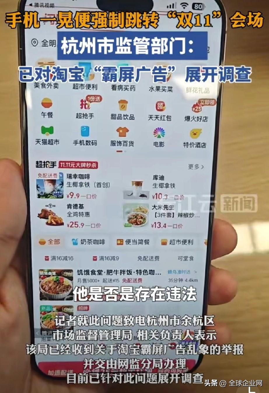 官方称已对淘宝霸屏广告展开调查【杭州市监部门:对淘宝“霸屏广告”展开调查】据大众日报消息,11月6日消息,针对淘宝“双11”期间霸屏广告乱象,杭州市余杭区市场监督管理局证实已收到相关举报,目前已交由网监分局展开调查。此前,有用户反映,打开多款手机App时,手指触碰或机身晃动即被强制跳转至淘宝会场,严重影响使用体验。信息显示,淘宝曾于2021年6月、7月,分别因广告违法行为、未制止平台商家广告违法,两度被余杭区市监局处以5万元顶额罚金。