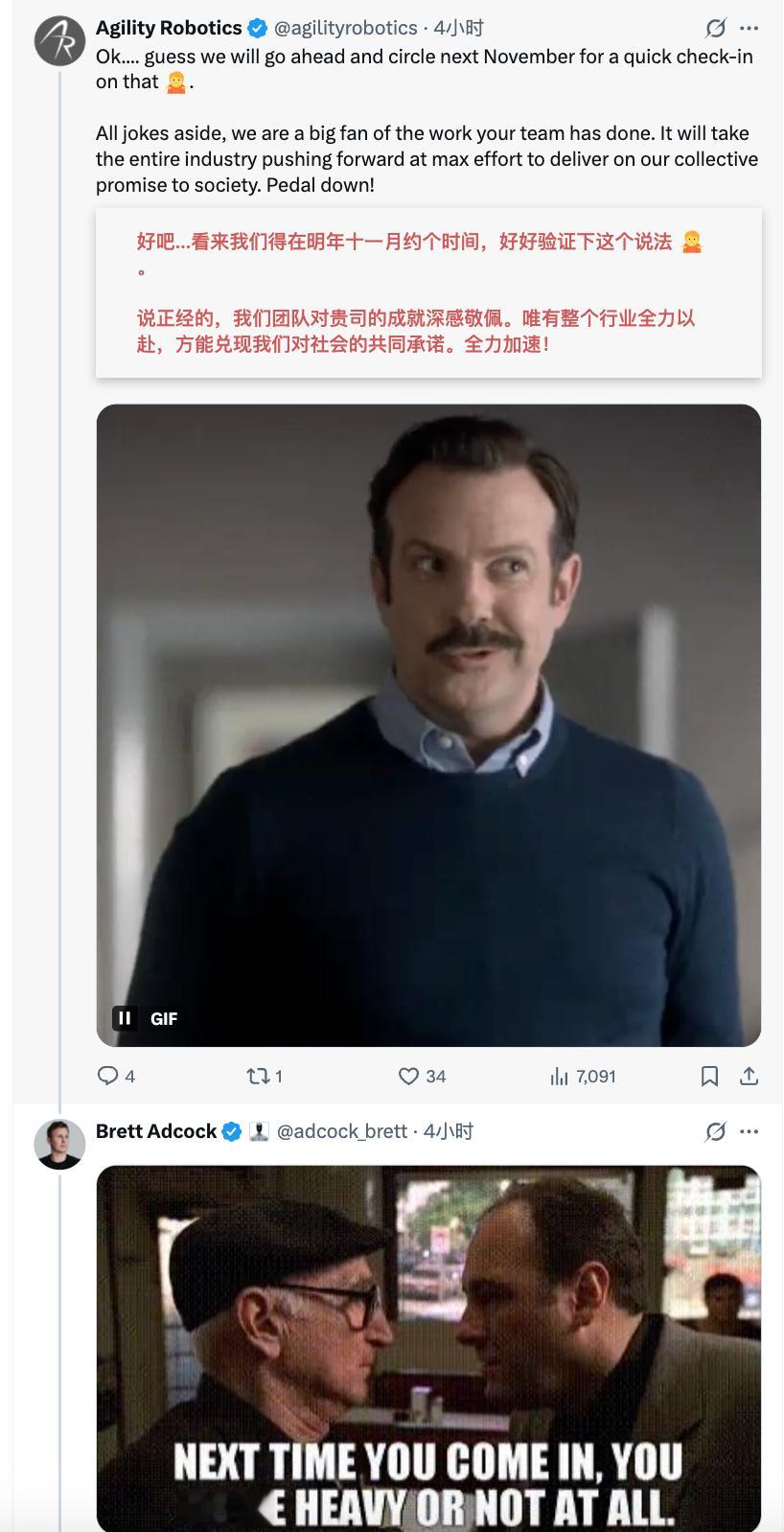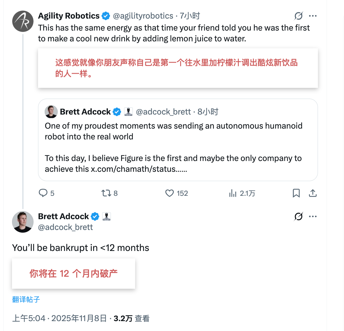 但 Agility Robotics 也不是善茬,他们家的机器人从 2023 年开始就在亚马逊库房试运行了,所以不服 Brett Adcock 的说法也很正常。反倒是 Brett Adcock 的回应有点恶毒了。