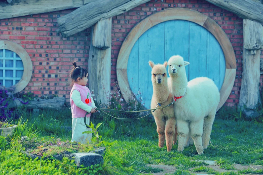 这里有一大片玫瑰花海,还有两对可爱的羊驼,可以牵到霍比特小屋上面拍照,还可以在这里和娃一起体验摘玫瑰花,手工制作鲜花饼,草坪上还有秋千,滑索,在这里遛娃体验感超级棒哟~
