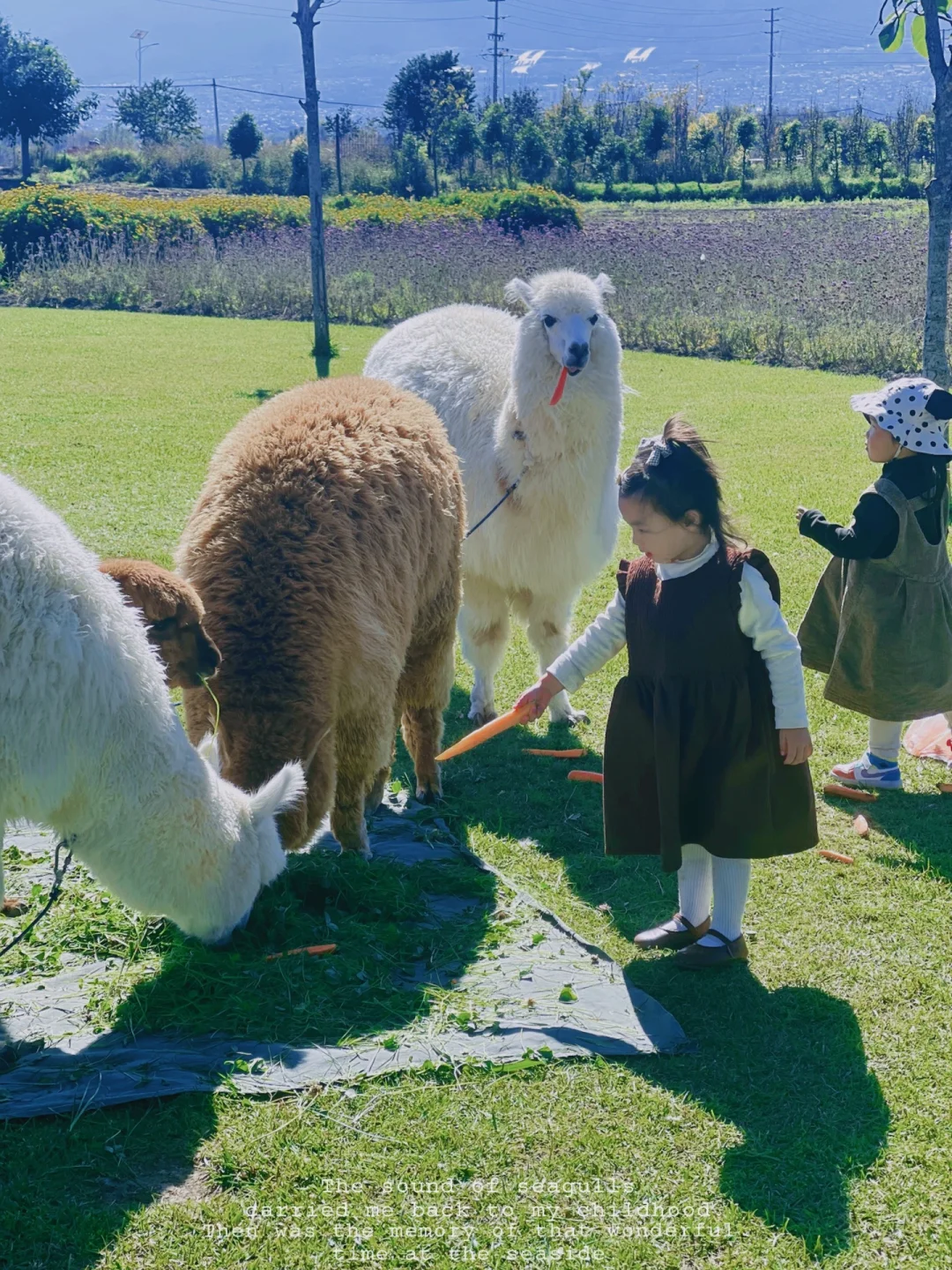 里面也有四只羊驼可以自己买胡萝卜来喂,还有很多拍照打卡设施和许多的花,孩子可以在草坪上随意地跑,是一个让娃放电的,老母亲轻松遛娃的好地方