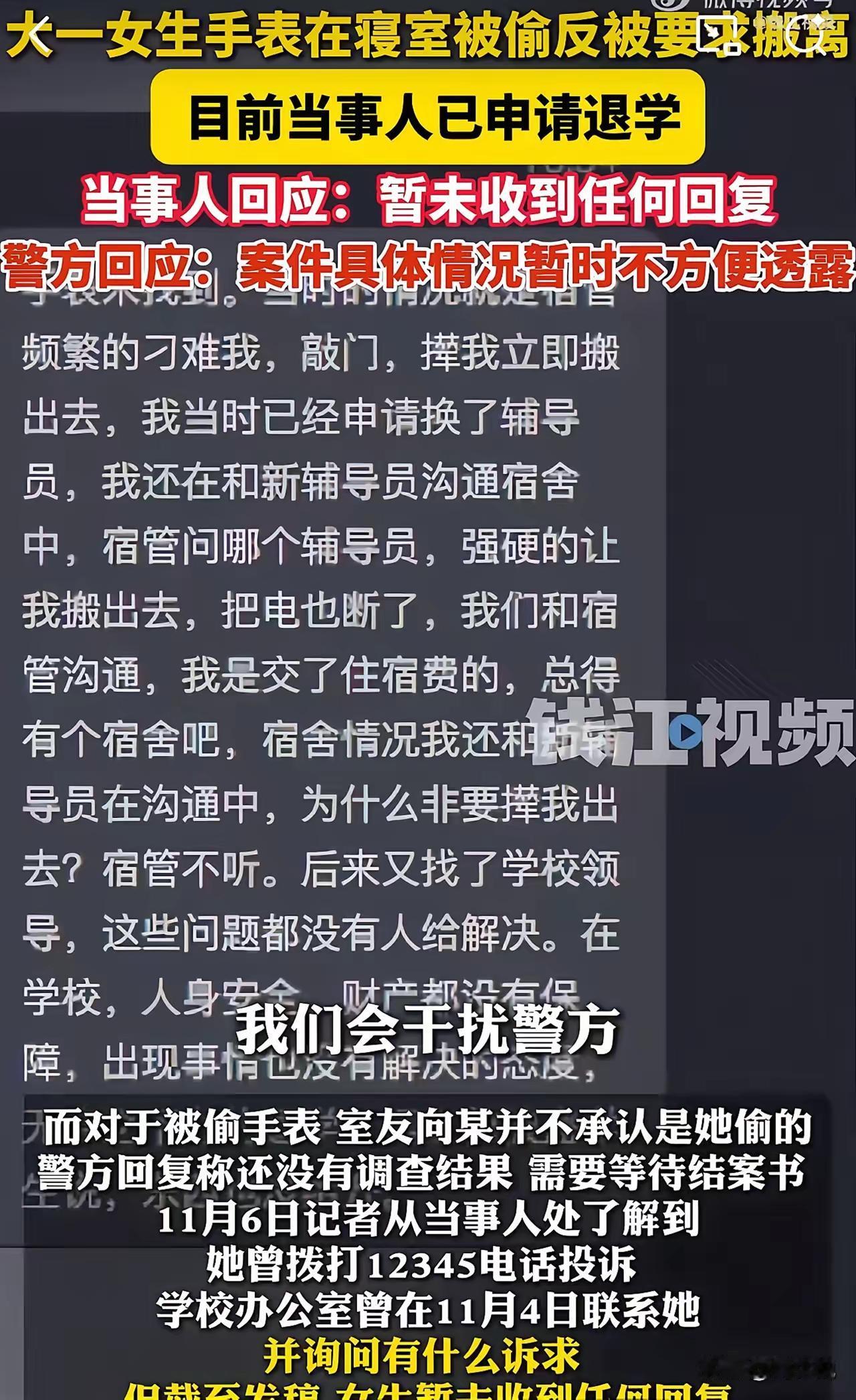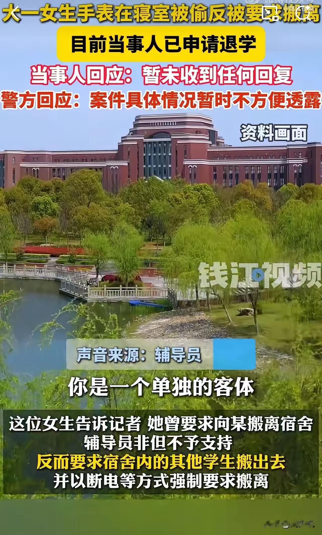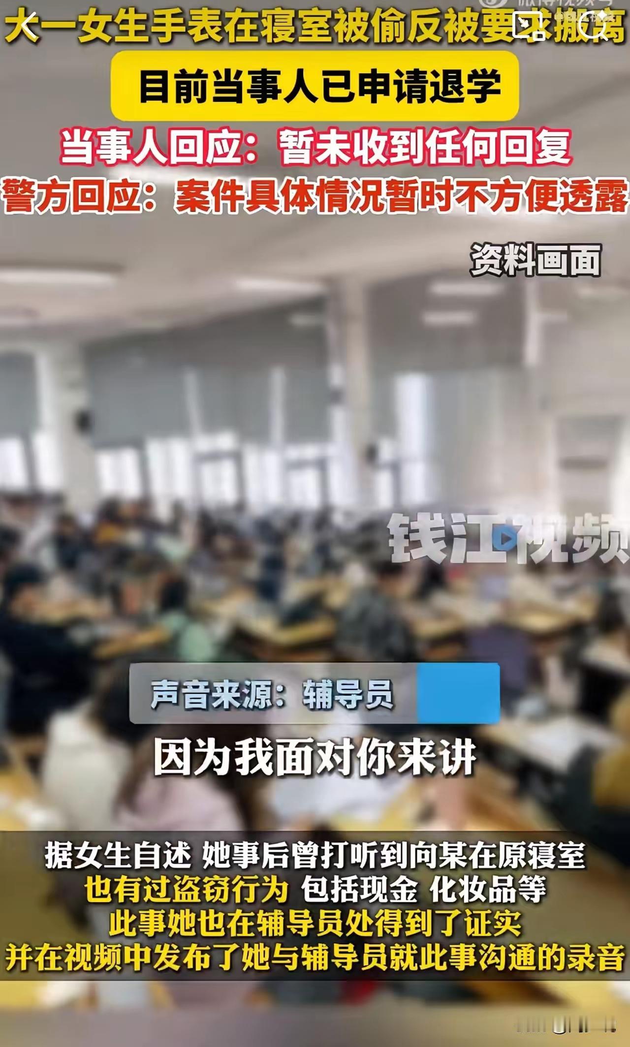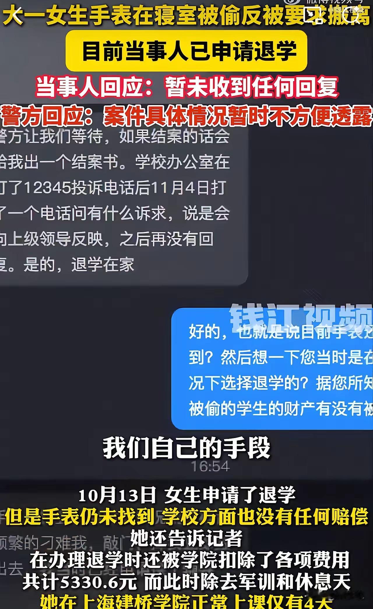 上海一高校惊现离谱事!大一女生宿舍4399元苹果手表被盗,凭定位锁定室友,辅导员却阻挠报警、反逼她搬离,最终女生无奈退学,还被扣除5千余元费用,引发全网热议!这到底是怎么一回事?背后隐藏的又是什么样的人性光辉与黑暗?让我们一探究竟。 事情的起因很简单,一位刚踏入大学校门的大一女生,在宿舍中发现心爱的苹果手表不翼而飞。作为一名学生,她本应该第一时间选择报警,寻找线索,保护自己的权益。然而,事情的发展却出乎所有人的预料。她用定位功能锁定了嫌疑人——竟然是室友!这个曾经一起生活、一起梦想的伙伴,竟然成了她的“偷窃者”。 令人震惊的是,辅导员却站在了另一个角度。面对女生的报警请求,辅导员不但没有支持她,反而试图阻止报警,甚至建议她“自己解决”。更令人愤怒的是,辅导员竟然威胁她“搬离宿舍”,让她放弃追查,仿佛这只是一场小小的误会,而不是一场关系到人身财产安全的严重事件。 在重重压力之下,这位女生最终选择了退学。她带着满腔委屈和失望,离开了那个曾经梦想的校园。更令人愤慨的是,学校竟然还扣除了她5000多元的学费,理由竟然是“住宿费、退学手续等相关费用”。这些费用的背后,是对学生权益的漠视,还是对一个年轻心灵的伤害? 这件事情在网络上引发了轩然大波。网友们纷纷谴责学校和辅导员的处理方式,质疑“校园是否还应该是安全的港湾?”“学生的权益到底被谁在守护?”有人说,这不仅仅是一件盗窃案,更是一场校园暴力和权力滥用的深刻反映。有人感慨,作为社会的未来,大学应该是培养正义感和责任感的地方,而不是成为“黑暗角落”。 从这件事中,我们看到了人性中的善与恶,也看到了制度中可能存在的漏洞。更重要的是,它让每一个关心青少年的我们反思:在这个快节奏、利益导向的社会里,年轻人究竟该如何保护自己?学校又该如何履行起应有的责任? 这起事件的核心,不仅仅是失窃的苹果手表,更是一个关于信任、责任和正义的深刻课题。我们期待,社会、学校、家庭,都能从中汲取教训,为年轻一代营造一个更加安全、公正、充满希望的成长环境。 每个人都曾在青春的岁月里梦想未来,但若连最基本的安全感都无法保障,那我们的未来又将寄托在怎样的希望之上?让我们共同关注这起事件,呼吁更多透明公正的制度,让每一位年轻人都能在阳光下成长,无惧黑暗。因为,真正的正能量,来自于我们每个人的守望与努力。校园失窃事件 手表偷盗 高校女生事件 宿舍手表 校园盗窃 手表盗窃 宿舍偷钱