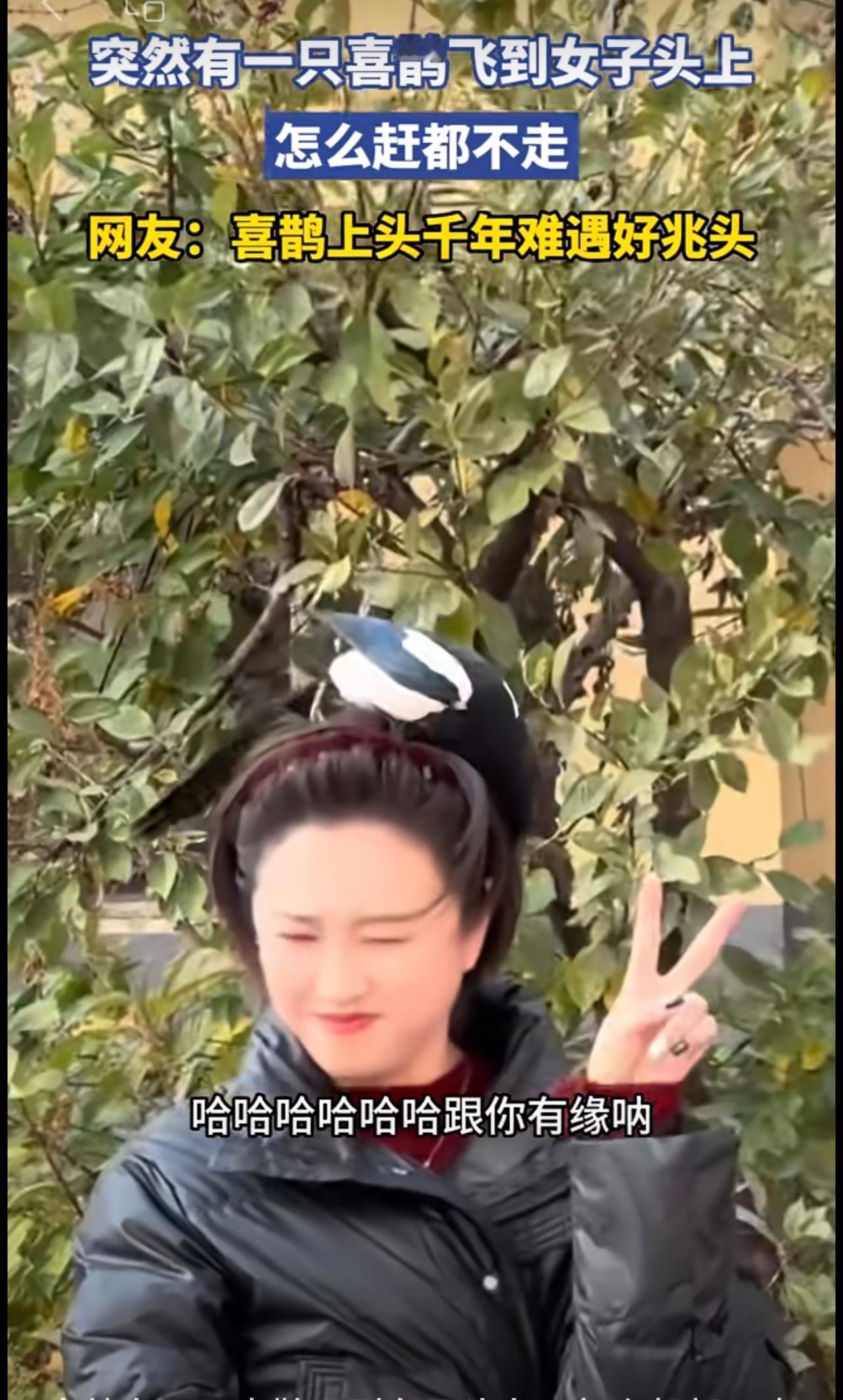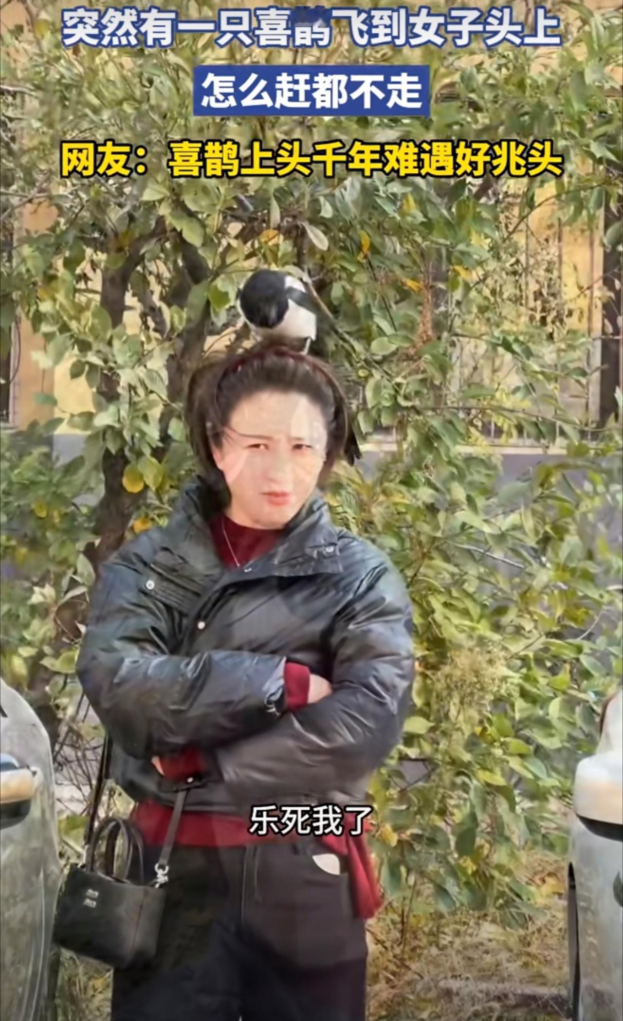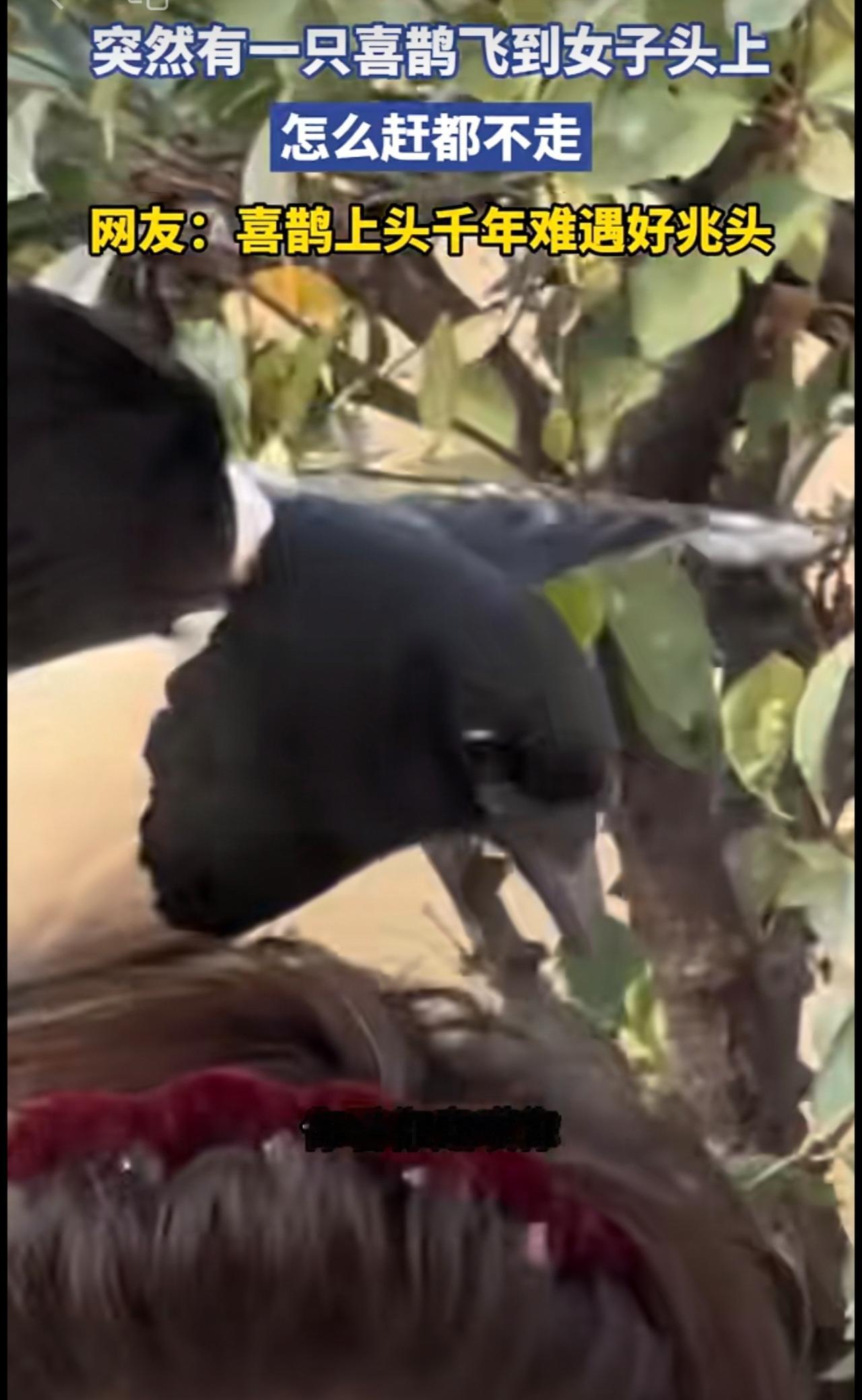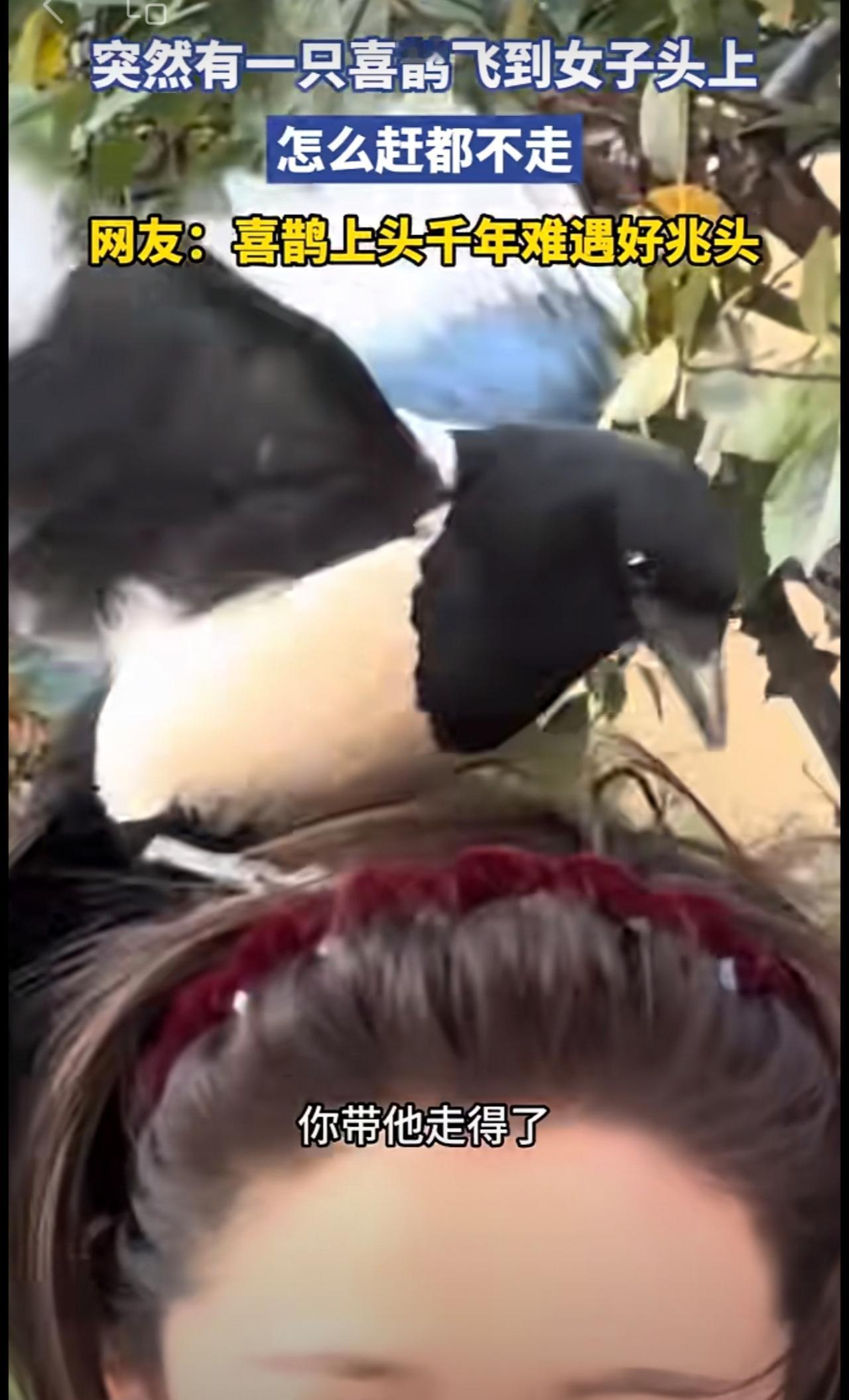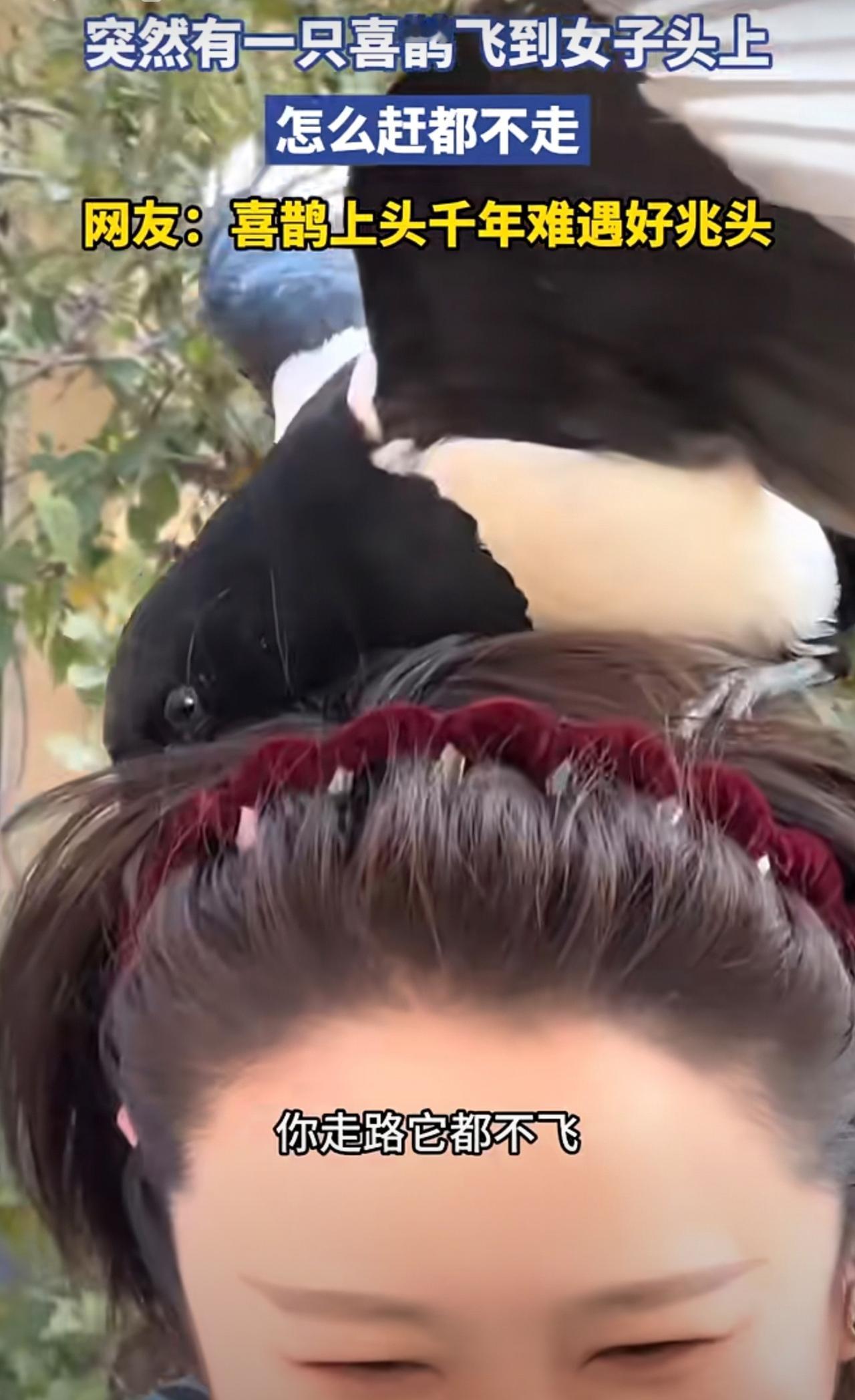 突然有一只喜鹊飞到女子头上,怎么赶都不走[捂脸]