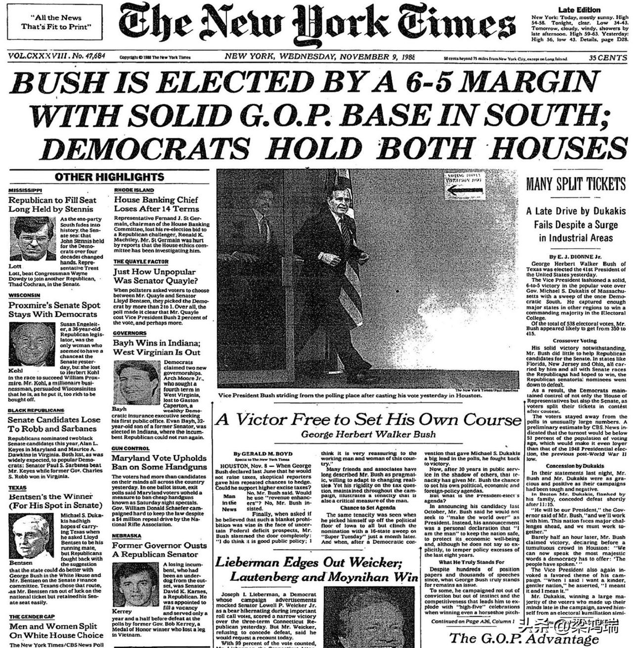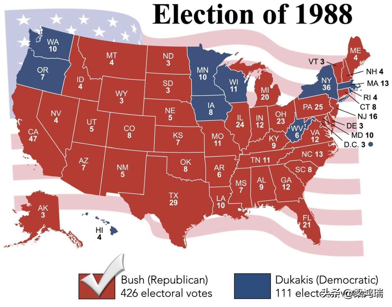 1988年11月8日,副总统乔治·H·W·布什当选为美国第41任总统,击败了马萨诸塞州州长迈克尔·杜卡基斯。布什成为自1836年马丁·范布伦以来首位赢得总统大选的在任副总统。 迈克尔·杜卡基斯(Michael Dukakis)曾担任马萨诸塞州(Massachusetts)州长。 他是马萨诸塞州任职时间最长的州长,共担任了三个任期,具体时间为: 1975年至1979年 1983年至1991年 他最出名的事件之一是在任期内创造了被誉为“马萨诸塞奇迹”的经济繁荣,并作为民主党总统候选人参加了1988年的美国总统大选。