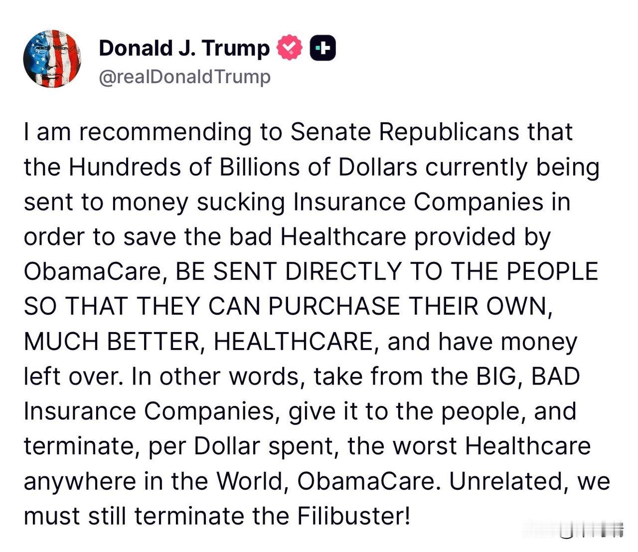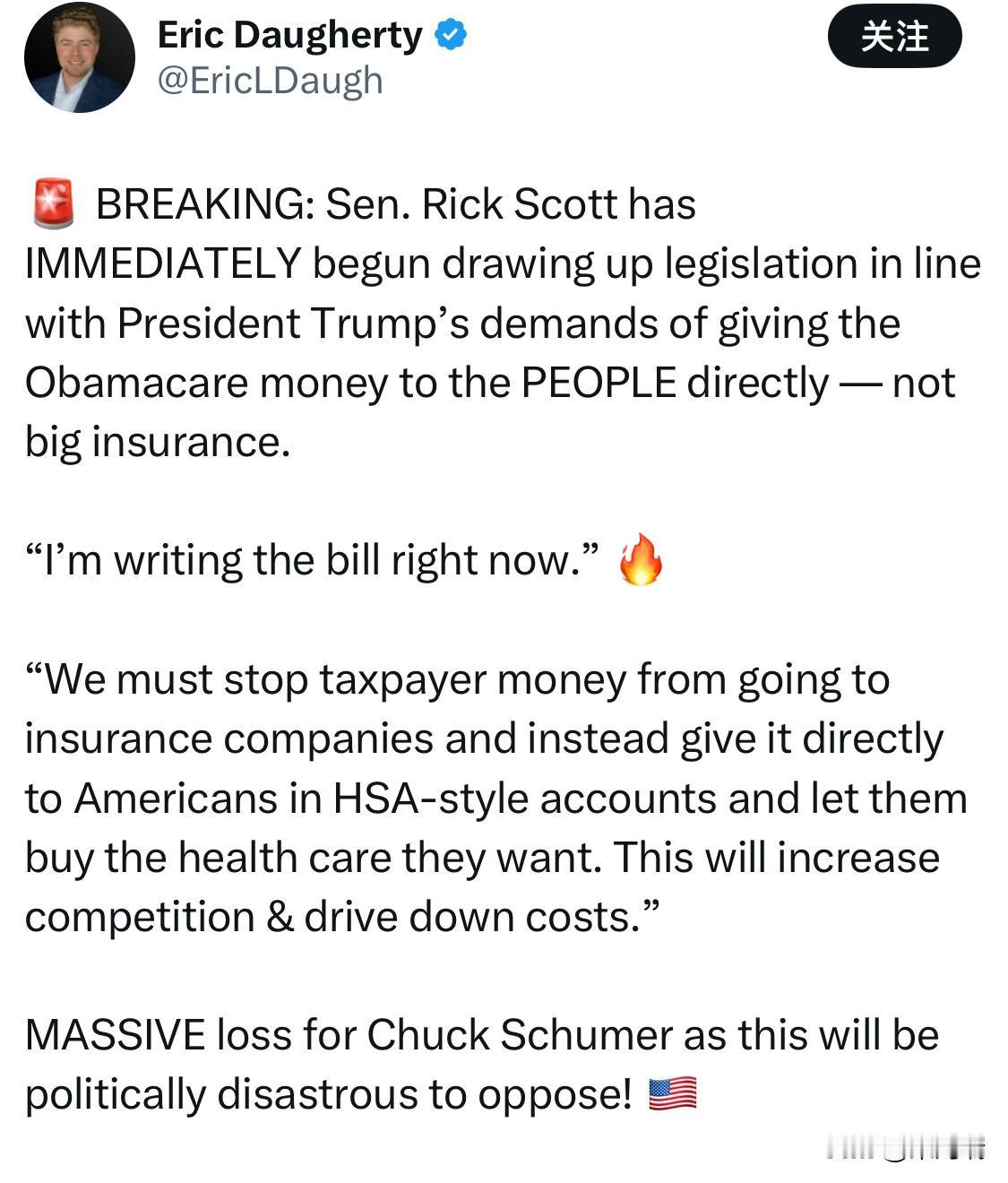 突发:共和党参议员里克·斯科特已立即开始起草法案,以响应特朗普总统的要求,将奥巴马医改的资金直接发放给民众,而不是大型保险公司。 “我正在起草法案。” “我们必须阻止纳税人的钱流入保险公司,而是将其直接存入类似健康储蓄账户(HSA)的账户,让美国民众自行选择所需的医疗保健服务,这将增加竞争,降低医疗成本。”