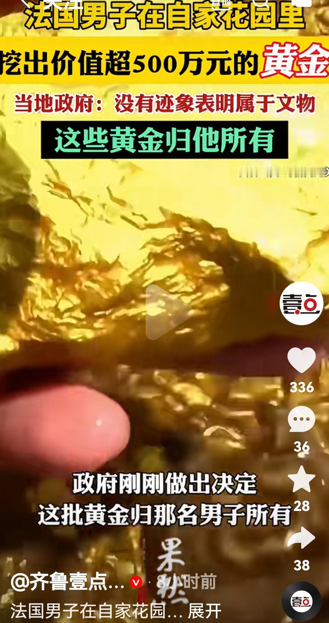 法国男子在自己家的花园里挖出价值500万黄金,当地政府说归他自己所有 根据媒体报道,法国政府11月6日说一个法国男子在自己家花园挖游泳池时,挖出来了价值70万欧元的金币和金条 当地政府说,没有迹象表明这批黄金属于文物,所以这些金子归该男子所有 并且这个房子前主人也已经死亡,经过调查这些黄金也是以前所有人合法所得,因为15到20年前在这个附近熔炼厂融化过 这名男子是幸运的黄金制品价值 黄金失窃案 挖到黄金 黄金昂贵之谜 图片来自齐鲁壹点媒体视频
