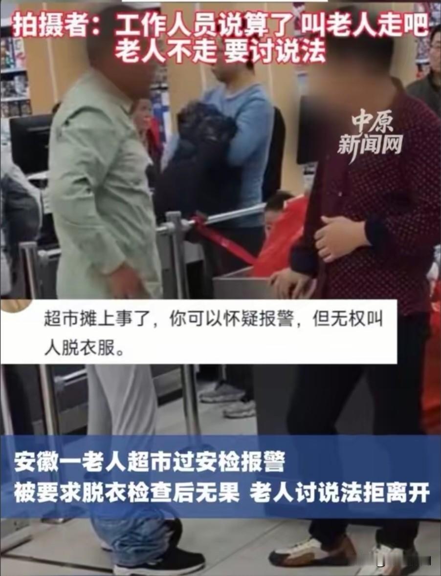 这下全国人都知道这家超市了,如偿所愿的火了,这家超市有什么权利让老人脱衣检查呢,支持老人讨要说法。 11月9日,安徽一超市老人过安检时报警器响了,工作人员就要求老人脱衣检查,最后没有发现什么,工作人员让老人走,怎么超市工作人员连道歉都不会吗?老人坚持不同意,要讨说法。 超市这么做确实太过分了,明明是他们做错了,连基本的态度都没有 以后谁还敢去哦。 超市已经赔偿,已经主动给老人道歉。 大家怎么看待这件事呢?