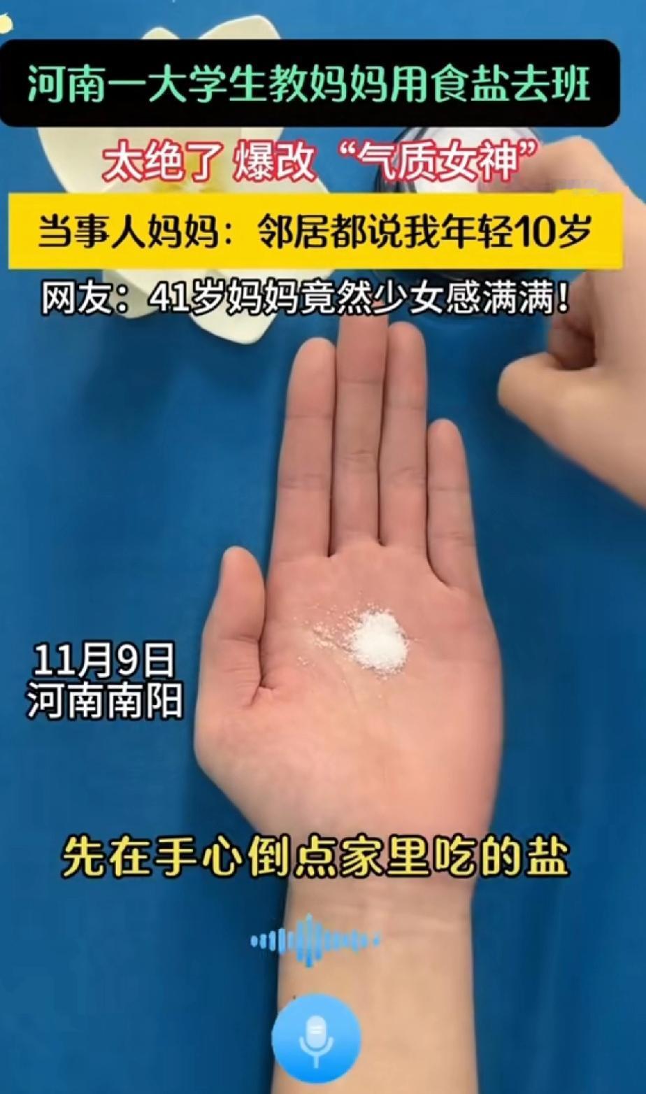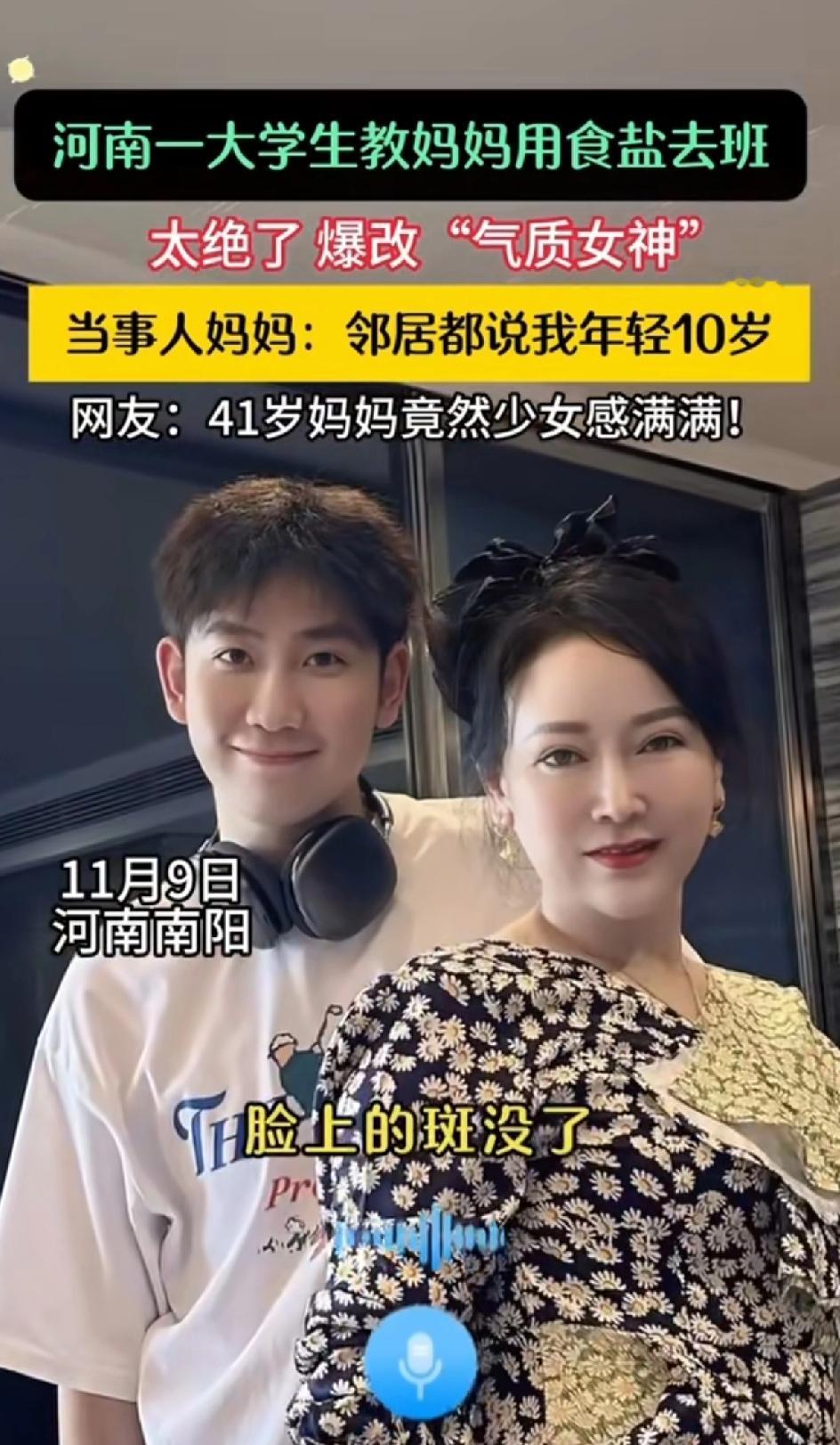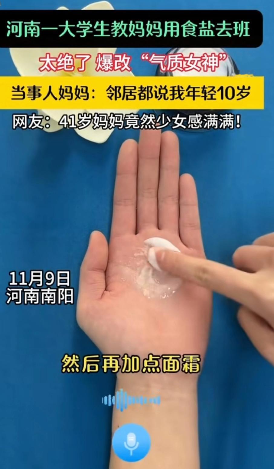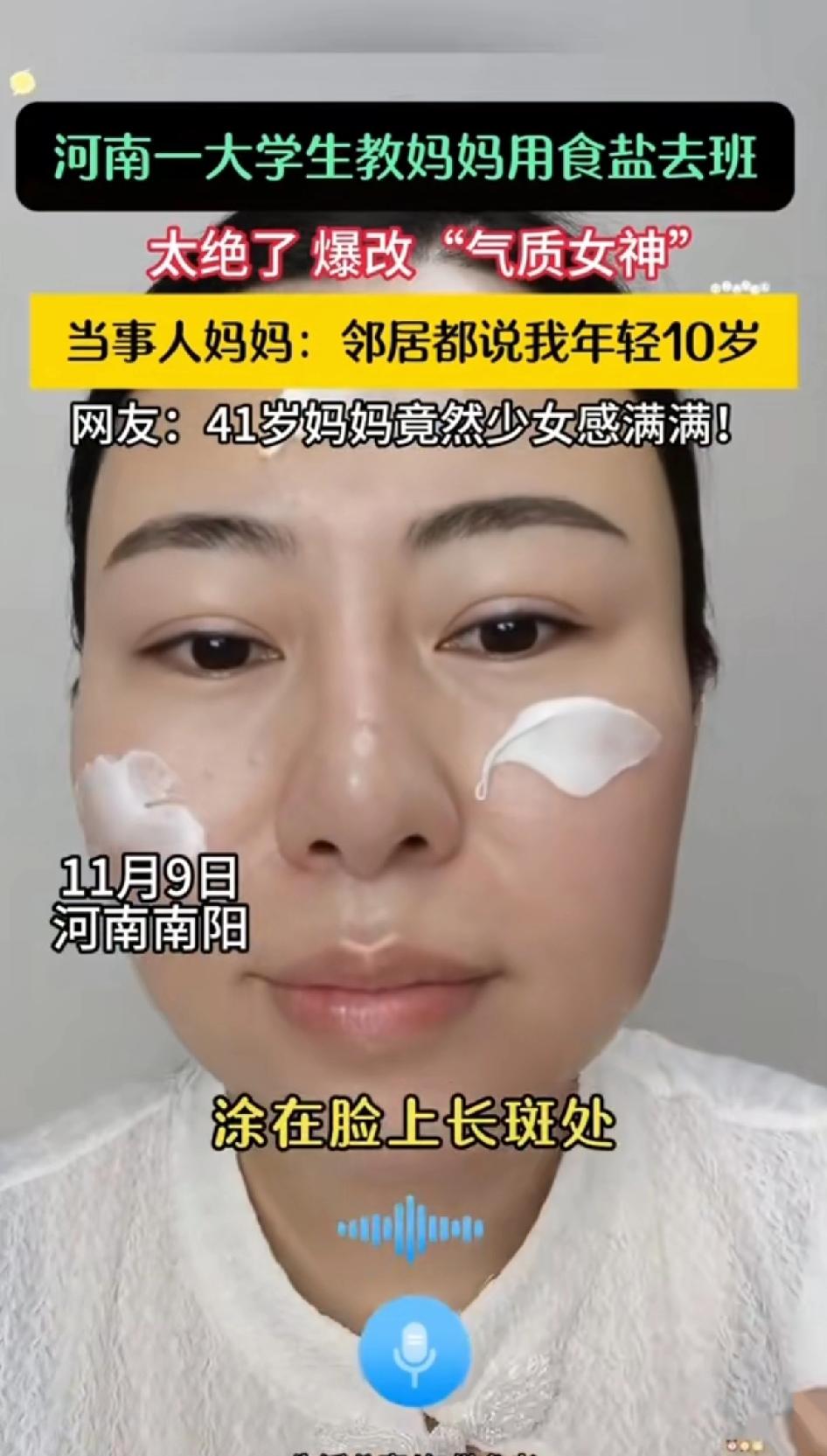 河南一大学生教妈妈用食用盐祛班 没想到效果太绝了 “爆改气质女神” 当事人妈妈:邻居说我年轻10岁! 网友:41岁妈妈竟然少女感满满。 男大学生称自己在上化学课时学到的,盐和护肤霜放在一起涂在长斑处 能起到美白的作用。 妈妈试过之后皮肤确实更加美白光滑了。 明天我也试试,我也想变美,也想变年轻! 图一这母子俩看着确实不像母子,倒像姐弟俩。这个儿子好贴心,把上课学到的知识运用到生活里,既能替妈妈解决烦恼,又证实了知识改变命运。小伙子真是活学活用。 妈妈有这样的儿子真的好贴心。 都说女儿是妈妈的小棉袄,其实不然,儿子如果是个细心的人,比女儿更贴心,更孝顺。 现在都说闺女好,其实有儿子更有安全感,儿子也操心,但女儿操心得地方更多。 男孩只需要操心他不变坏就可以了。 女儿操心她早恋,又担心她被人欺负。想想还是生儿子更好! 图上的男孩多贴心,从来没听说哪个女儿上课学到的小知识替妈妈解忧的。
