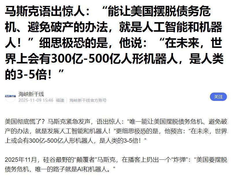 美国彻底慌了?马斯克紧急发声,语出惊人:“唯一能让美国摆脱债务危机、避免破产的办法,就是发展人工智能和机器人!”更细思极恐的是,他预言:“在未来,世界上或会有300亿-500亿人形机器人,是人类的3-5倍!”   38万亿的美元国债,像座大山压在美国所有人的头顶,2025年光利息就得还1.2万亿美元,每分钟“烧”掉的利息超过200万美元。   而马斯克抛出“AI和机器人是唯一出路”的言论就不难理解了,毕竟这债务窟窿实在太大,传统办法早已捉襟见肘,只能寄望于技术革命来破局。   IDC预测到2030年,人工智能将为全球经济贡献19.9万亿美元,推动全球GDP增长3.5%。更关键的是,在企业相关的AI解决方案和服务上每花费1美元,就能为全球经济带来4.6美元的间接和诱发效应,这种杠杆效应正是美国急需的。   就像国内某大型集团企业在押注混合式AI后,二季度AI PC出货量环比增长228%,24/25财年Q1营收1119亿元同比增长20%,净利润近23亿元同比增长38%。   活生生的例子就摆在那,AI能拉动经济增长的能力有目共睹。要是美国能把这种增长势能放大到整个经济体,税收蛋糕自然会做大,偿还债务的底气也能足上几分。   与此同时,AI降本增效的本事更是显露无遗。移动在北京搞的“京智AI+核心网智慧运维体”,把原本需要“三组六人一通宵”的核心网软件升级,变成全程只需一位工作人员就能轻松搞定的全自动化流程,节约高达70%的人工工时。   在马斯克的设想中,美国政府部门、企业要是能大范围推广这种AI应用,光人力成本就能省下一大笔。现在美国很多公共服务、企业运营都还依赖大量人工,要是把这些重复劳动交给AI,释放出的人力和成本节省,说不定就能帮着多还不少利息。   至于马斯克心心念念的机器人,更是被寄予厚望。虽然目前人形机器人大规模应用还没完全铺开,但特斯拉Optimus的进展已经让美国人看到了潜力。   要是未来真能有300亿-500亿人形机器人,这些“钢铁打工人”不会像普通人一样要工资、要福利,却能24小时不间断干活。   想想看,在制造业、服务业、农业等各个领域,机器人能替代多少人力,创造多少产值。就拿制造业来说,现在一条自动化生产线就能大幅提高效率,要是换成灵活度更高的人形机器人,生产效率还不得再上一个台阶?   产品成本降下来,竞争力提上去,美国商品在全球市场的份额显而易见的会有所增加,经济造血能力自然会增强。   而且现在全球AI竞争已经进入白热化阶段,中国在AI领域的投入也在不断加大,中金公司估算以2024年为基准,AI到2030年将为中国带来GDP额外提升约4.8万亿元。   美国要是在AI和机器人领域落后了,不仅债务危机难解,全球科技霸主的地位都可能动摇。毕竟谁掌握了核心技术,谁就能在未来的经济竞争中占据制高点。马斯克作为硅谷的“颠覆者”,显然看透了这一点,所以才会如此急切地呼吁发展AI和机器人。   在债务压力和竞争压力的双重夹击下,AI和机器人确实成了美国为数不多能抓住的救命稻草。毕竟靠借钱过日子不是长久之计,只有靠技术创新把经济蛋糕做大,美国才有望能走出债务危机的泥潭。