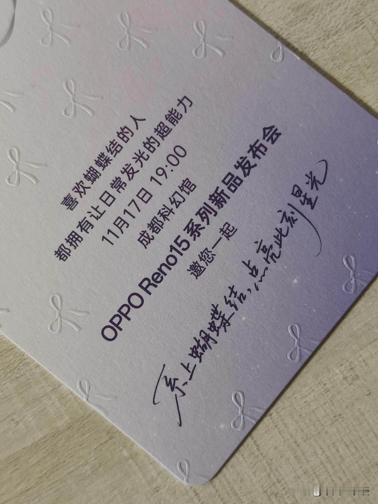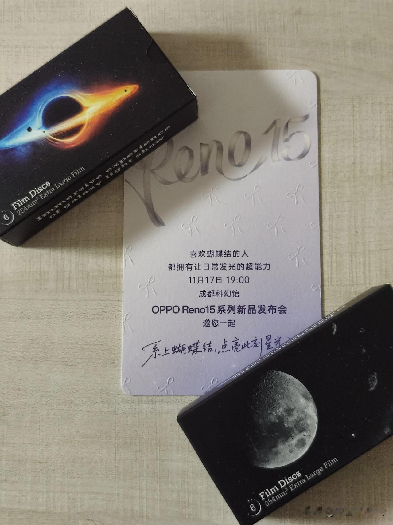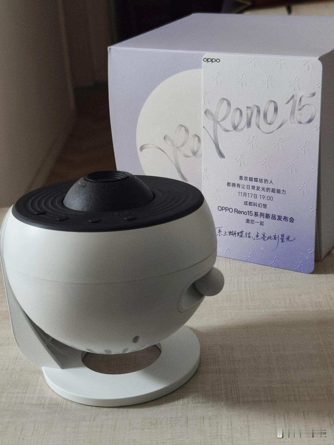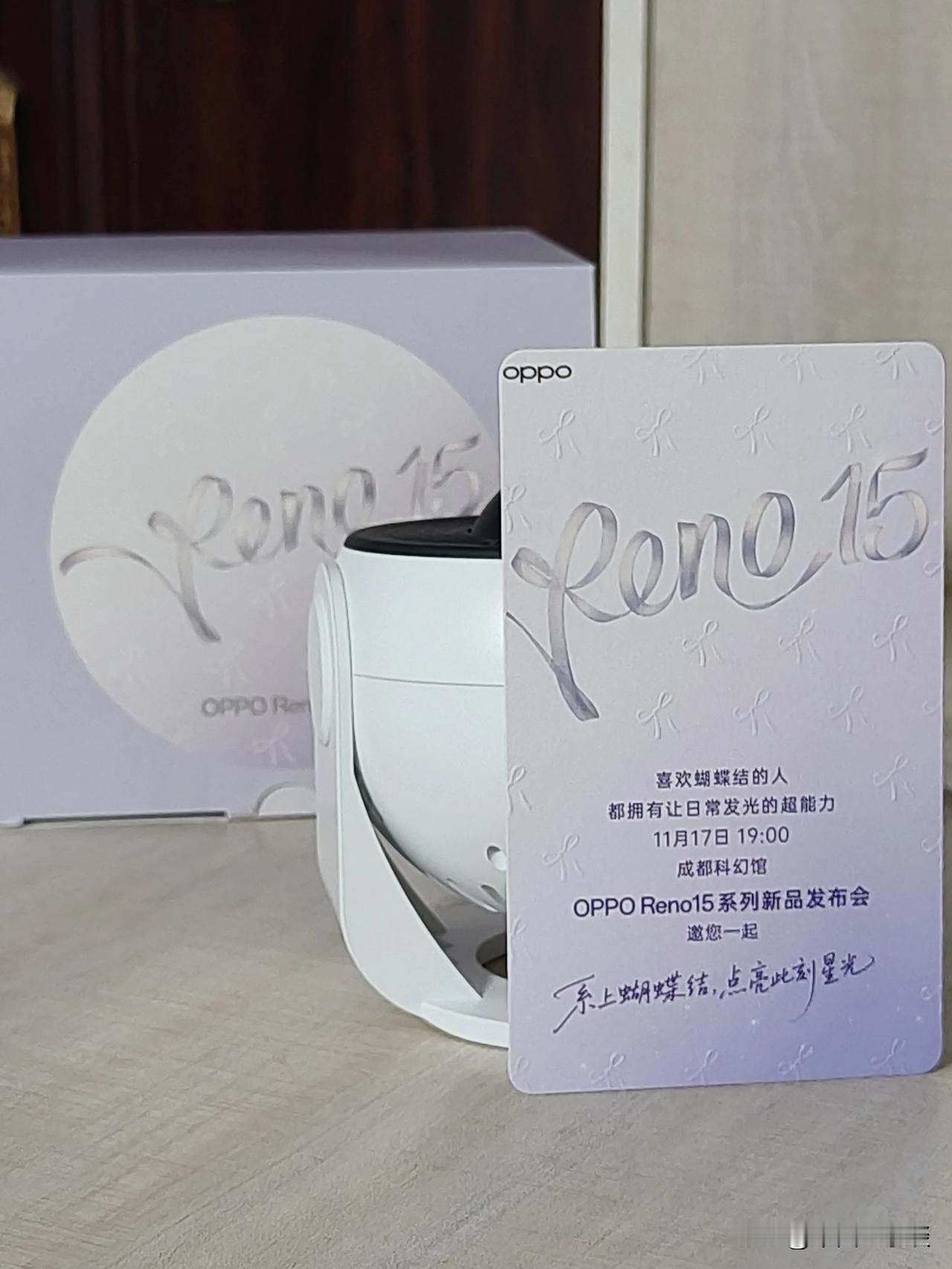收到宋雨琦同款OPPO Reno15邀请函!新一代OPPO Reno15系列代言人是Reno Girl宋雨琦,而邀请函是充满科幻感的星空灯。星光灯外包装盒顶部有蝴蝶结元素,邀请函上也凸显各种蝴蝶结元素,Reno15星光蝴蝶结引领潮流! 最有意思的是夜晚打开星光灯,“系上蝴蝶结,点亮此刻星光”的氛围感扑面而来。更换幻灯片,各种充满科幻感的精致图案栩栩如生出现在眼前。 11月17号晚上七点,成都科幻馆OPPO Reno15 系列新品发布会见!