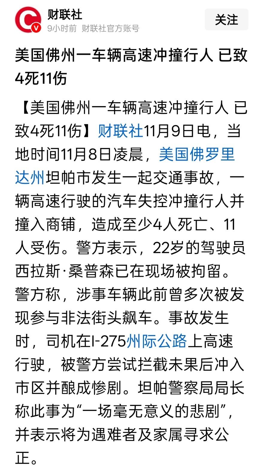 美国佛州一车辆高速冲撞行人,已致4死11伤