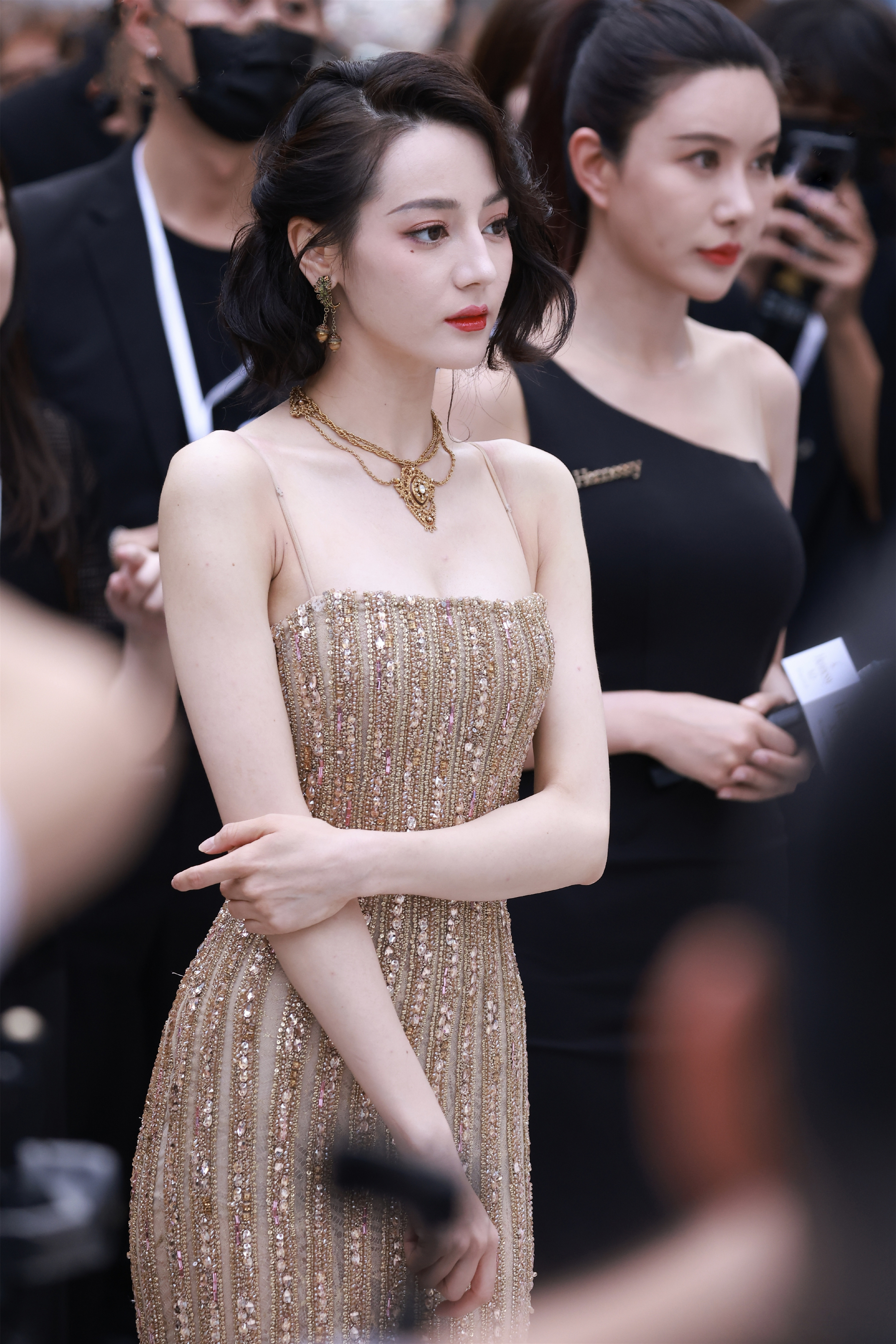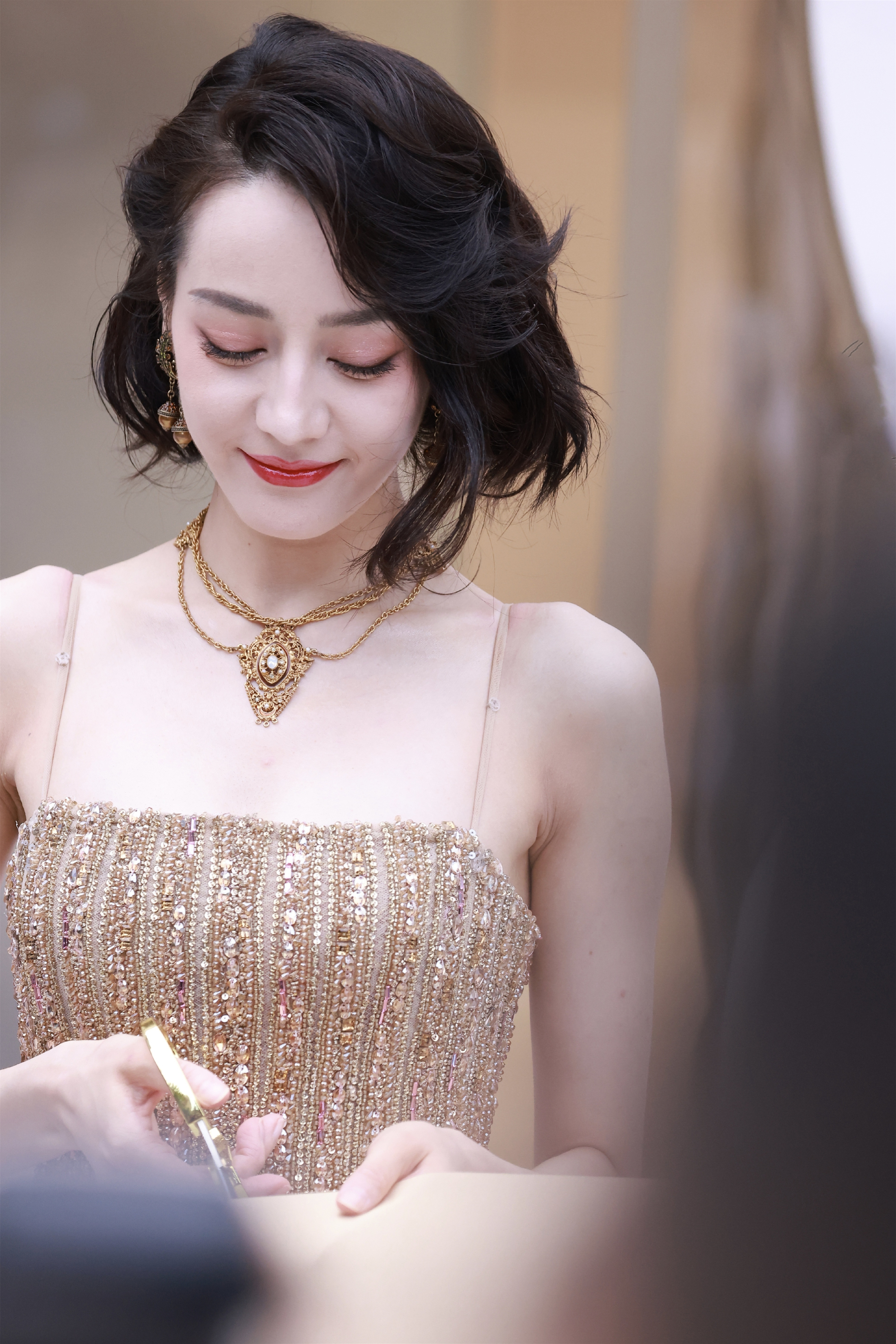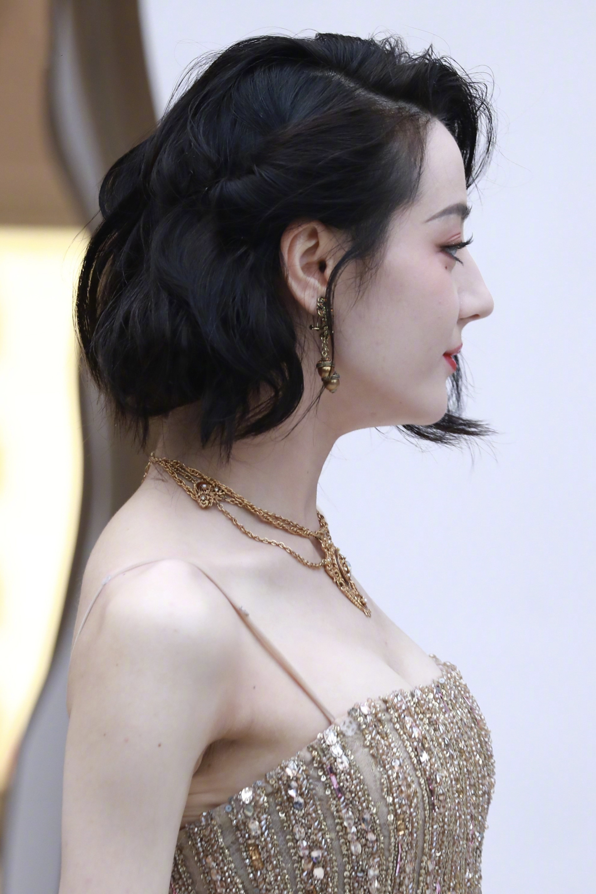 迪丽热巴,短发金色吊带裙,眼窝的美人痣真好看
