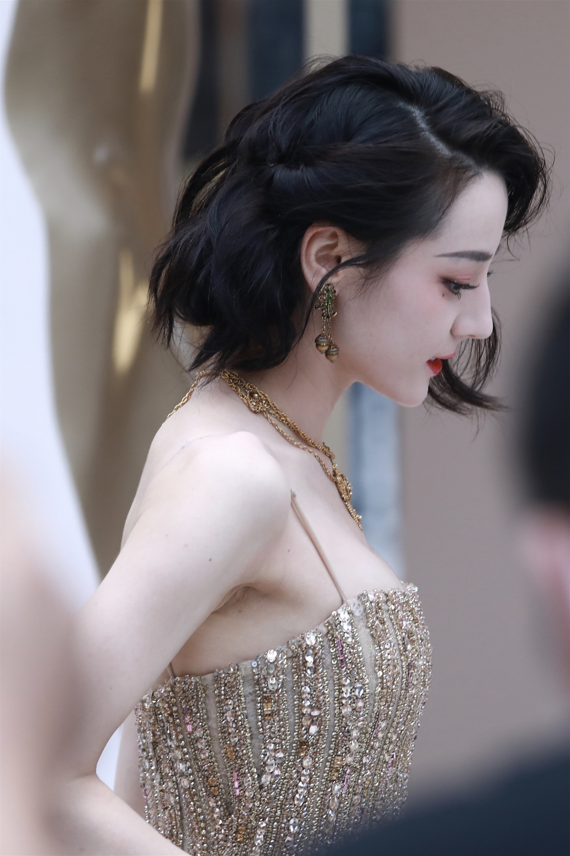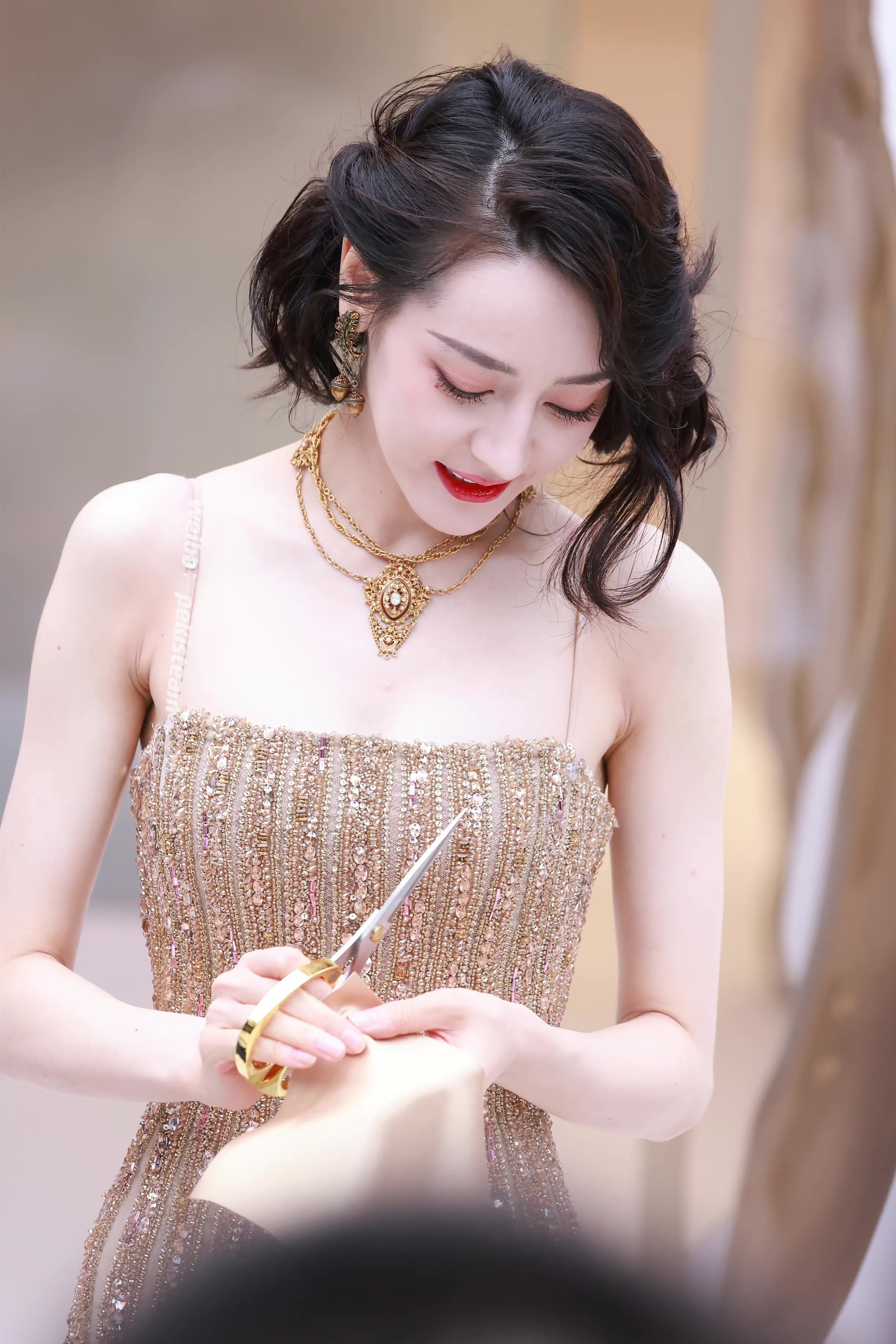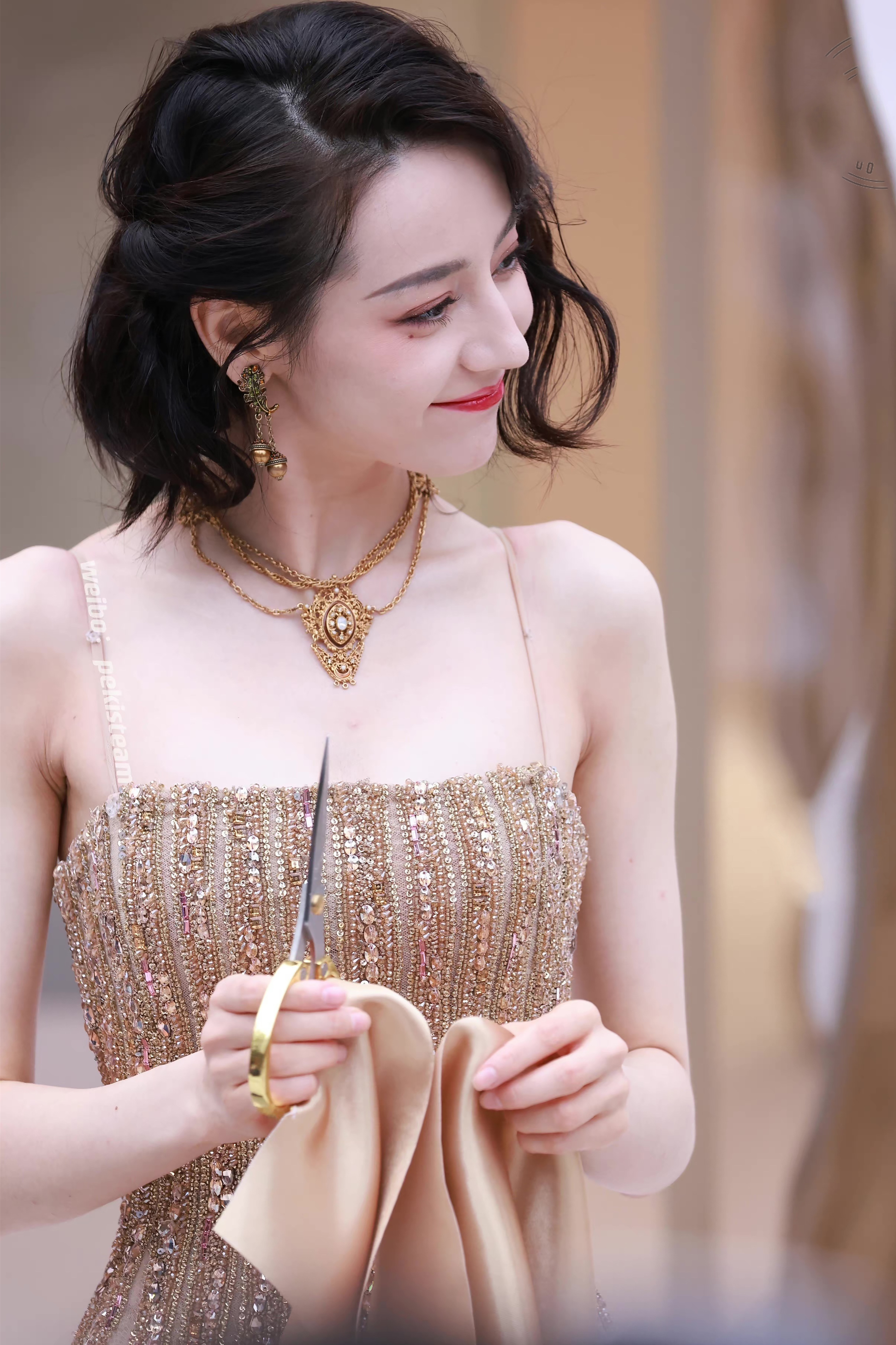 迪丽热巴,短发金色吊带裙,眼窝的美人痣真好看