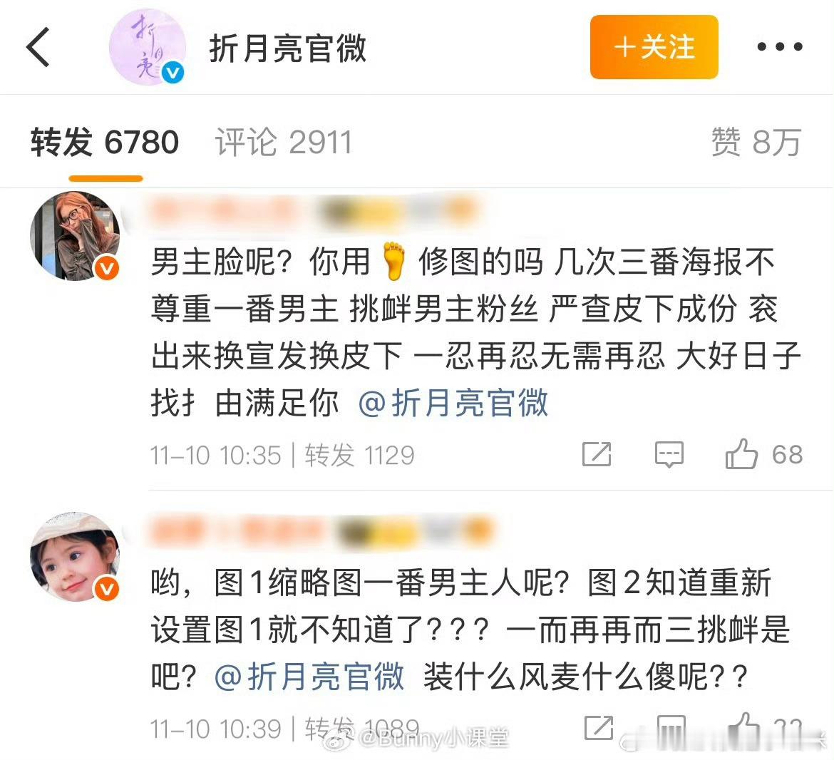 感觉粉丝都是计算器投胎,超绝算计自担得失[笑cry]折月亮官微公布最新海报,一开始男主林一粉丝不满意说预览图林一出画了,官微迅速调整,结果女主卢昱晓粉丝又说预览图里卢昱晓被挡脸了……官博再次调整