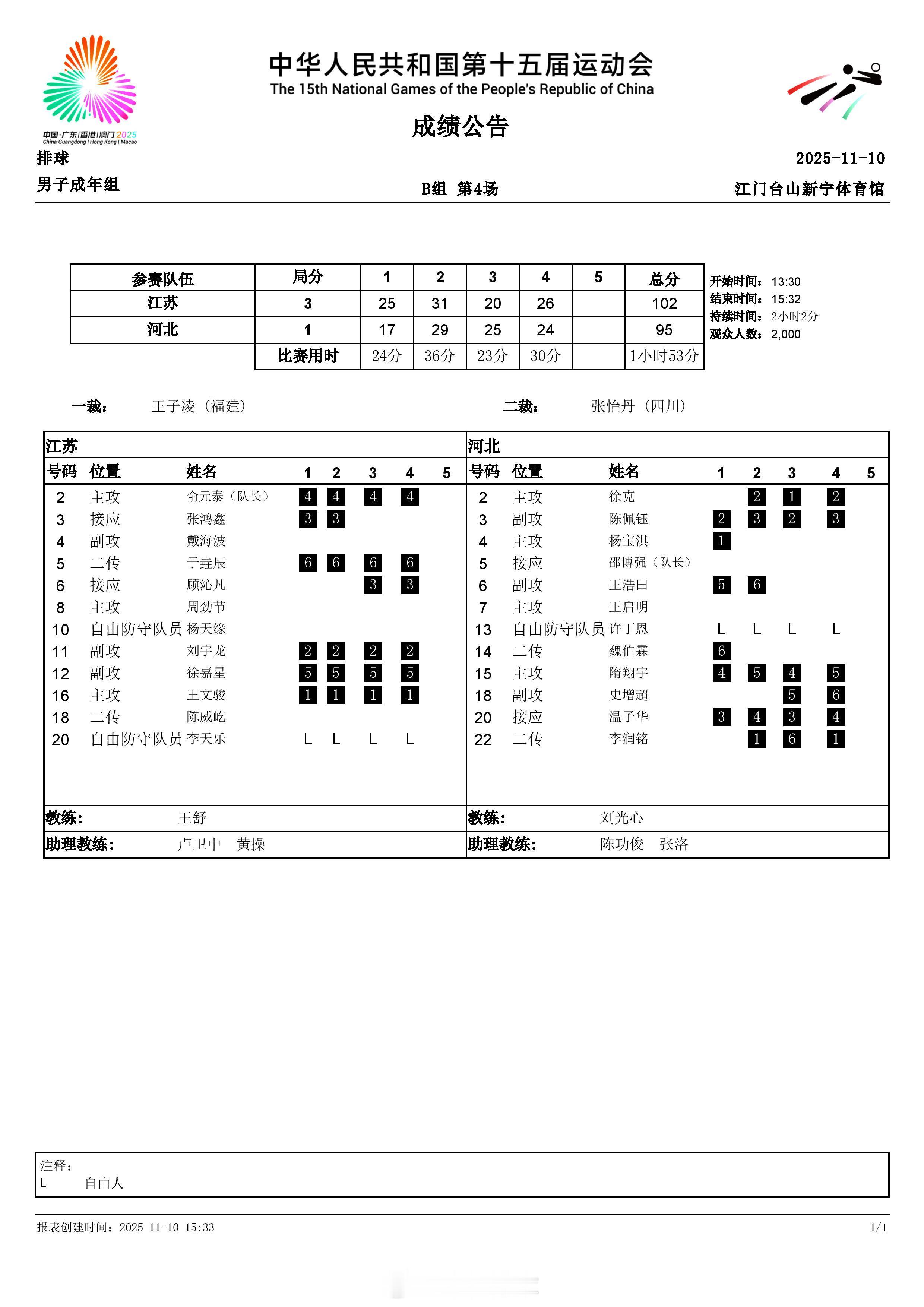 第十五届全运会 男排小组赛,11月10日下午,A组的浙江男排3-1福建男排,B组的江苏男排3-1河北男排。