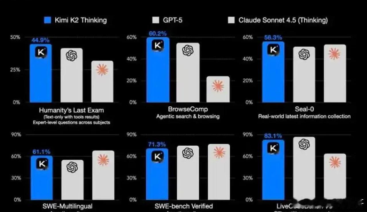 不到一年时间,中国的大模型(Kimi K2 Thinking)就完成了对世界顶级模型(GPT5和Claude Sonnet4.5)的超越!