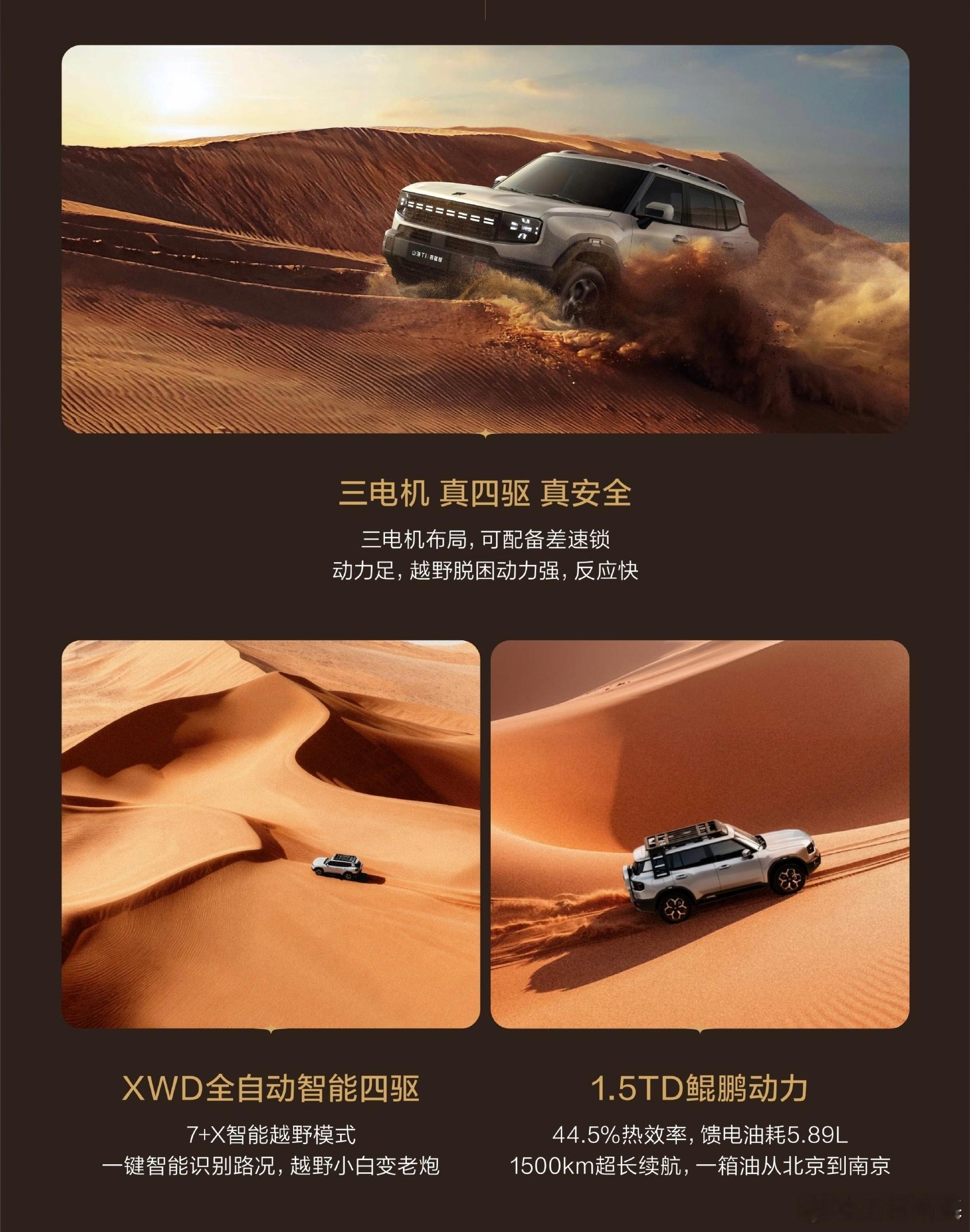 然后一搜“三电机”这个关键词弹出来靠前的都是捷途山海T1四驱版的内容,当时我就想这个价位的车,不应该用三电机吧?仔细看了下,这车是P1+P3+P4结构的。对于我感觉这种插混四驱在宣传中强调自己是三电机很不合适,有点儿鸡贼了。