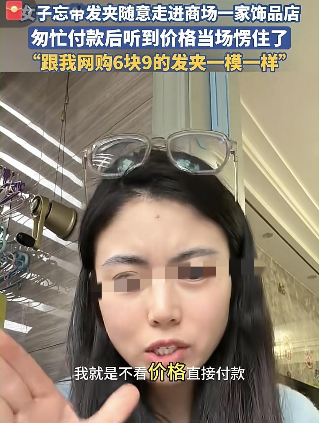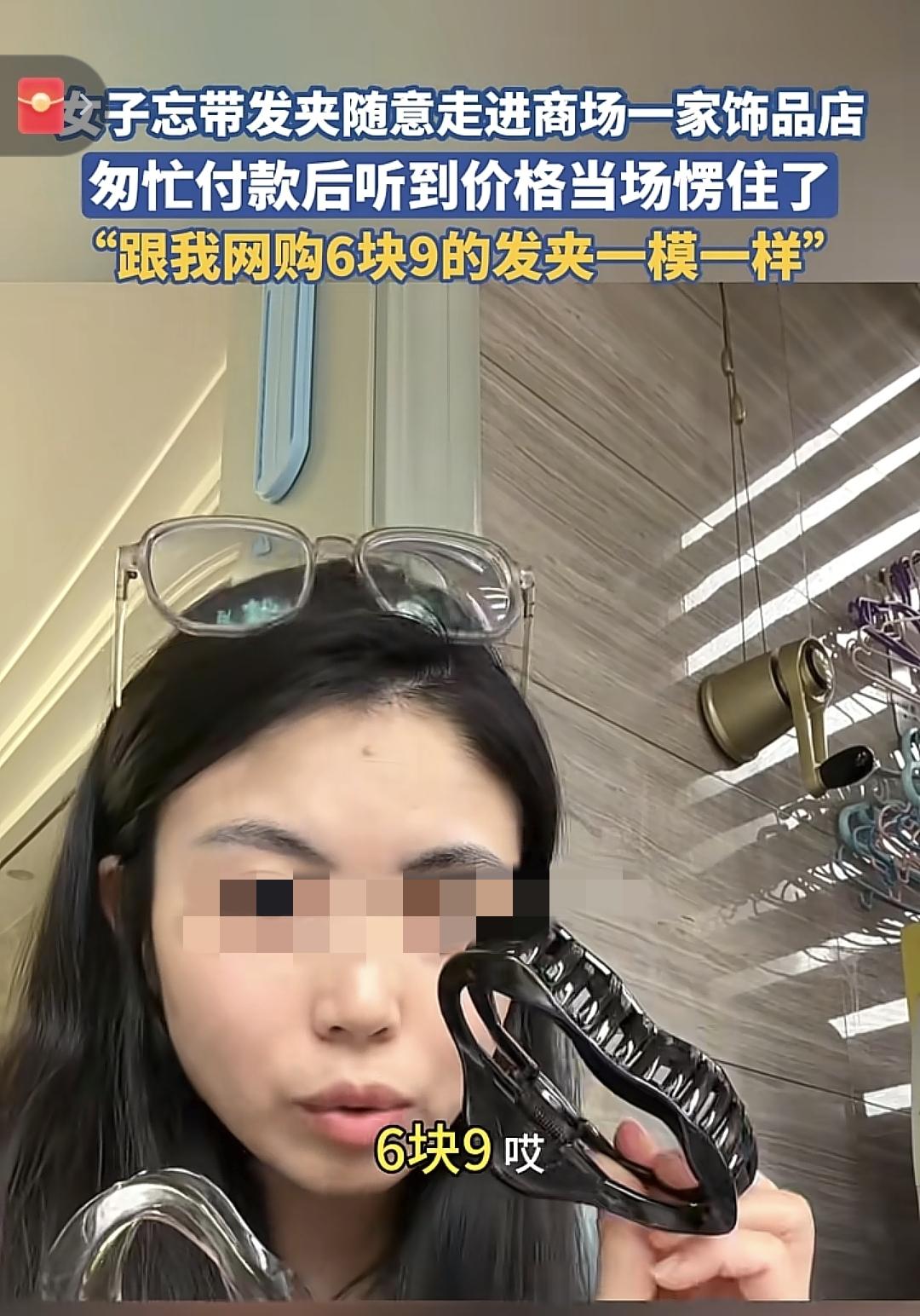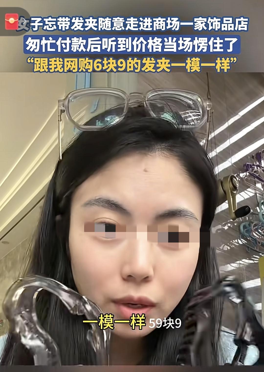 女子商家遇发夹“刺客”,一个普通塑料发夹59.9元,而她之前在拼多多上买了一个外形一样的只要6.9,除了颜色不同,真看不出有哪里不一样了,就这卖这么贵是这位美女实在没想到的! 美女发视频的时候说“现在线下实体店不好做,都被线上垄断了,这能不垄断吗”? 明明9.9能买到的快乐,最后非要花59.9买一个教训,这总结太到位了! 所以实体店真的不要喊生意不好做了,价格这么贵怎么去消费啊 还有好多朋友在评论区说“给我女儿买袜子,商场里的店,3双袜子86” “我买一个铜合金的耳钉,我想网上19.9元,我想着这里39.9顶破天了,结果一付账,129元” “被胶枪烫到了 一个烫伤油我以为十几二十块结果48 还是硬着头皮买下来了” 这视频一发出,感同身受的人实在太多了,大家都在评论区诉说自己的经历 有网友说“你不问价格直接付款就这一点就值59”,哈哈,说的真扎心! 说实话,这么贵的发夹就算付款了,我也会退掉放回去,不是买不起是我觉得它不值这个价格,你们会买吗?
