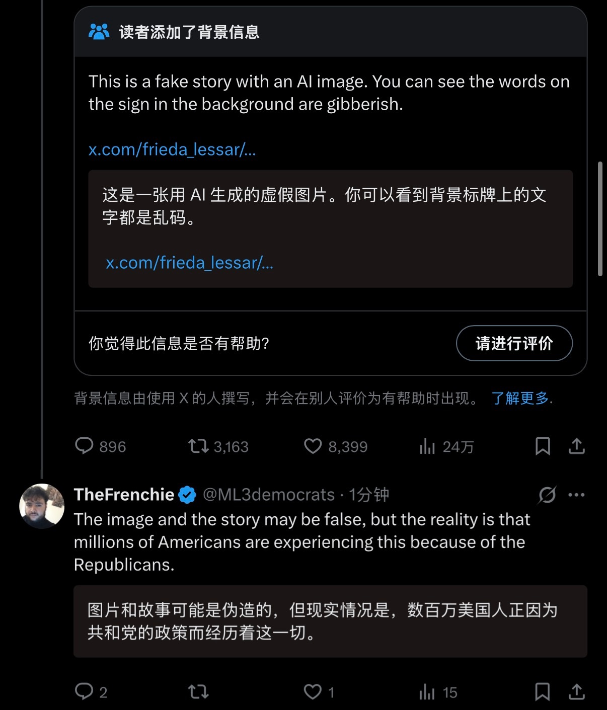 🔻但是,这个美国网民说:“图片和故事可能是伪造的,但现实情况是,数百万美国人正因为共和党的政策而经历着这一切。”