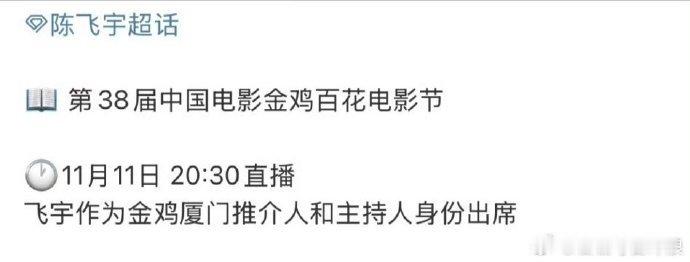 陈飞宇金鸡百花电影节主持人陈飞宇将担任金鸡百花电影节主持人 陈飞宇将以金鸡厦门推介人和主持人身份出席第38届中国电影金鸡百花电影节!