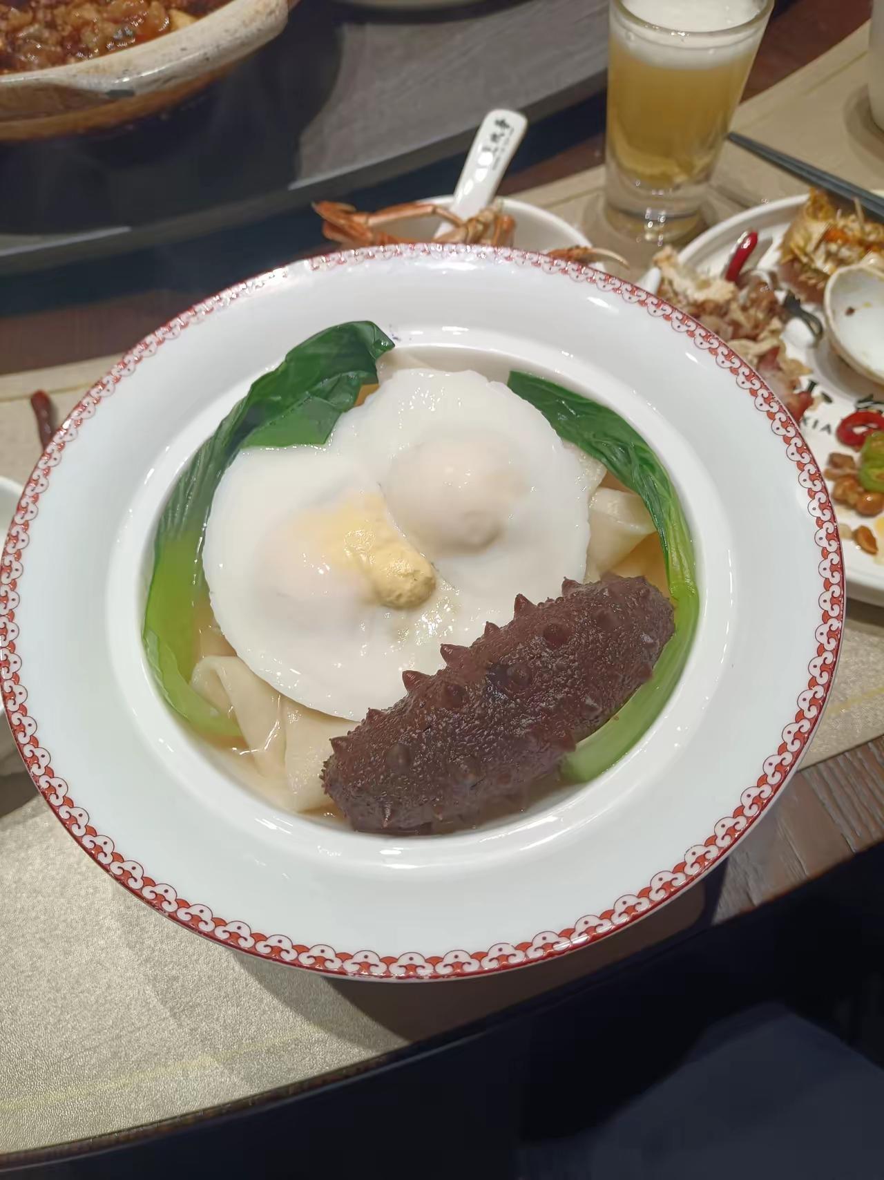 有趣的“灵魂”? 哥儿几个小聚,高兴之余拉起了强子该过生日了吧?结果就是今儿,哈哈哈,择日不如撞日,有缘人,哥儿几个就给强子过个庆生吧?长寿面不可缺,叫过来服务员,说明情况,嗨!人家东家还挺大方,也更有情趣,免费送了,一会儿,服务员又回来了,还郑重其事问了句:肯定是男的吧!得儿:什么意思?不一会见了分晓,长寿面来喽!就是开头见到的那一碗,关键是里面的荷包蛋和海参,摆设新颖,价格也不便宜吧? 啥意思呢?你是知道滴!