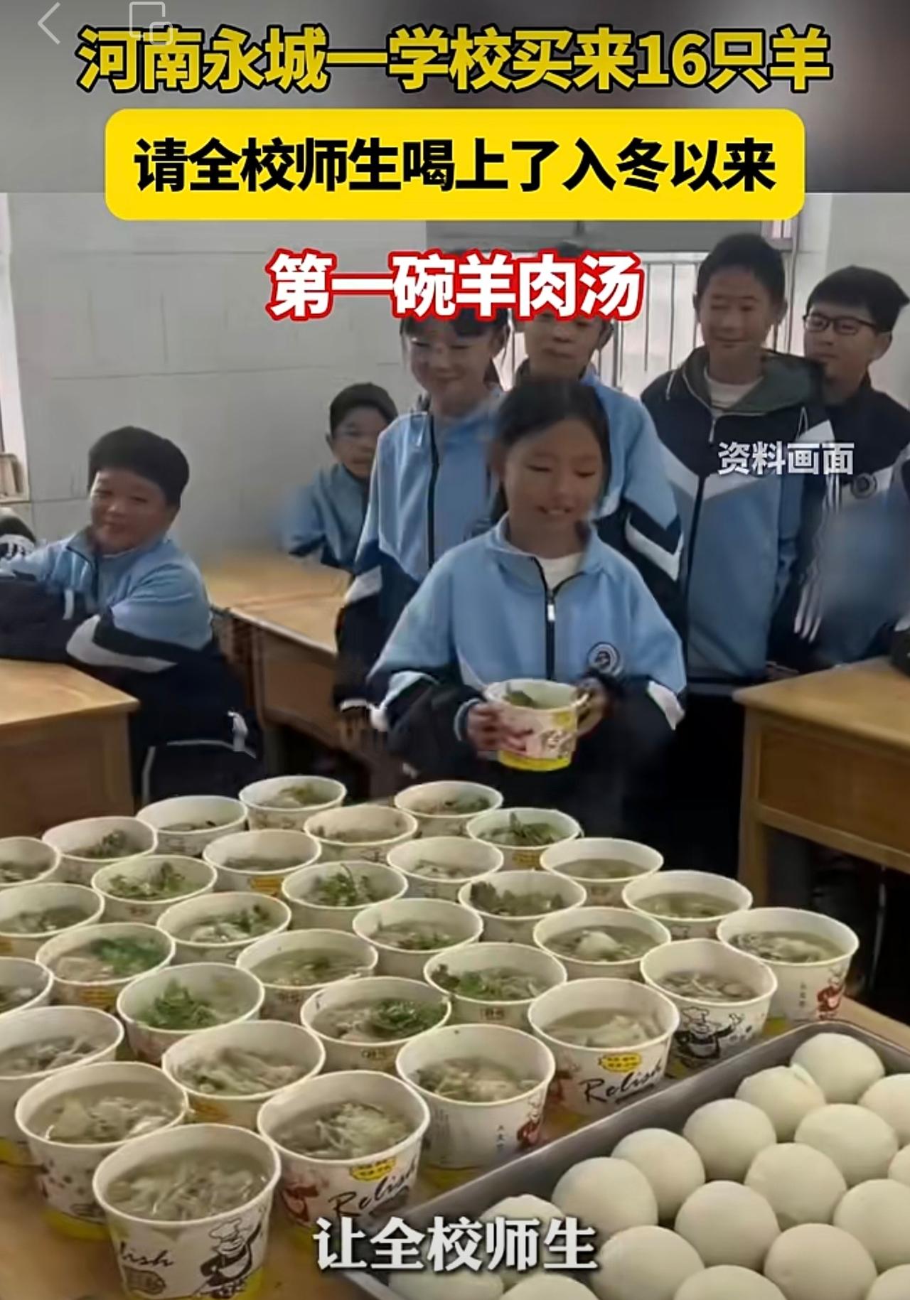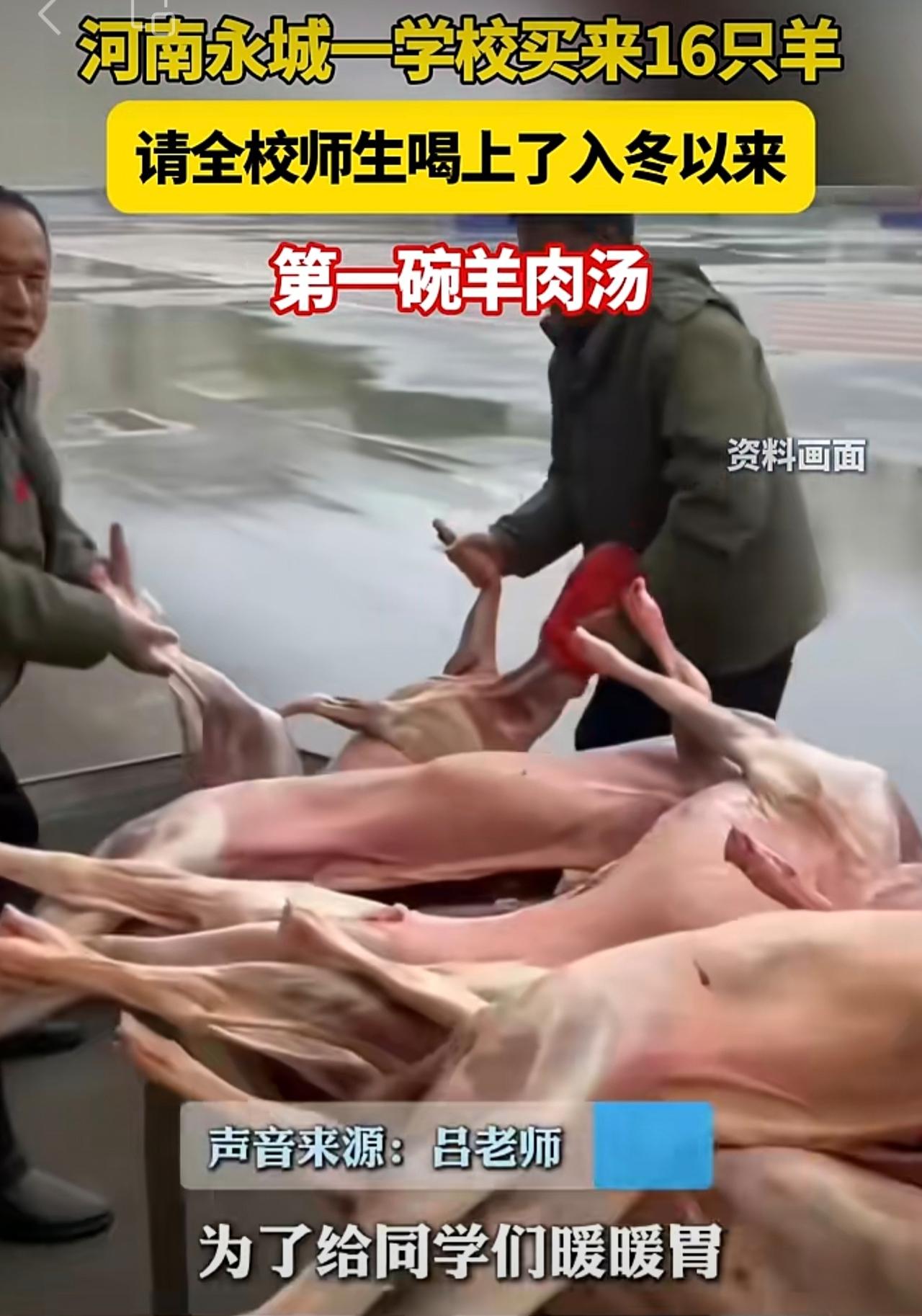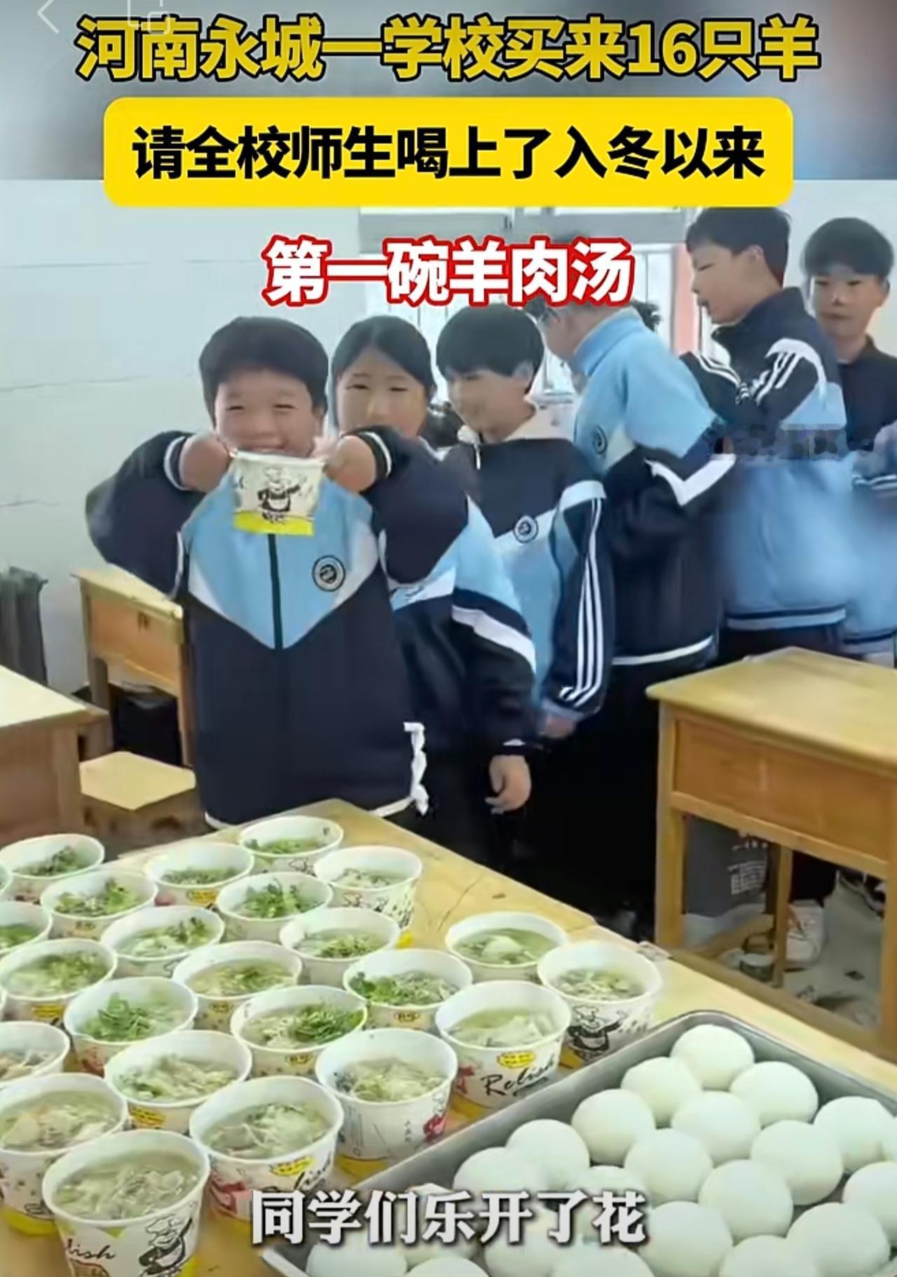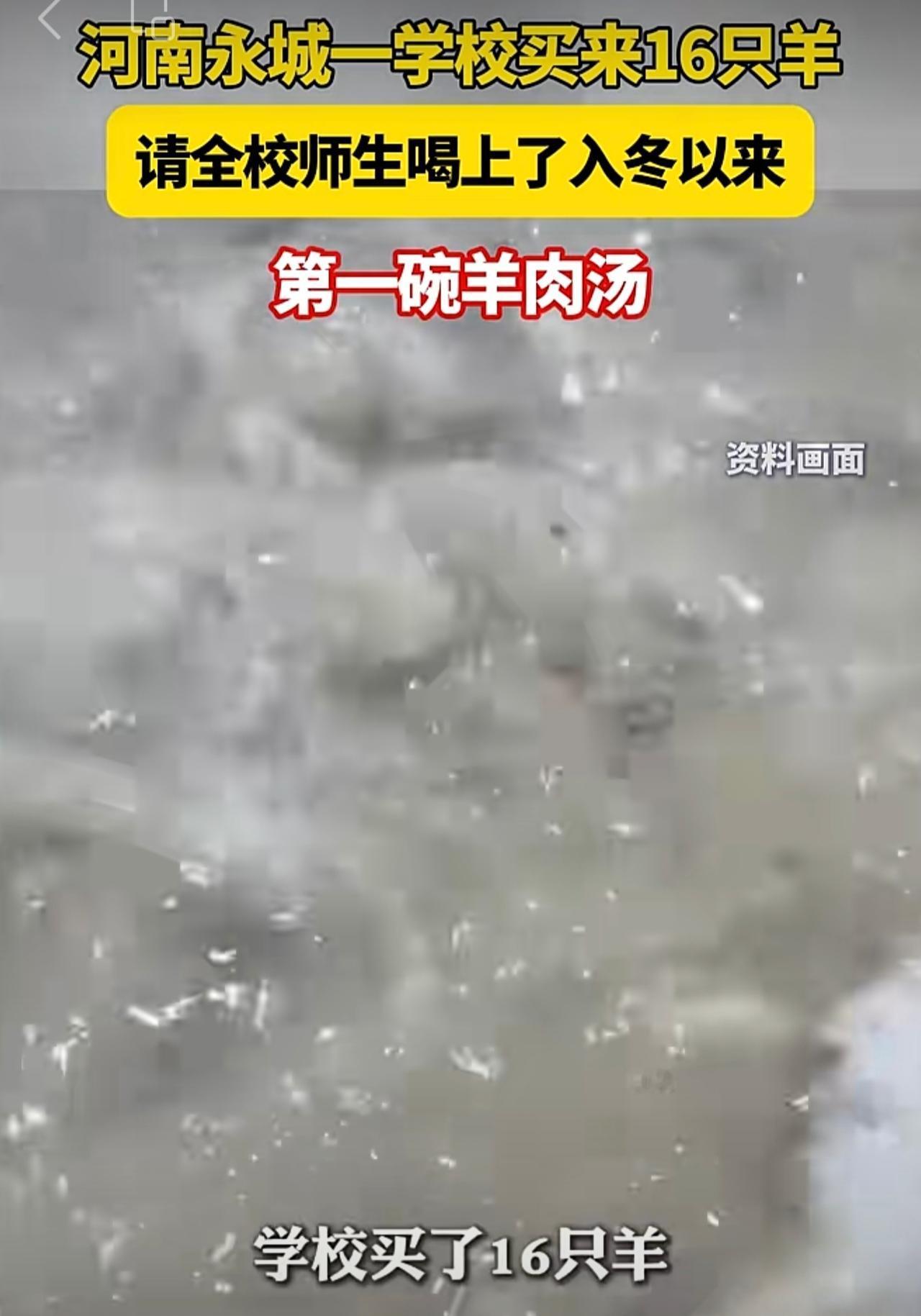 河南永城一学校买来16只羊,请全校师生喝上了入冬以来的第一碗羊肉汤。
