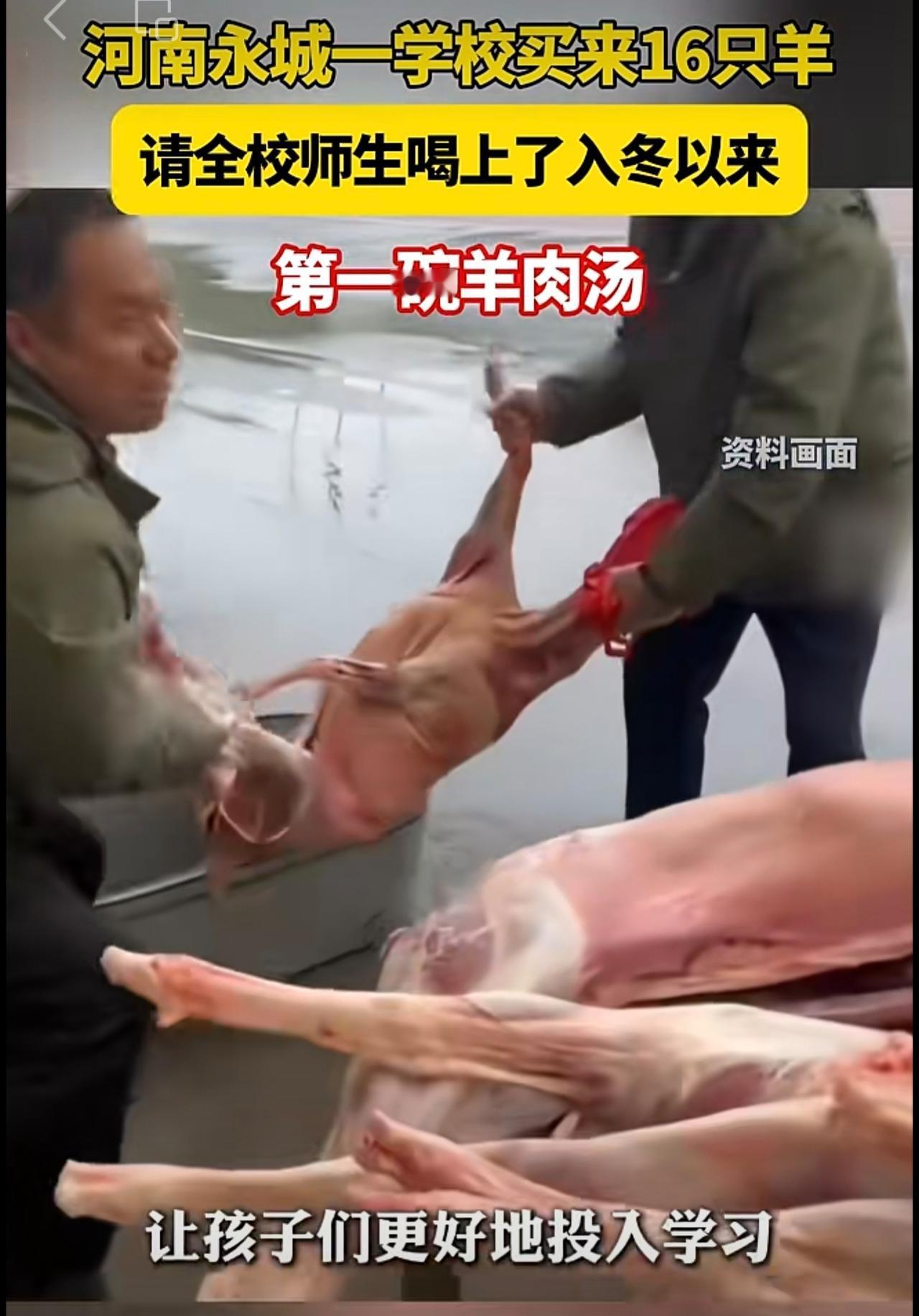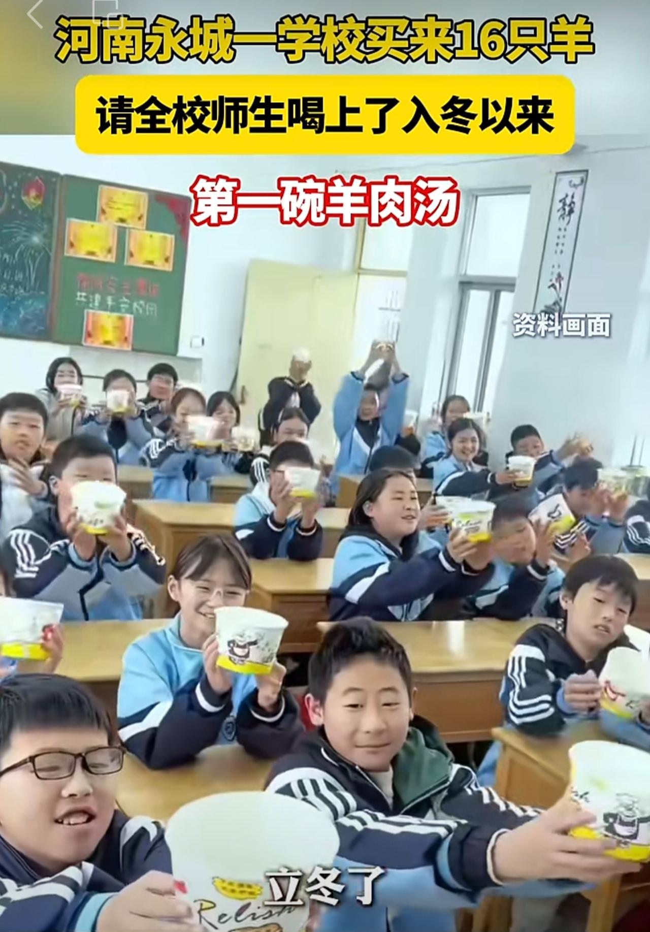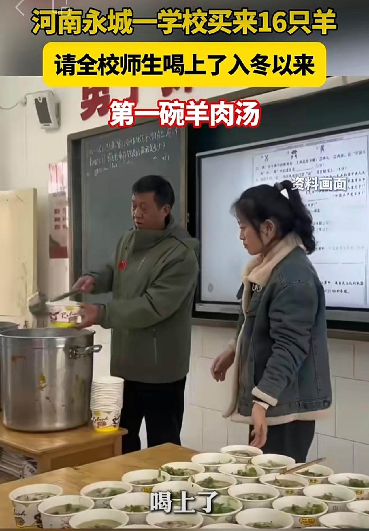 河南永城一学校买来16只羊,请全校师生喝上了入冬以来的第一碗羊肉汤。