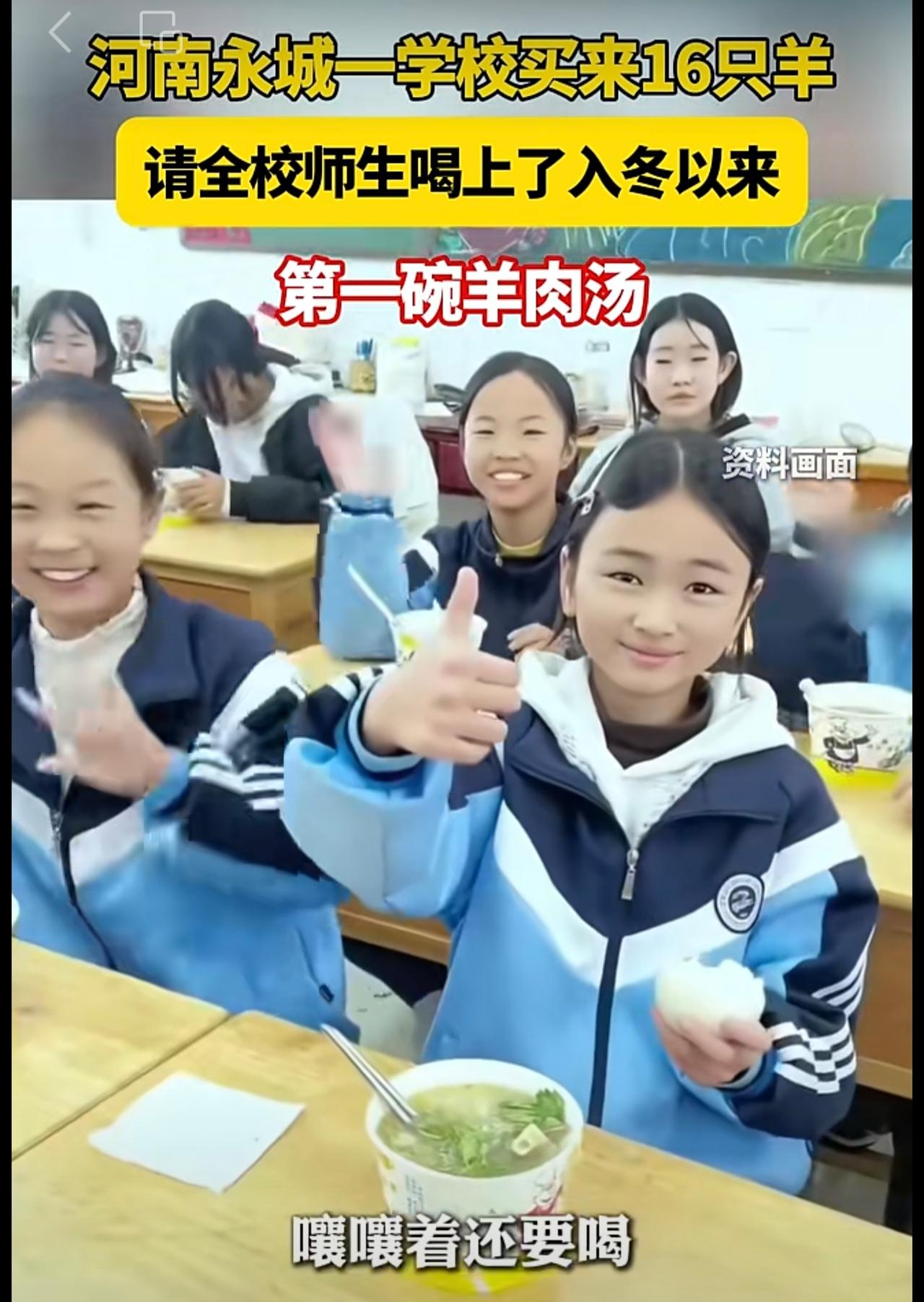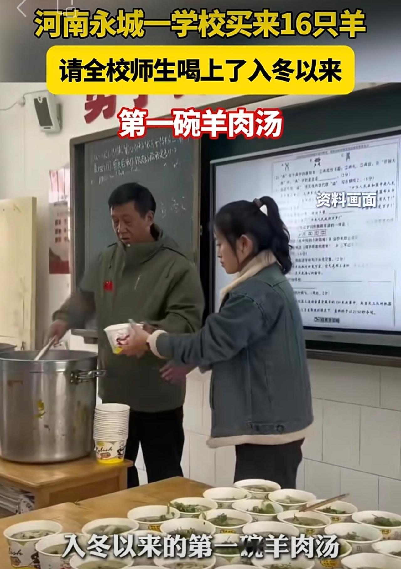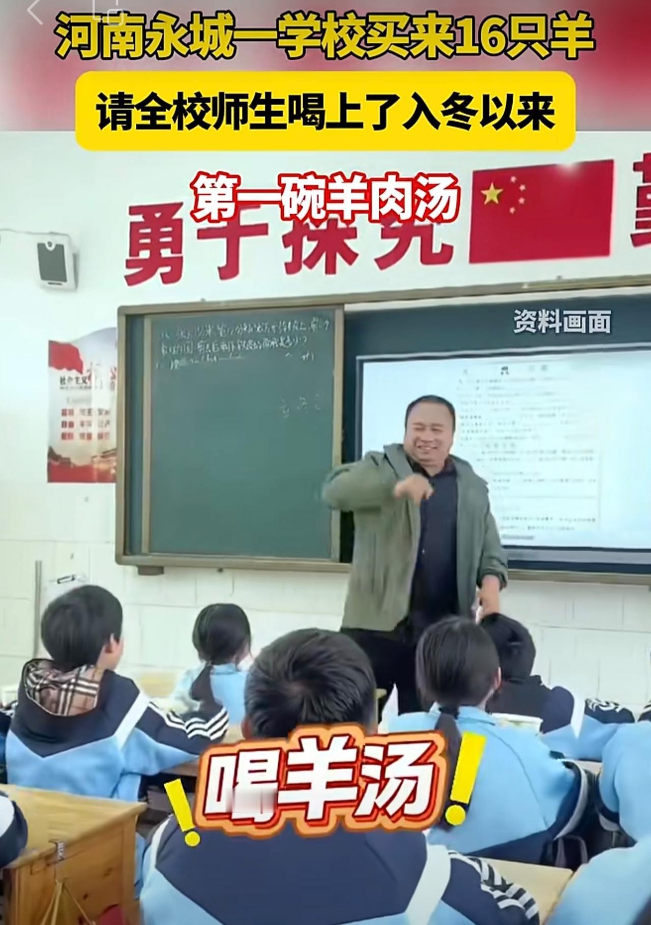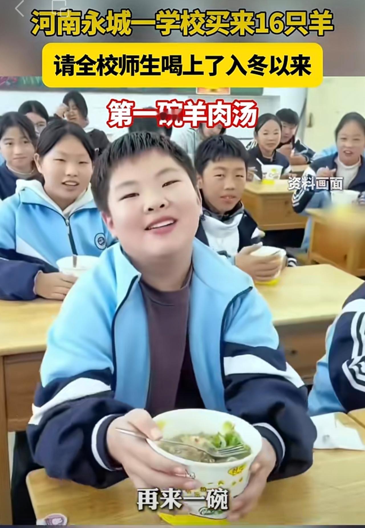 河南永城一学校买来16只羊,请全校师生喝上了入冬以来的第一碗羊肉汤。