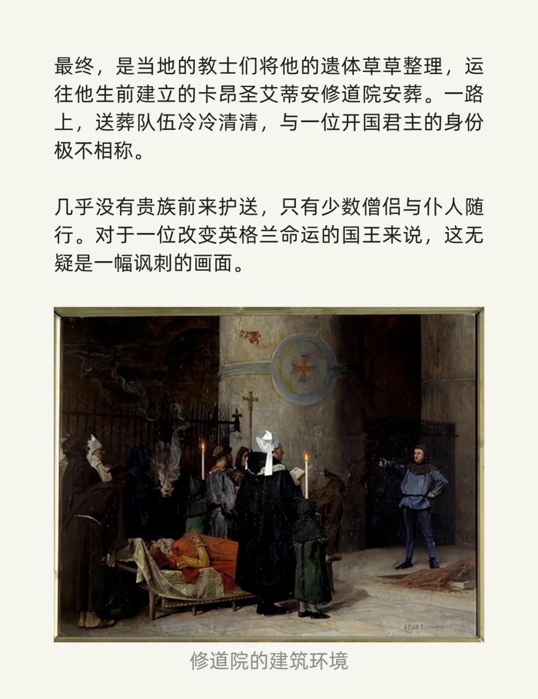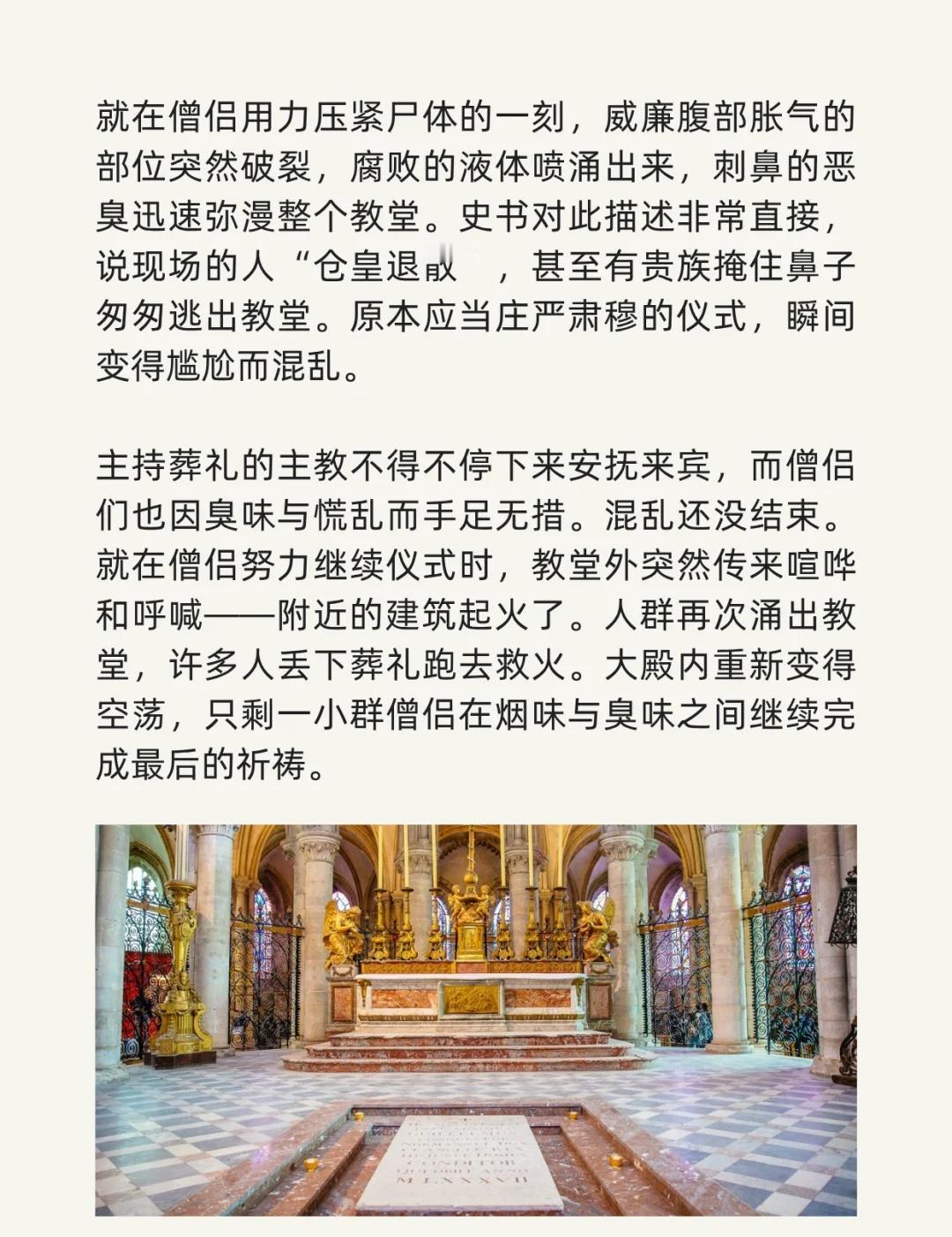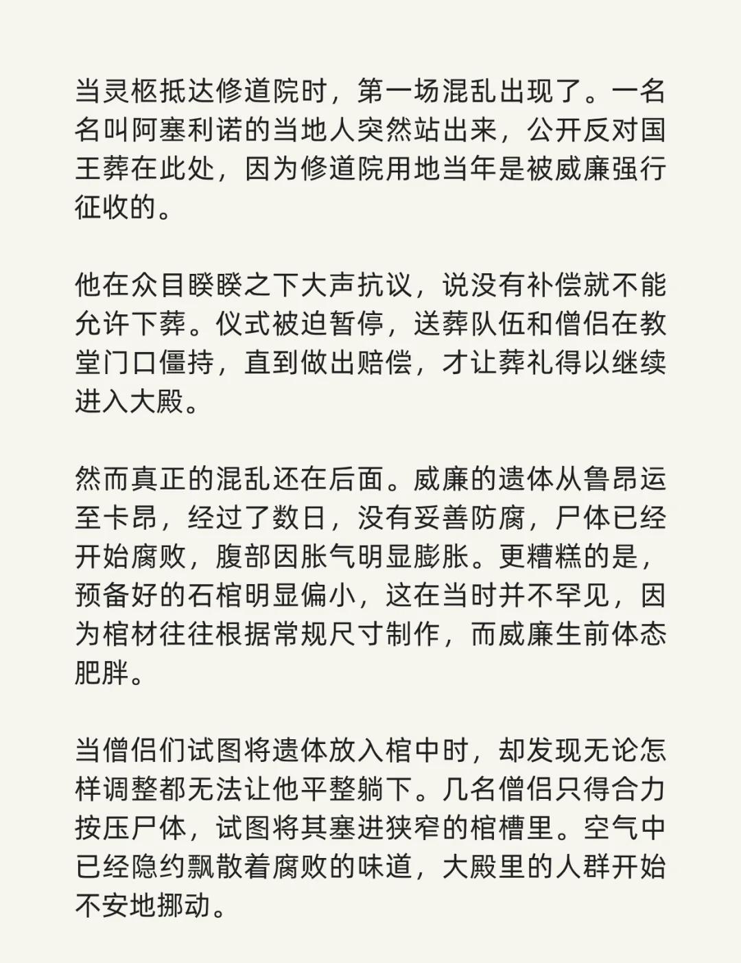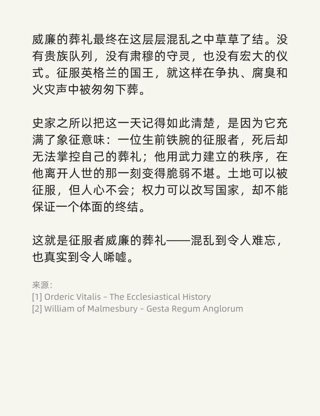 尸体当场爆裂!英国国王葬礼成世纪闹剧? 改变英格兰历史的“征服者”威廉,其1087年的葬礼并非预期的庄严盛典,而是一场充满荒诞与混乱的世纪闹剧。 威廉死后,其侍从并未哀悼,而是忙于抢夺财物,导致遗体无人看管。在运往卡昂修道院下葬时,葬礼先后遭遇三重混乱:首先,当地居民抗议墓地是威廉强征所得,迫使葬礼中断并支付赔偿;其次,因遗体腐败膨胀且石棺太小,在强行入殓时尸体腹部爆裂,恶臭导致众人逃散;最后,教堂外突发火灾,人群再次溃散。 最终,这位铁腕君主的葬礼在争执、腐臭和火灾中草草收场。史家认为,这场极具象征意义的混乱表明:生前用武力建立的秩序在他死后瞬间瓦解,权力虽可征服土地与国家,却无法保证一个体面的终结。 世界历史 历史故事 历史冷知识 英国国王