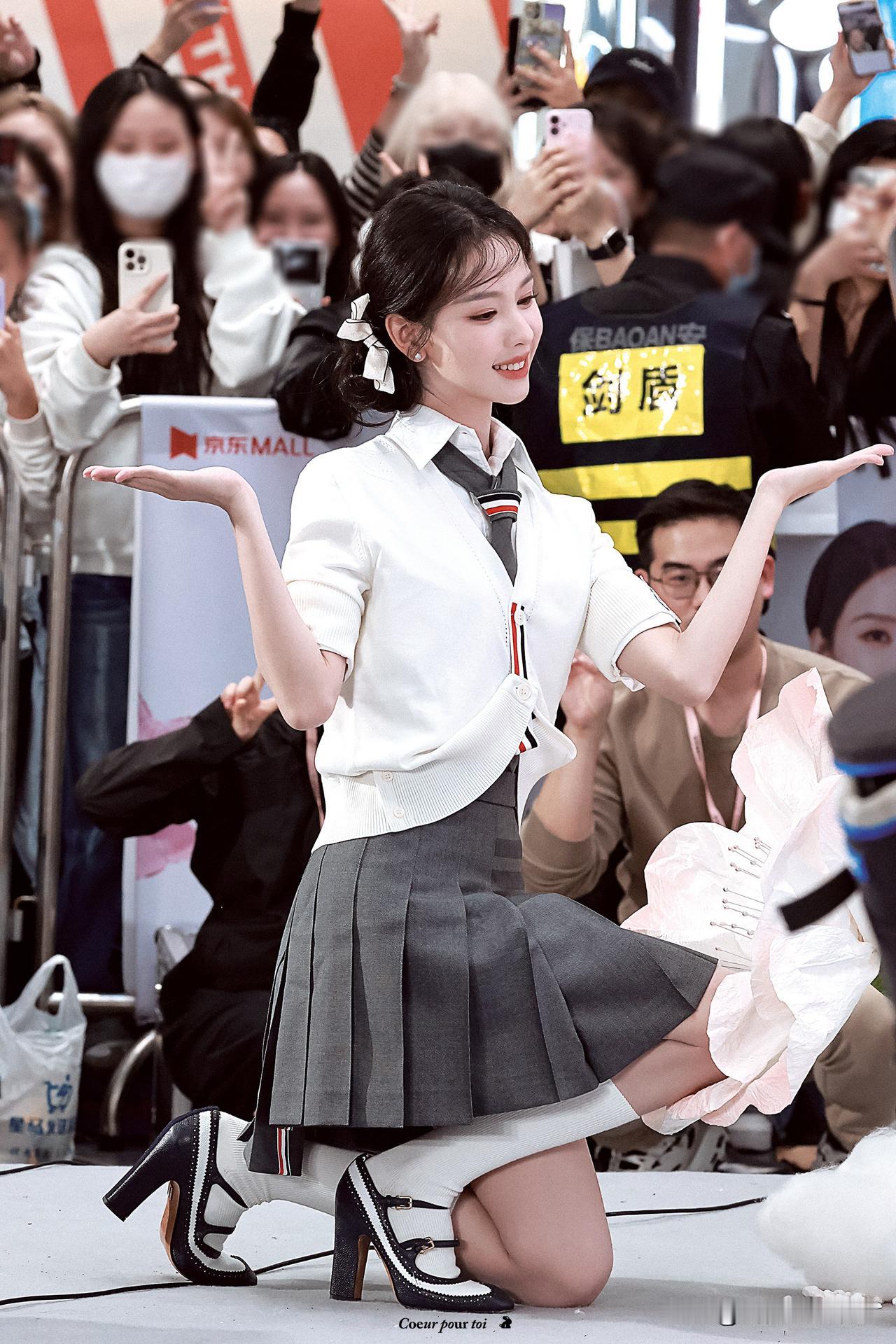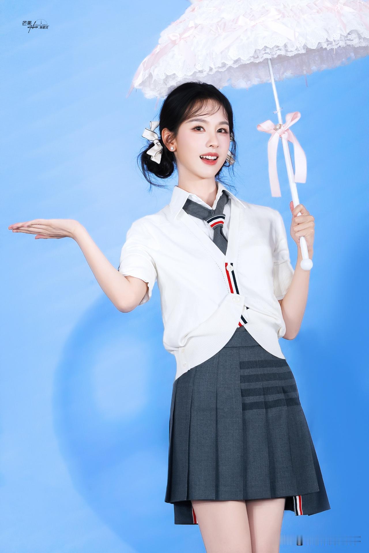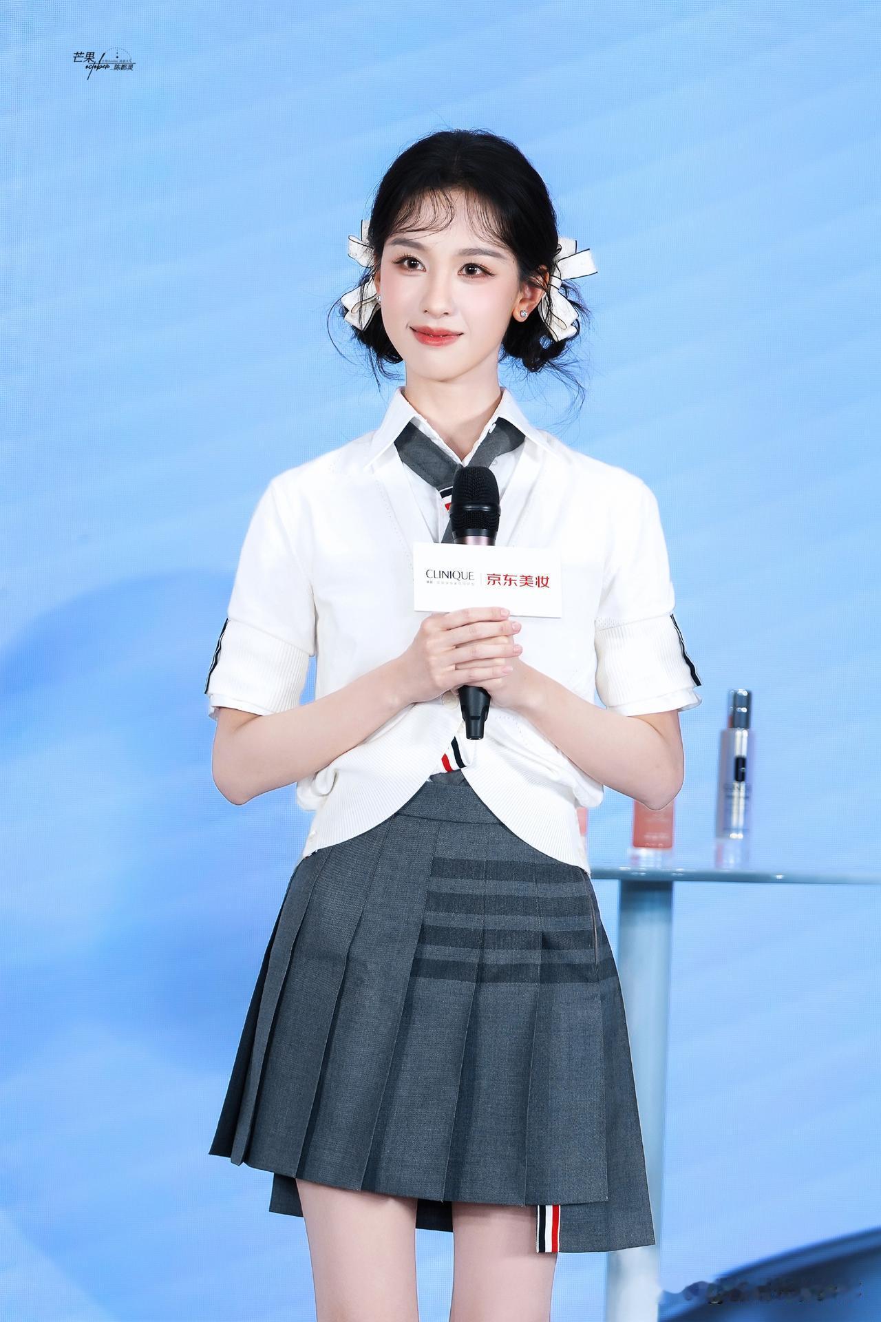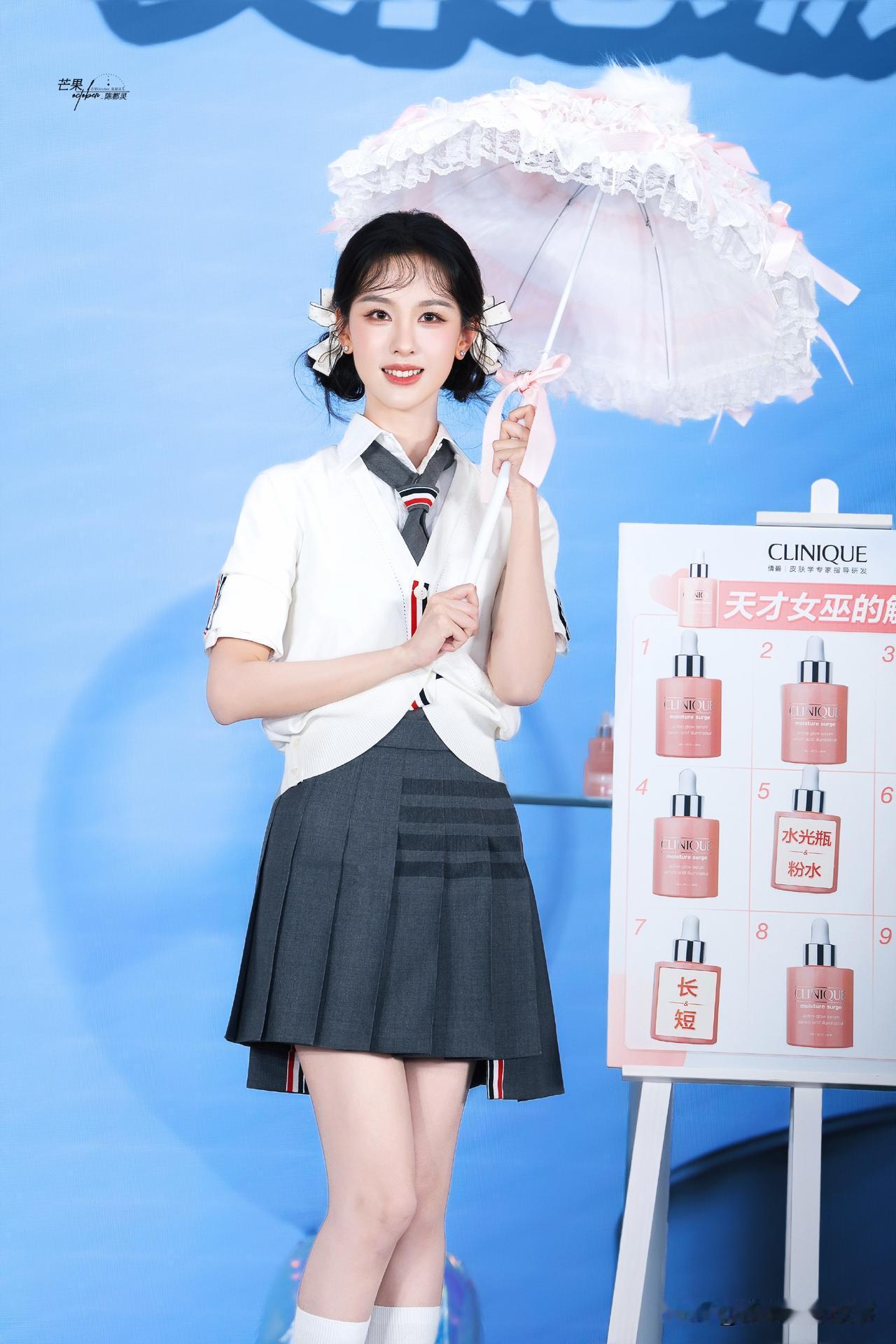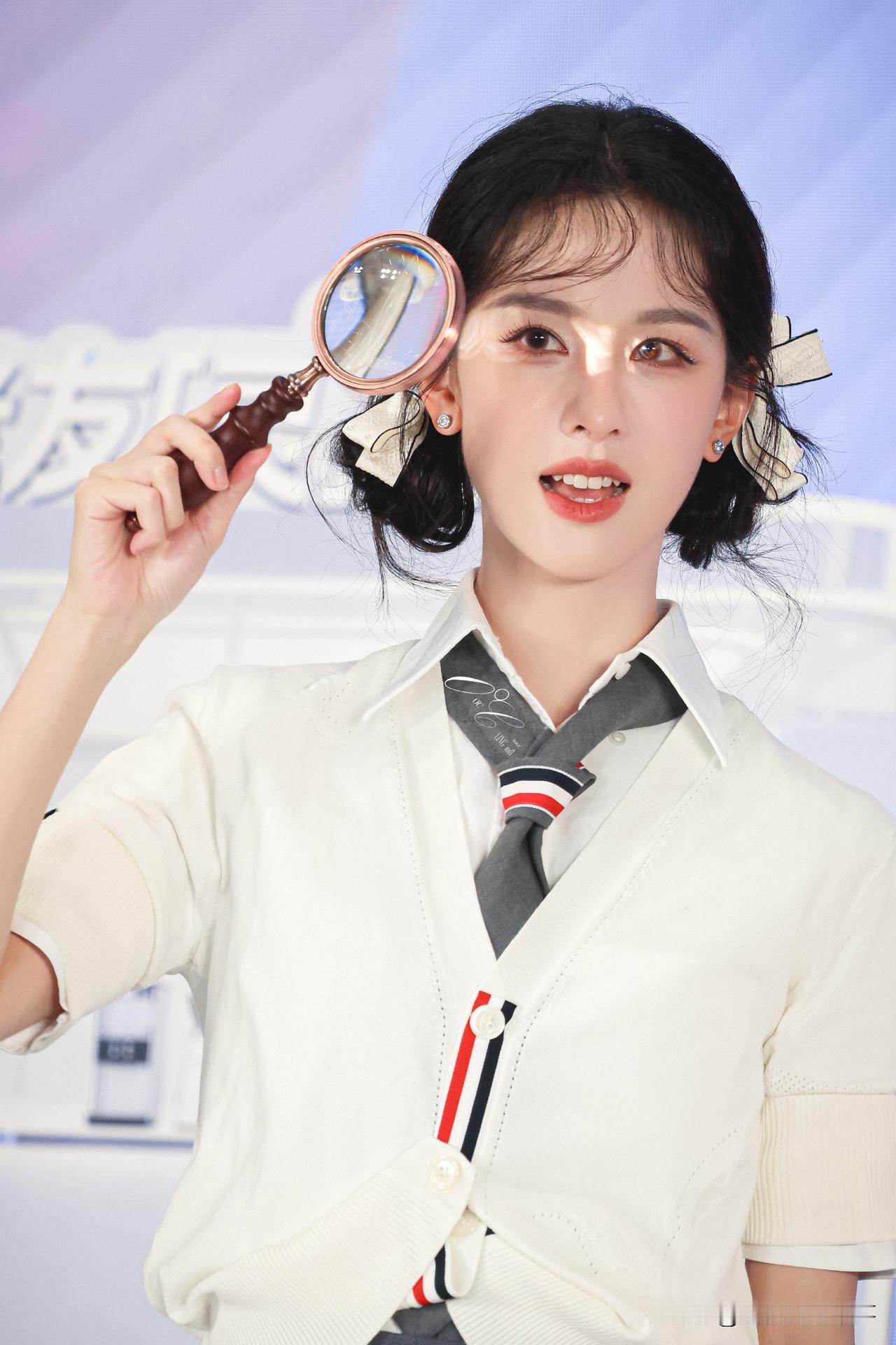 陈都灵这是什么“青春具象化”现场啊! 白衫叠搭灰裙,领带藏着红黑细条,发间蝴蝶结随笑轻晃,连举话筒的指尖都裹着清甜。拿放大镜时的灵动、撑蕾丝伞的软萌,或是屈膝互动的明媚,每帧都像把“青春”揉进了眉眼。 甜而不腻的学院风,配上她自带的柔雾感,直接把“校园白月光”焊在了镜头里——这哪是活动造型,明明是青春剧女主本人! 陈都灵学院风造型 青春感天花板