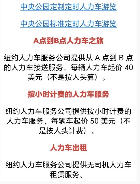 纽约中央公园人力车游览服务,那叫一个地道。 美国纽约人力车服务公司提供中央公园人力车游览服务,每辆人力车起价40 美元(不是按人头算)。按小时计费的人力车服务,每辆车起价 50 美元(不是按人头计费)。也就是说起步价354块, 网友:嚯,老纽约祥子,内叫一个地道[大笑] 据了解,纽约出租车起步价2.5美元(0.2英里内),之后每0.2英里或等待2分钟加收40美分。