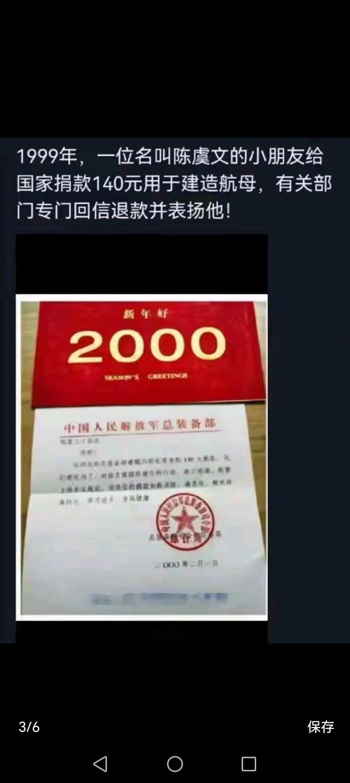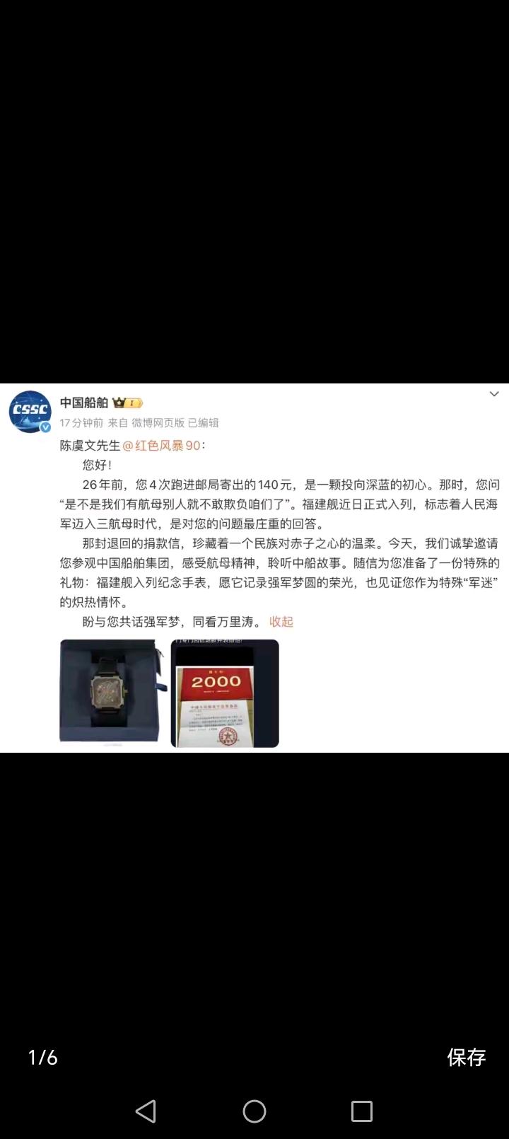 小朋友1999年捐款140元给国家造航母,中国船舶官方回应:邀请其参观,并附赠福建舰入列纪念手表 这件事情真是令人感到温暖又感动!一位小朋友在1999年仅仅用140元的捐款,表达了对国家航母建设的支持和祝福。多年来,他的善举得到了中国船舶官方的认可和回馈,邀请他参观航母,并赠送福建舰入列纪念手表,这不仅是一份荣誉,更是一份对少年爱国情怀的肯定。 这件事体现了几方面的深意: 小小善举,大大温暖:一名年幼的孩子用微薄的力量表达了对国家的热爱,这种纯真的爱国心令人感动,也激励更多人关注国家发展。 国家的认可与回馈:中国船舶官方的回应,体现了对普通民众支持的尊重和感激,也彰显了国家对青少年的关心和鼓励。 弘扬爱国精神:通过参观航母、赠送纪念手表的方式,让年轻一代更直观地了解国家的强大,激发他们的民族自豪感和责任感。 传递正能量:这件事传递出一个积极向上的价值观:无论年龄大小,每个人都可以为国家的建设贡献自己的一份力量,善意和支持会得到社会的认可和回报。 这也提醒我们,每一份善意都值得被珍惜和传递。正如那位小朋友的140元,虽不多,却蕴含着浓浓的爱国情怀;而中国船舶的回应,则让这份情感变得更加温暖和有意义。 愿我们都能像这位小朋友一样,用心去关心国家、关心社会,用行动去传递爱与希望!